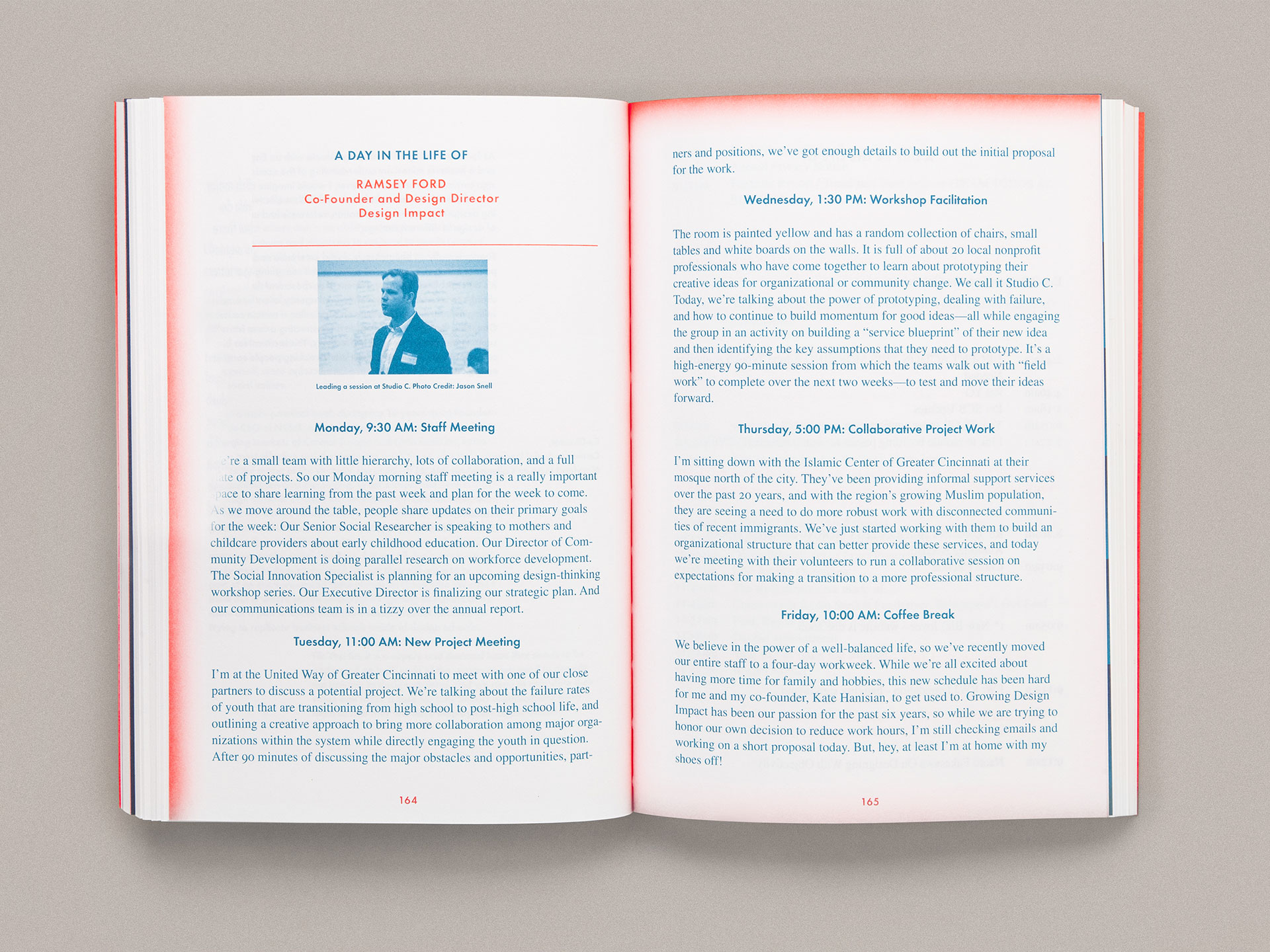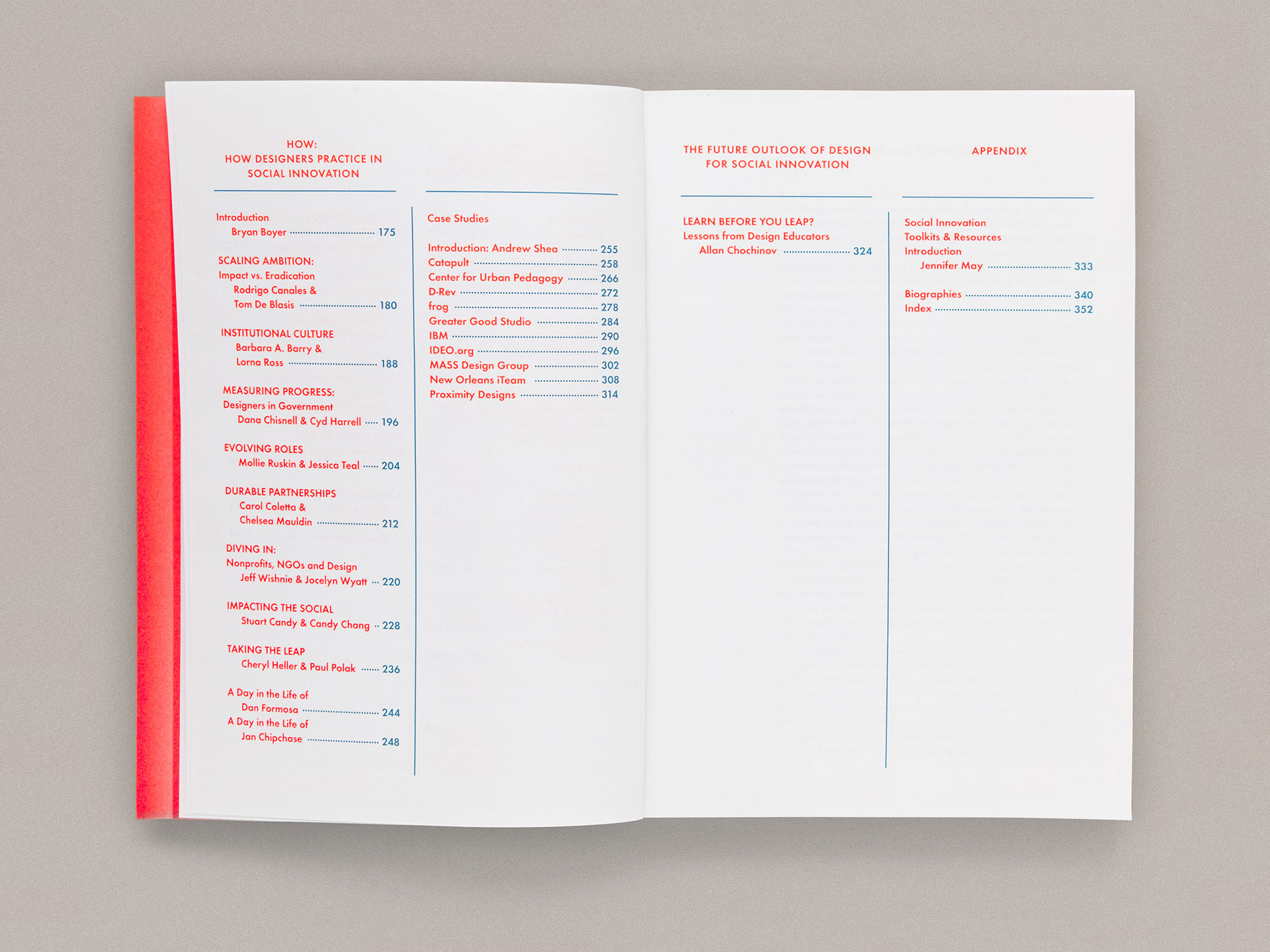 The book’s distinctive dialectic framework, presented through a series of informal dialogues interposed with first person essays, “day in the life” entries and case studies, addresses the spectrum of challenges and opportunities for designers building career pathways in social innovation, and for the organizations and institutions looking to support those careers. The interesting and unexpected pairings of perspectives in the dialogues push each other to uncover stimulating insights and debatable ideas that are at times provocative, at times reflective, at times informative but always engaging and accessible.