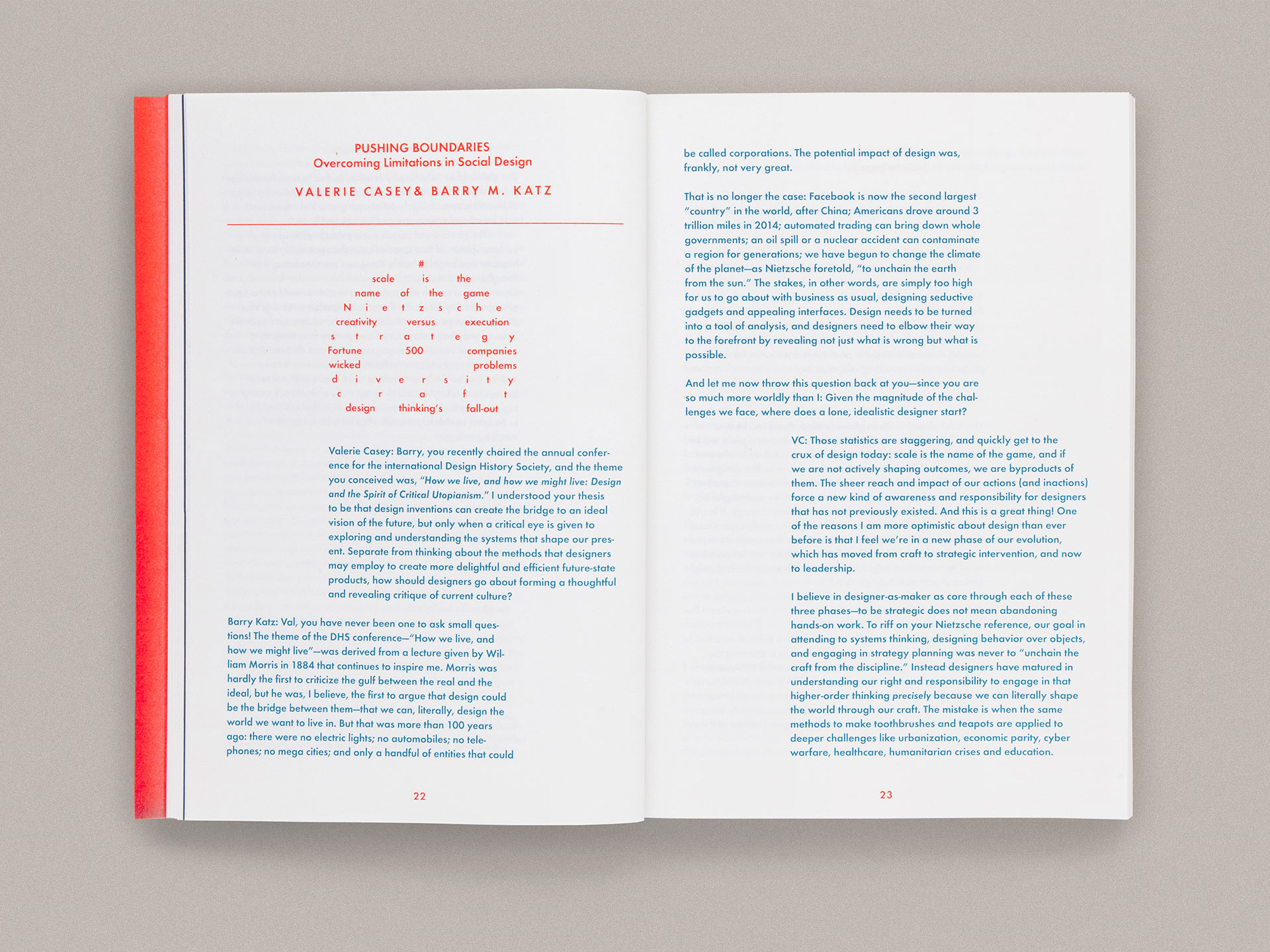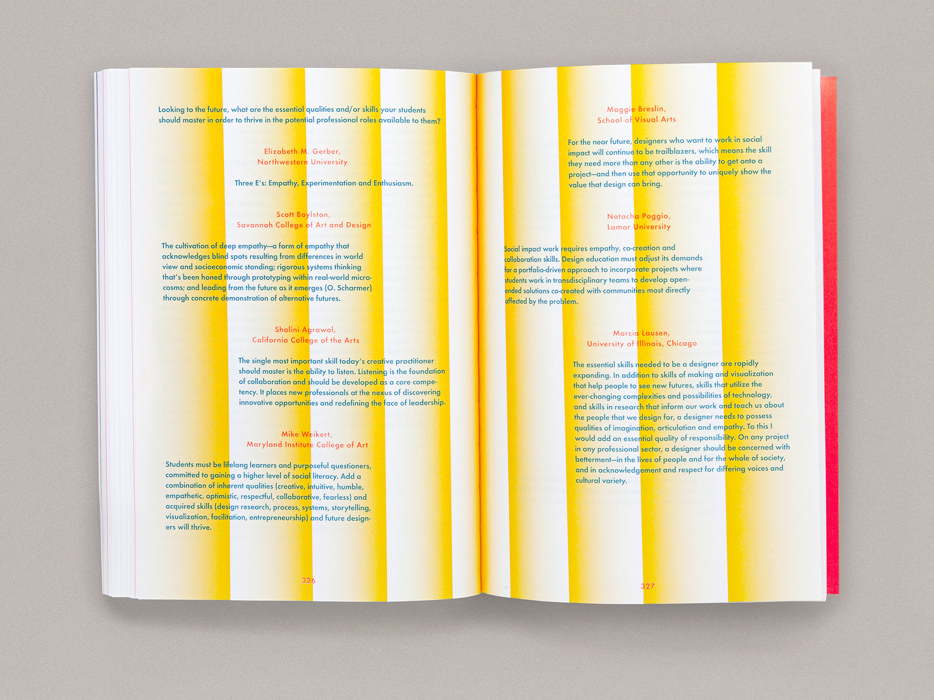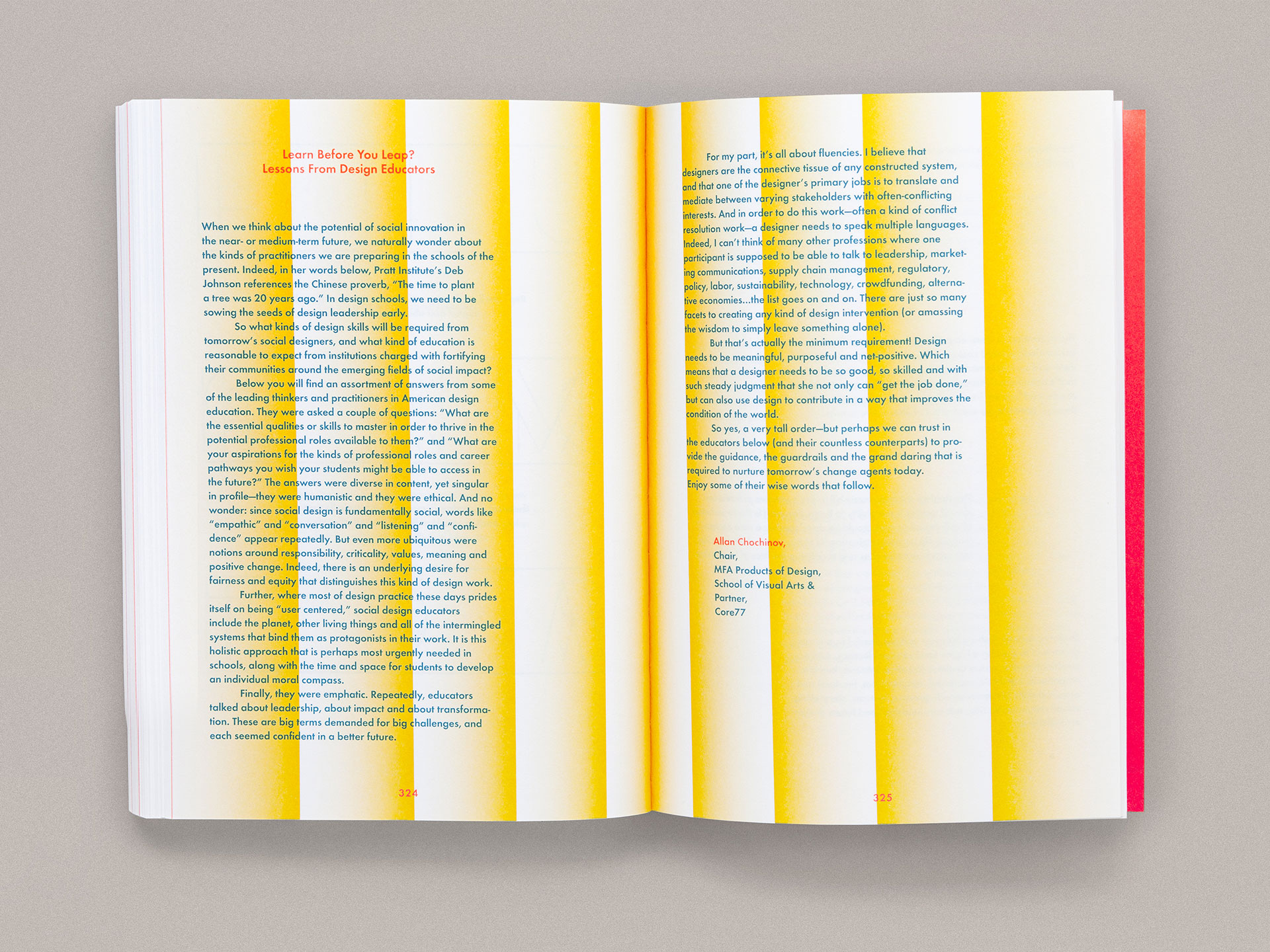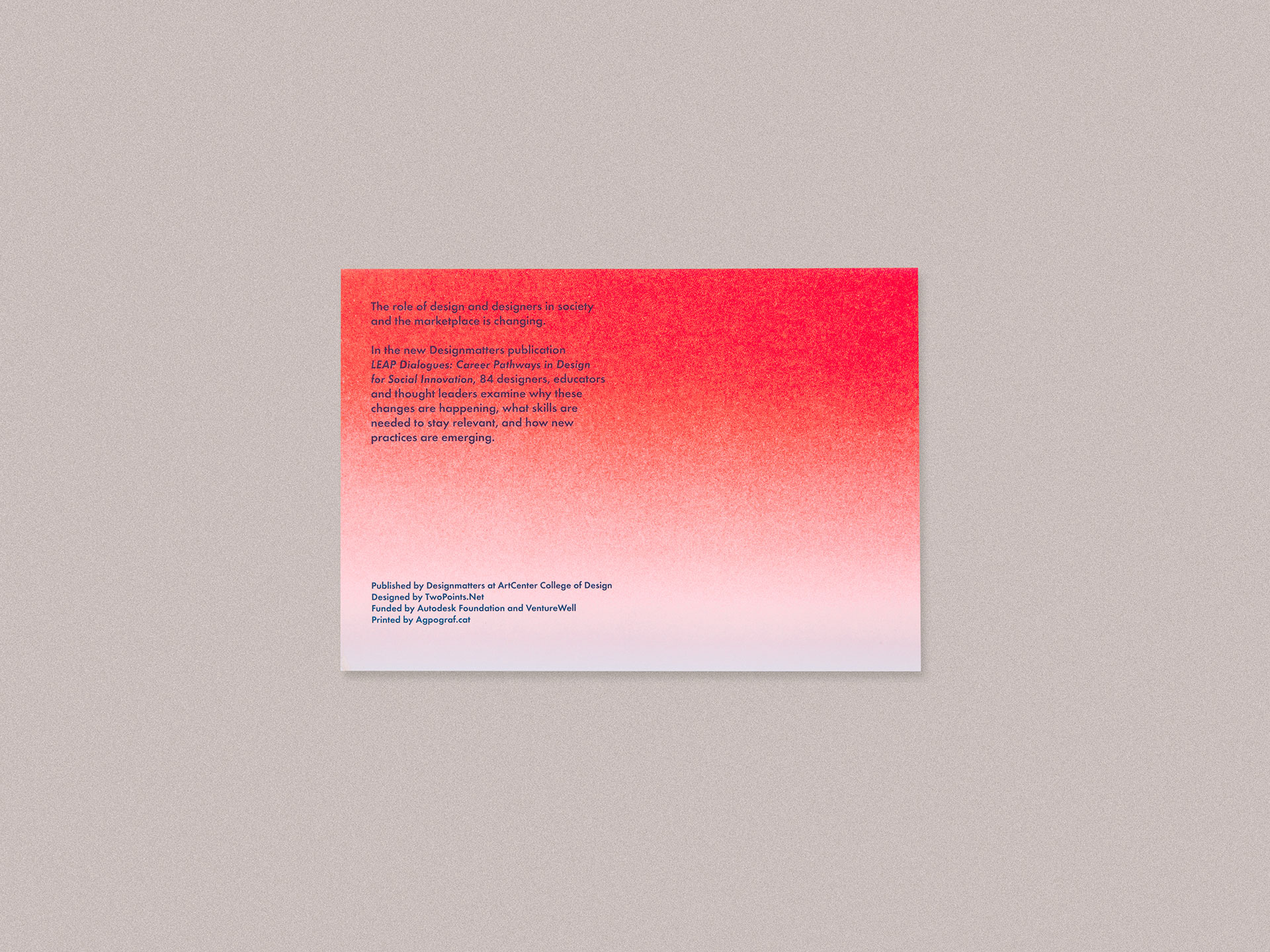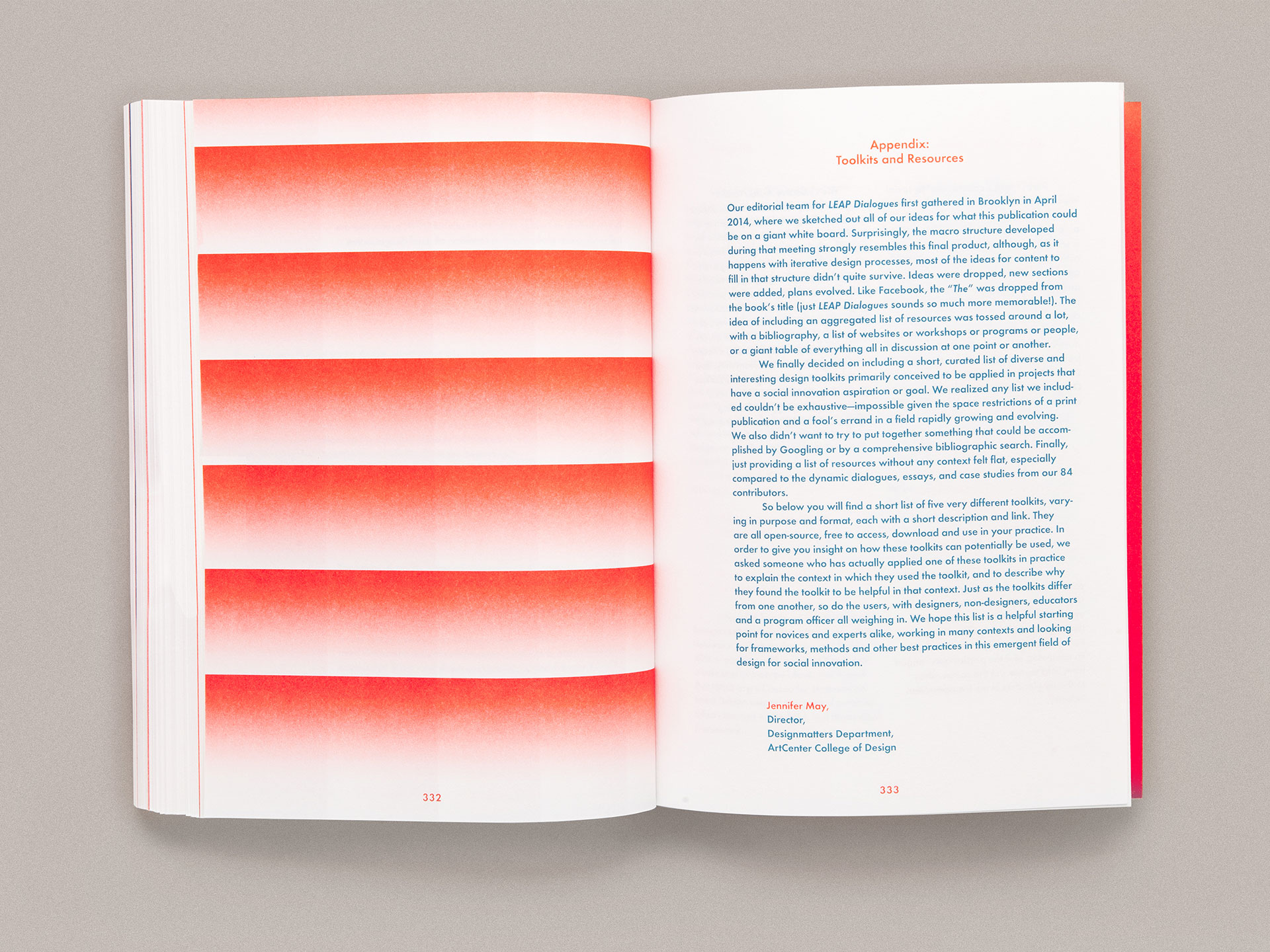 LEAP Dialogues: Career Pathways for Designers in Social Innovation was edited by Amatullo with Bryan Boyer, co-founder and partner at Dash Marshall; Liz Danzico, creative director, NPR and founding chair of the MFA Interaction Design, School of Visual Arts; and Andrew Shea, founder and principal of MANY. Visual Identity by TwoPoints.Net.