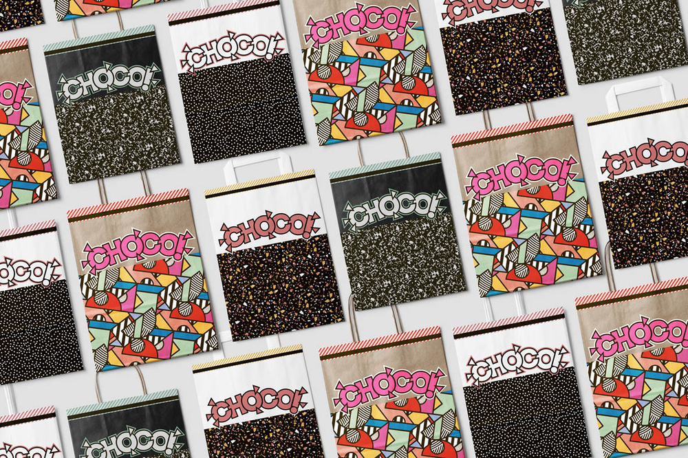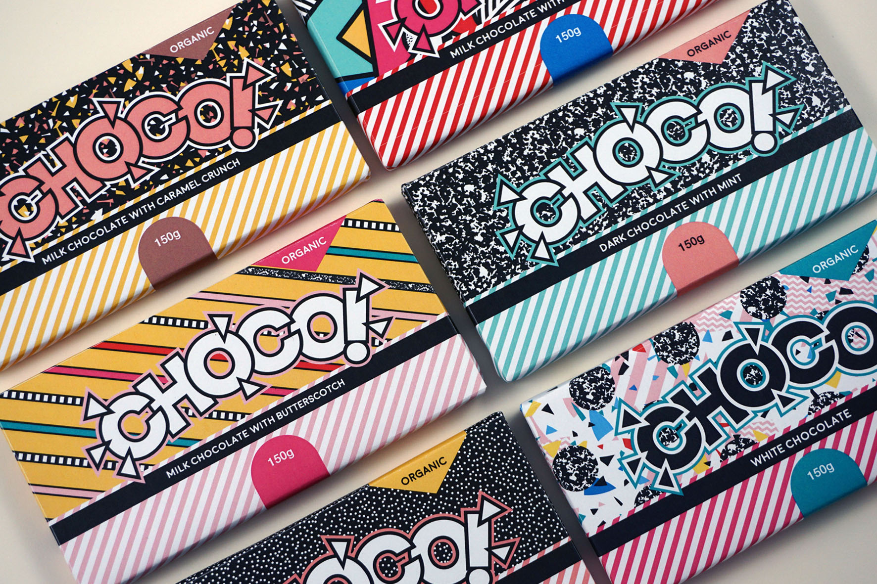 CHOCO is a high-end, modern, chocolate collection. Each design is intended to be individual, but also sit together as a group on shelf. I wanted the design to feel cheerful, and radiate fun. The packaging design allows for the collection to be further expanded when more flavours are added in the future. I also wanted to have the element on the sides of the packaging line up, almost in the same satisfying way that a magazine collection would on shelf.