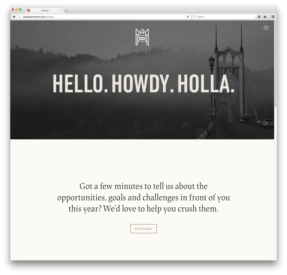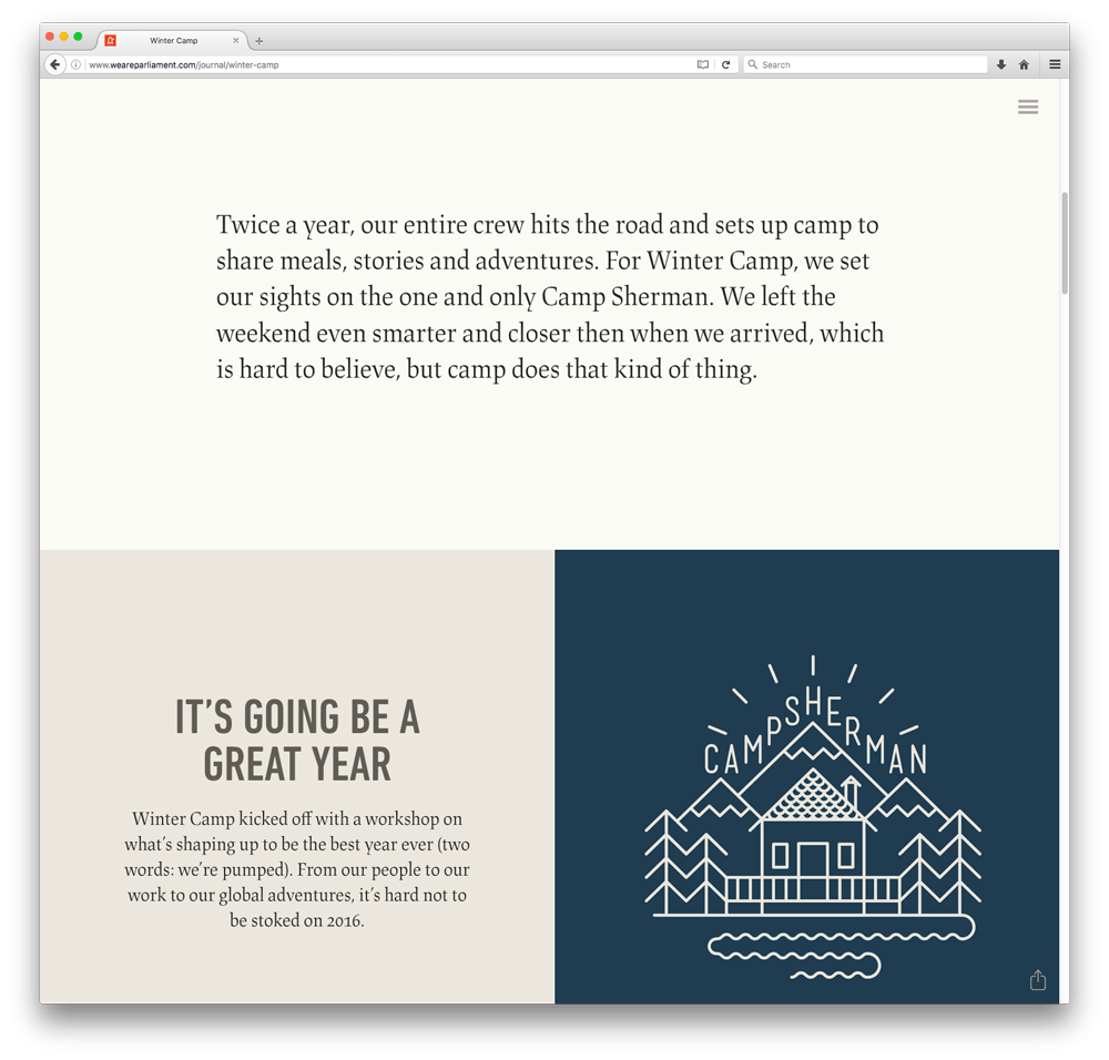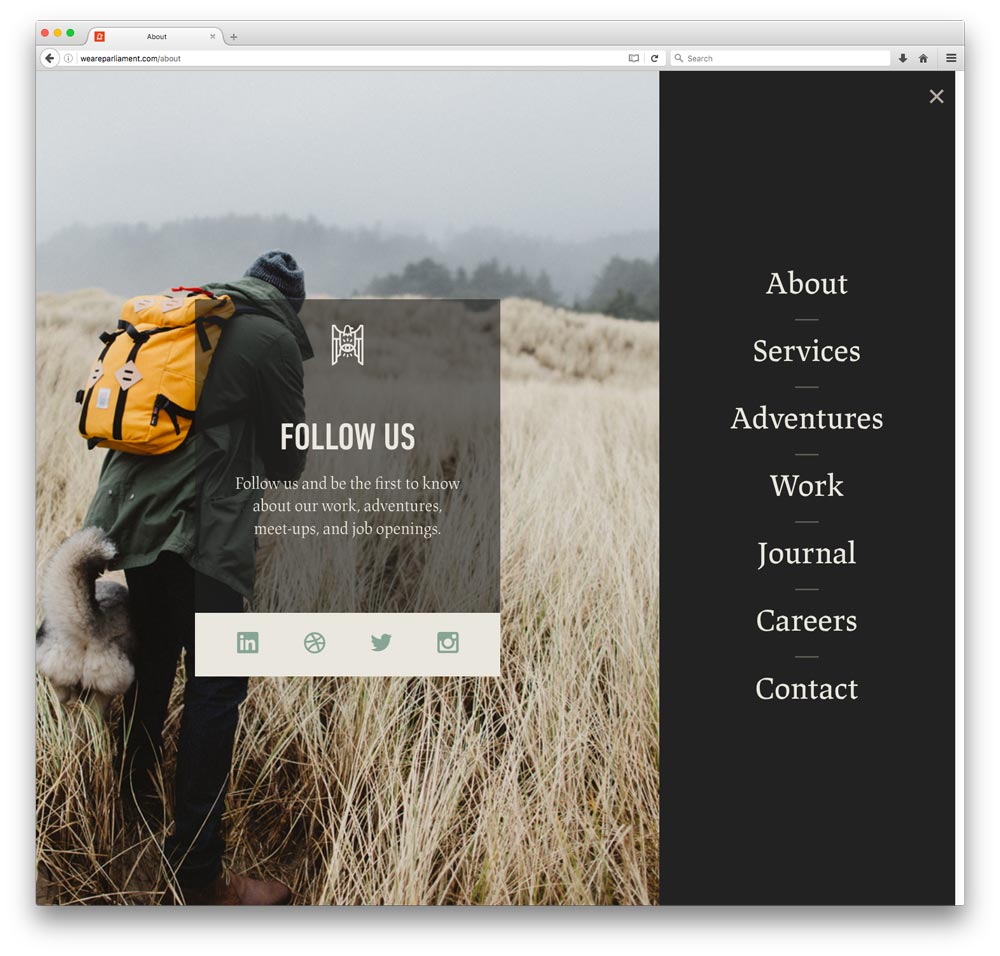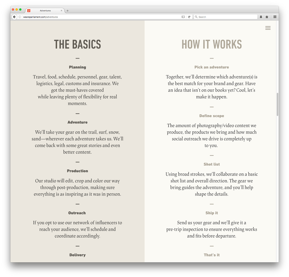Parliament – a branding agency specialised in the area of outdoor activities – uses JAF Lapture alongside DIN Next for their website. The design is straightforward but the outstanding photographs and the bold use of typefaces make this website very attractive.