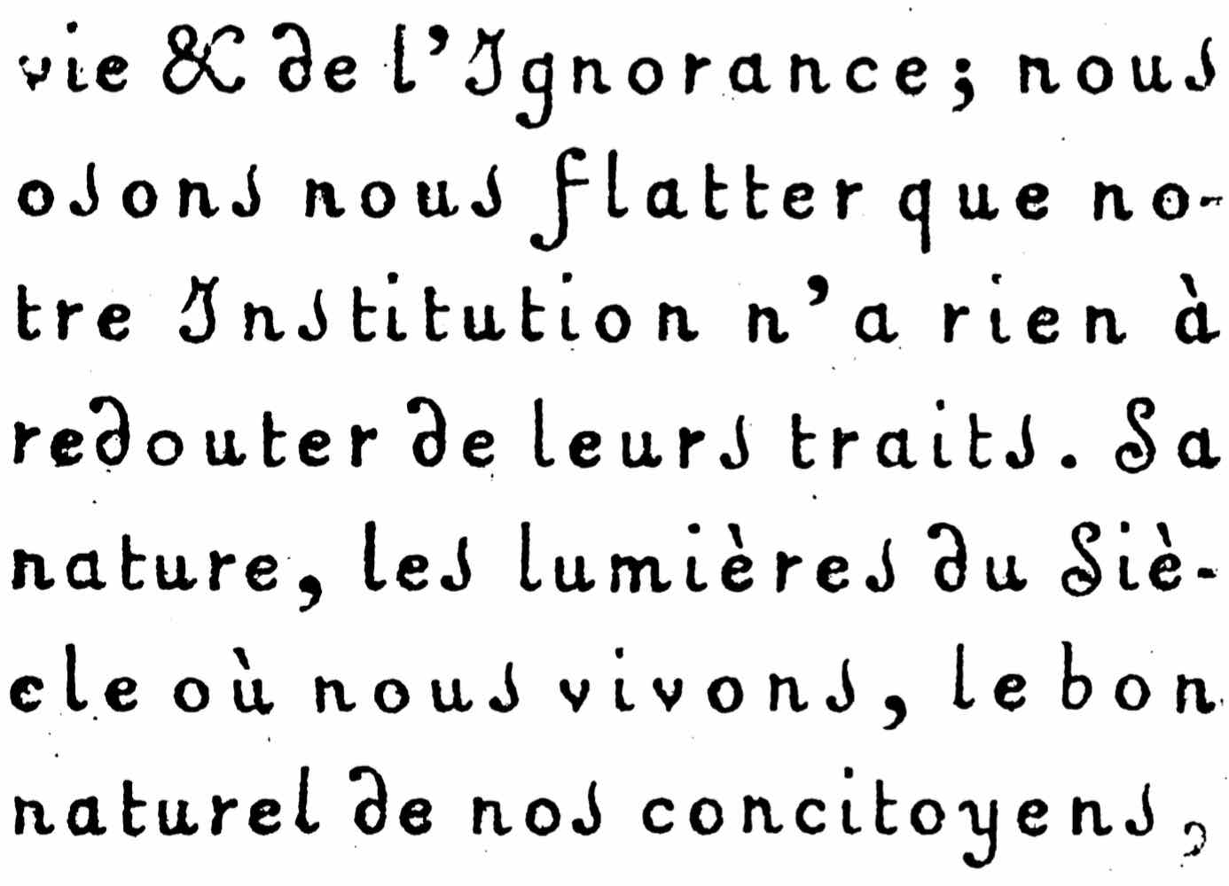 You mention that Haüy’s typeface is extraordinary — it certainly is. I wonder how different it is from other French script typefaces of that time, though, apart from the wide spacing and the eliminated contrast. The former was probably introduced for better letter separation. The latter is a consequence of the writing tool and technique — Haüy mentions that in his writing method (which is emulated by his typeface), the lines are made on heavy paper with an iron pen whose nib is not split, without ink. The letters are impressed, separate and a little big, but otherwise not essentially different from the cursive of the sighted (p23f).