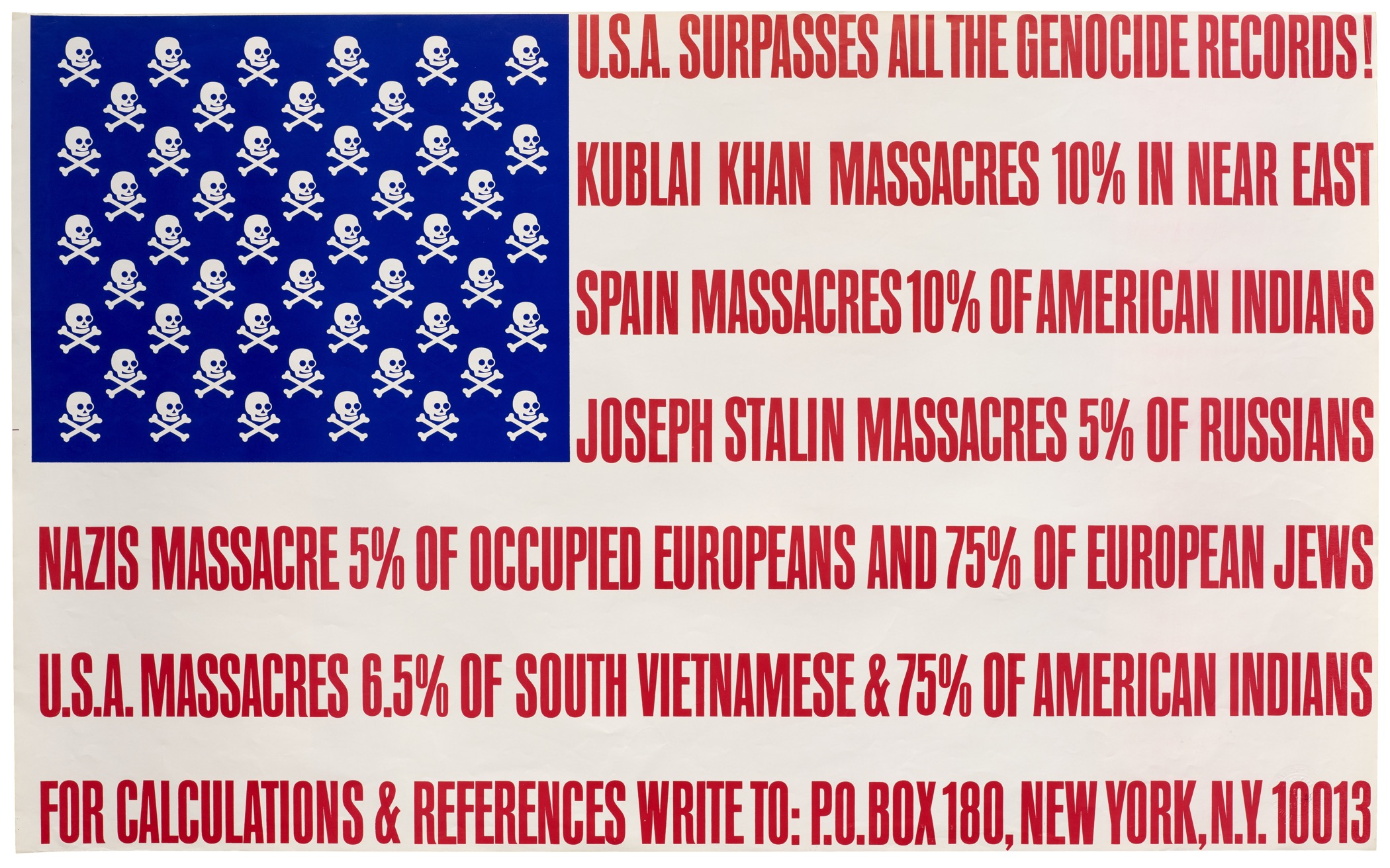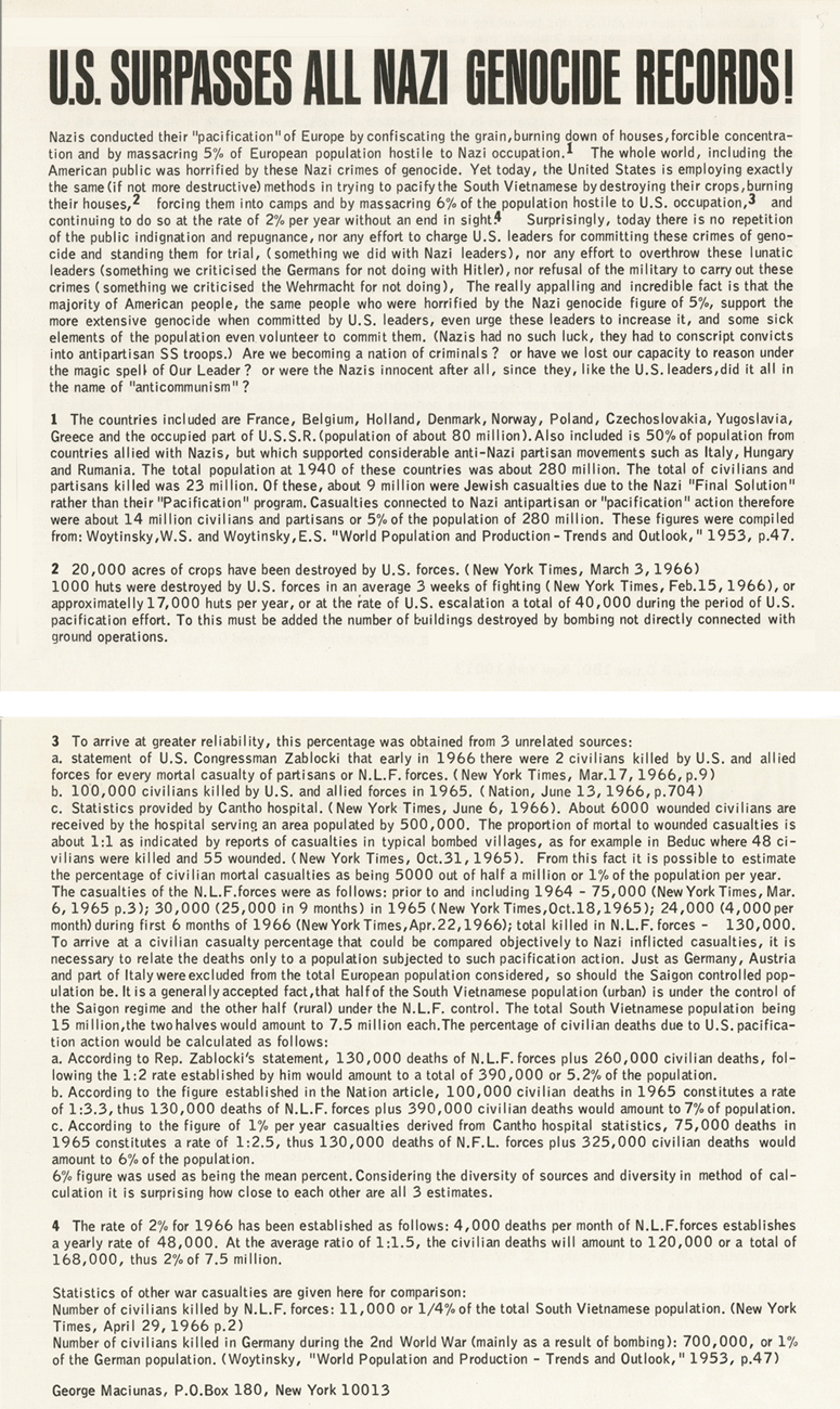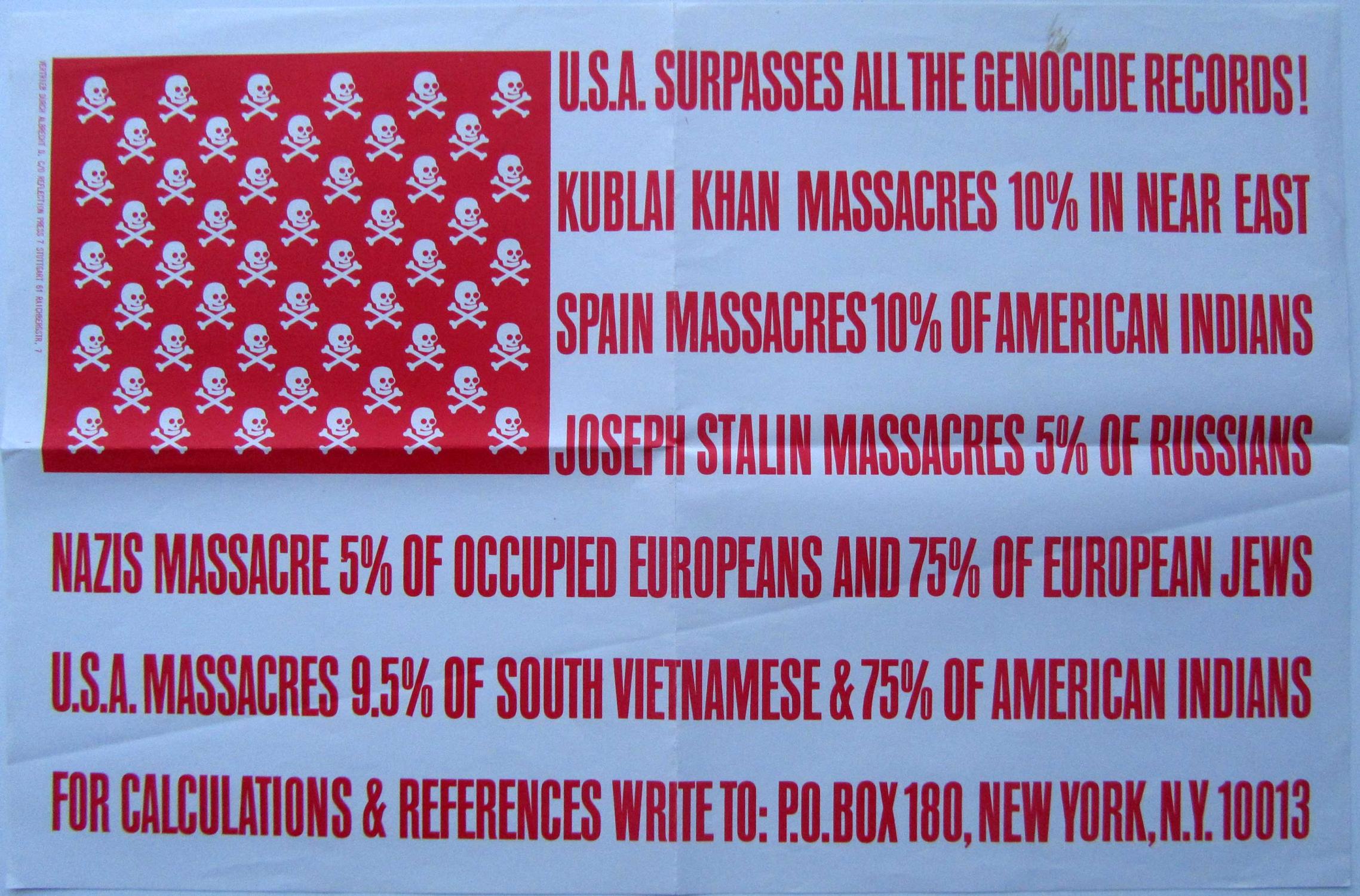 “U.S.A. Surpasses All the Genocide Records, the flag poster, is curiously only listed once in Fluxus publications and then by implication, as a publication of Implosions, a commercial branch of Fluxus started by Maciunas, Robert Watts, and Herman Fine. The work was not signed. It has the image of death in place of stars, and calculations about genocide in place of stripes. The poster was widely distrbuted, and is illustrated in books on political posters from that era. I think that Maciunas particularly wanted the poster to be anonymous so that its impact would be seen for itself, not because of a name associated with it. On the poster, one is invited to send for calculations and references to ‘p.o. box 180, New York, NY 10012‘ (the fluxus postal box). One would have received an essay with calculations titled U.S. Surpasses All Nazi Genocide Records, with Maciunas’ name printed on it.” — Fluxus Codex, pp. 391 via Significant Object