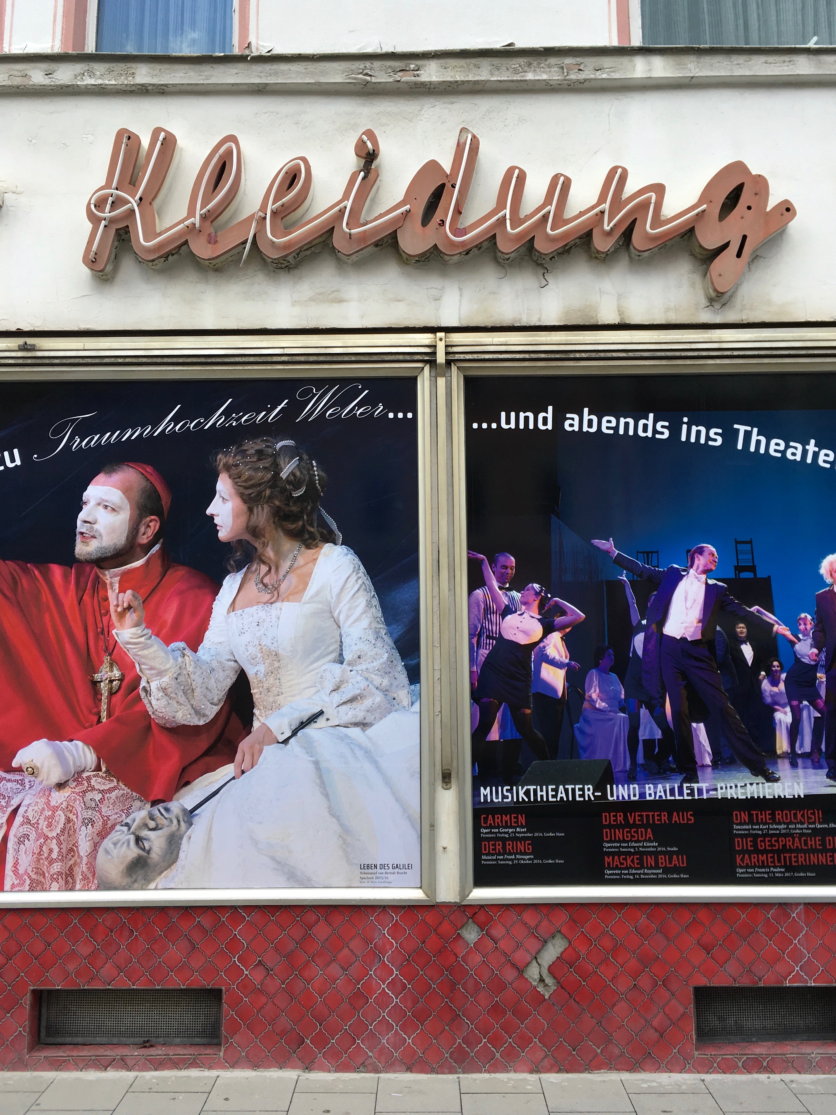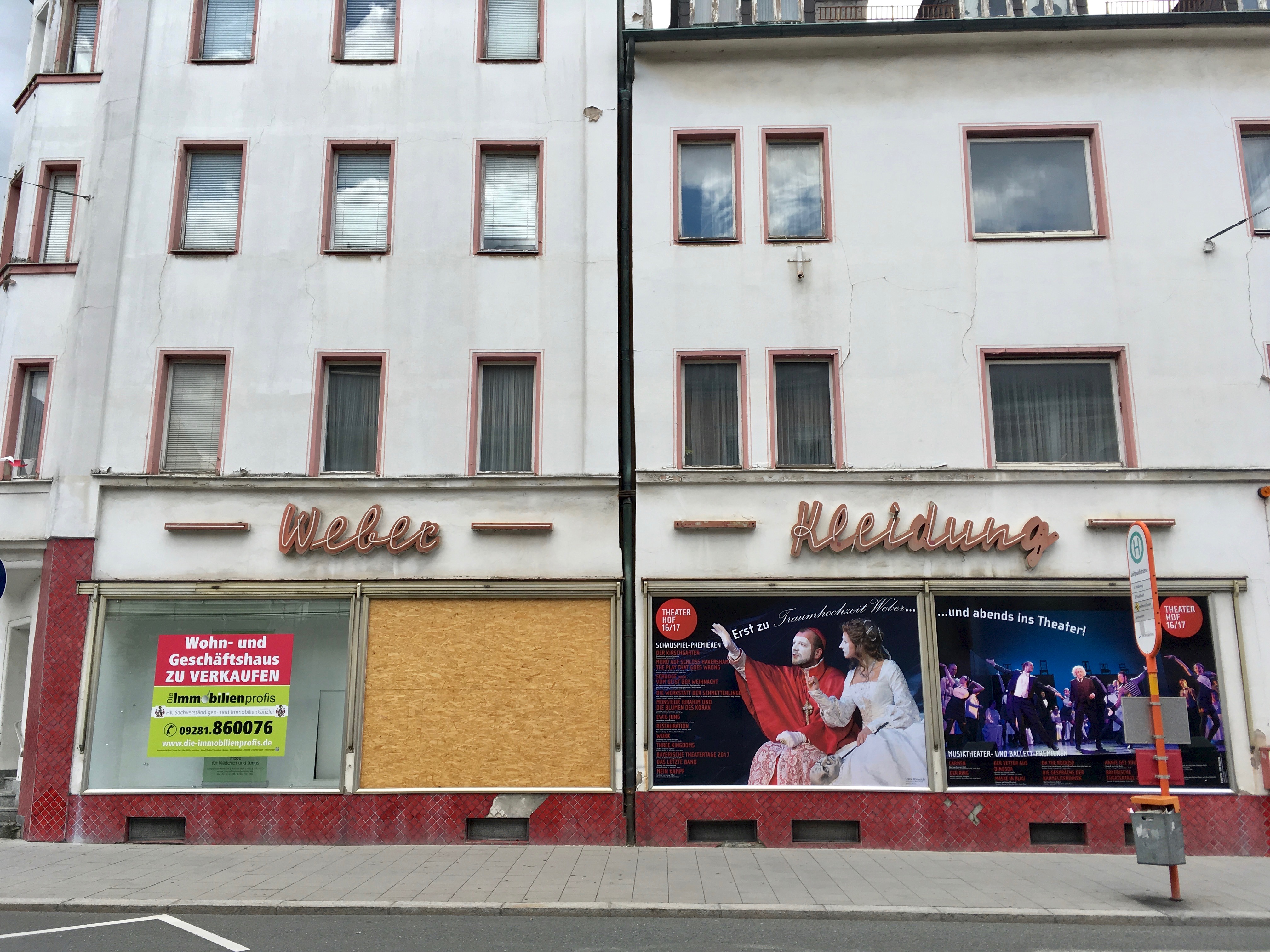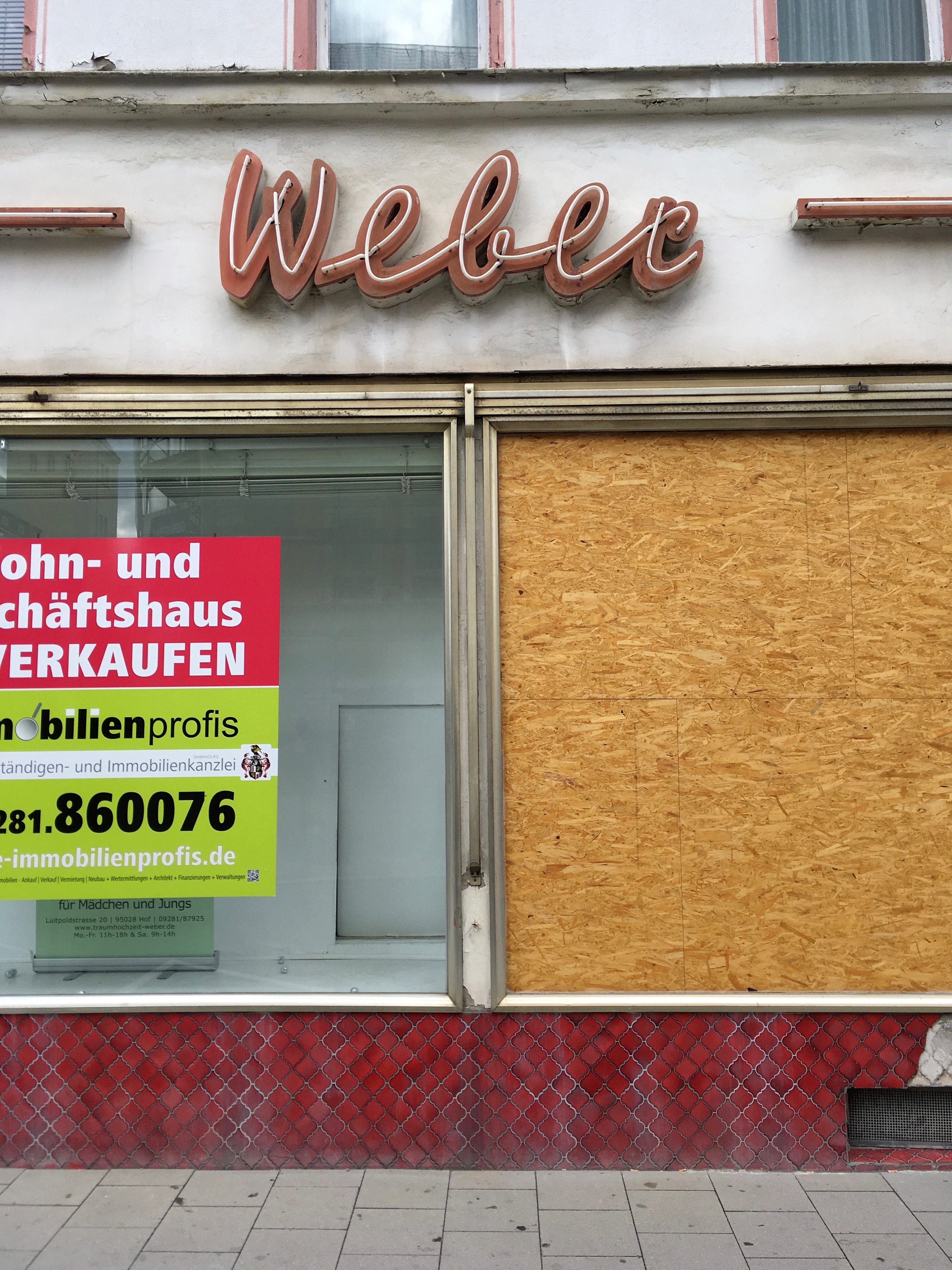 Neon sign on the facade of a clothing store on Luitpoldstraße in Hof, Germany. Weber-Kleidung was known as the “house of a thousand coats”. It closed down in 2008. [Frankenpost]