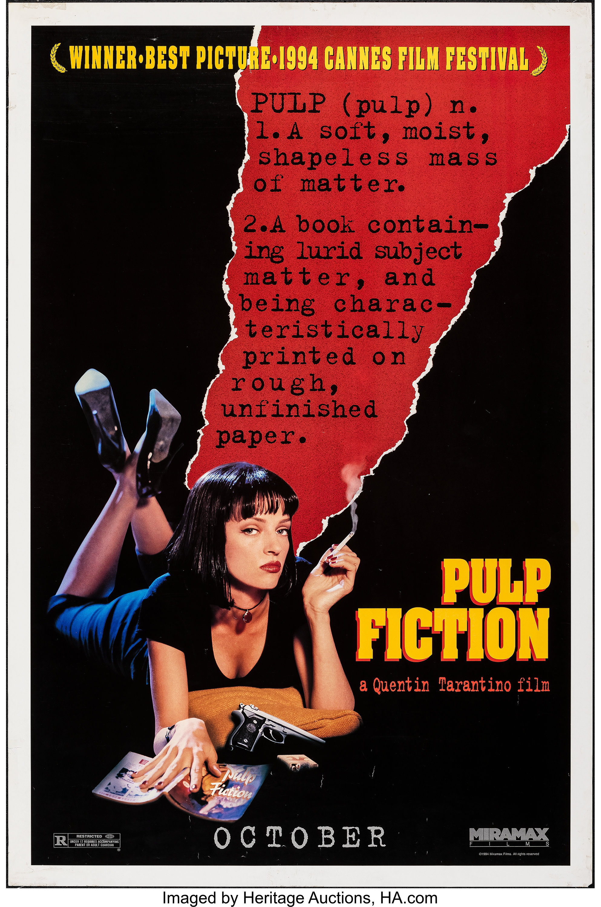 The pulp fiction paperback that Mia Wallace’s hand is resting on is Harlot In Her Heart by Norman Bligh (1950). In the second poster version, the lettering on its cover has been replaced by “Pulp Fiction” in shaded Reporter.