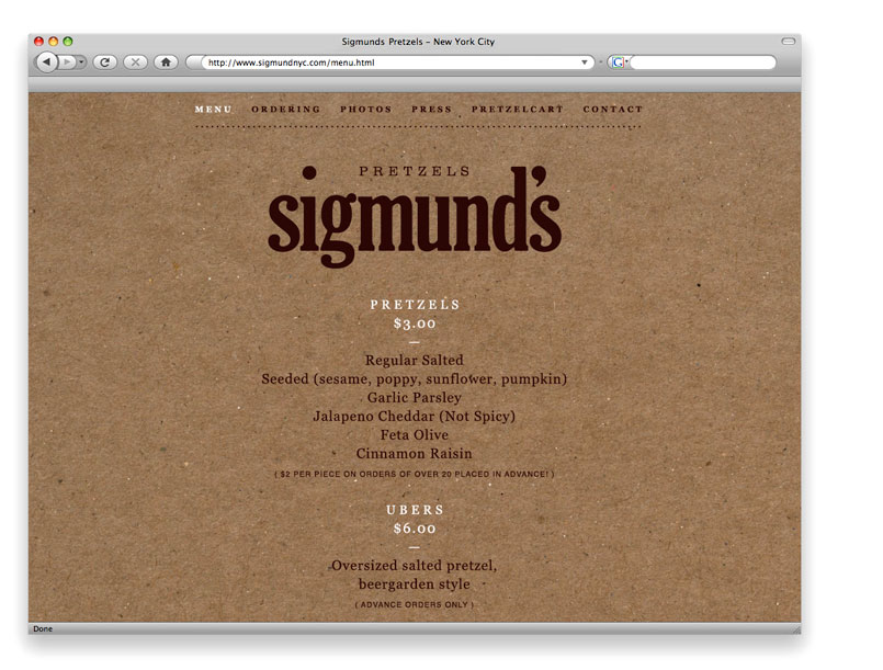Sigmund’s Pretzels identity Contributed by Stephen Coles on Apr 21st, 2012. Source: triborodesign.com License: All Rights Reserved. Customized Gloucester with a shortened ‘d’, new apostrophe and new ear for the ‘g’. Source: triborodesign.com License: All Rights Reserved. Source: triborodesign.com License: All Rights Reserved. Source: triborodesign.com License: All Rights Reserved. Source: triborodesign.com License: All Rights Reserved. Source: triborodesign.com License: All Rights Reserved. Typefaces More about ClarendonMore about Gloucester Formats Web (5714) Packaging (2482) Branding/Identity (8605) Posters/Flyers (5869) Topics Food/Beverage (3111) Designers/Agencies Triboro (17) Tagged withpretzels (6)modified typeface (1771)all lowercase (904)business cards (1555) Artwork location United States (10059) Brooklyn (270) New York City (2975) In SetsColors (Lucas Bevilaqua) (862)ID (Lucas Bevilaqua) (88)Pairings (Lucas Bevilaqua) (578)Typewriter Vibes (Lucas Bevilaqua) (44) Post a comment Name Email – will not be published Website Your response Submit Comment More Clarendon in use A selection of types / Auswahl guter Typen / Une sélection de caractères1958Rudolf HostettlerPhoto(s) by Philipp Messner on Flickr. Staff Pick The Amityville Horror by Jay Anson2023Michael RussemContributed by David Jonathan Ross The International Pop Orchestra – The 12 Greatest Songs Ever Written album art1962unknownContributed by Javi Gonzalez Sponsor More in Food/Beverage Fish Butchery by Josh Niland2023Daniel NewContributed by VJ-Type David protein bars2024Day JobContributed by Jordan Egstad Staff Pick “Wet & Wild” ads for Seven-Up1966Contributed by Stephen Coles Domaine la Bosque2023Studio AsensòContributed by Studio Asensò More in Web ATX TV website and festival identityc. 2024unknownIsabel CanalesContributed by Jamie Otelsberg (OH no Type Co.) LCMC Health2019LCMC HealthContributed by Darden Studio Strategic Imperativesc. 2020Liven CreativeAndrew MylesContributed by Edgar Walthert The Stand2021The PlantContributed by Emtype Foundry More Fonts In Use Bigfoot National Park2012Laurent DurieuxContributed by Stephen Coles Staff Pick The Peter Principle (BBC)1973Liz FriedmanContributed by Florian Hardwig Staff Pick Bang Bang2018Harley Johnston DesignContributed by Harley Johnston Staff Pick Club 57 at MoMA2017Damien SaatdjianMoMA Design StudioEva Bochem-ShurContributed by Damien Saatdjian Staff Pick