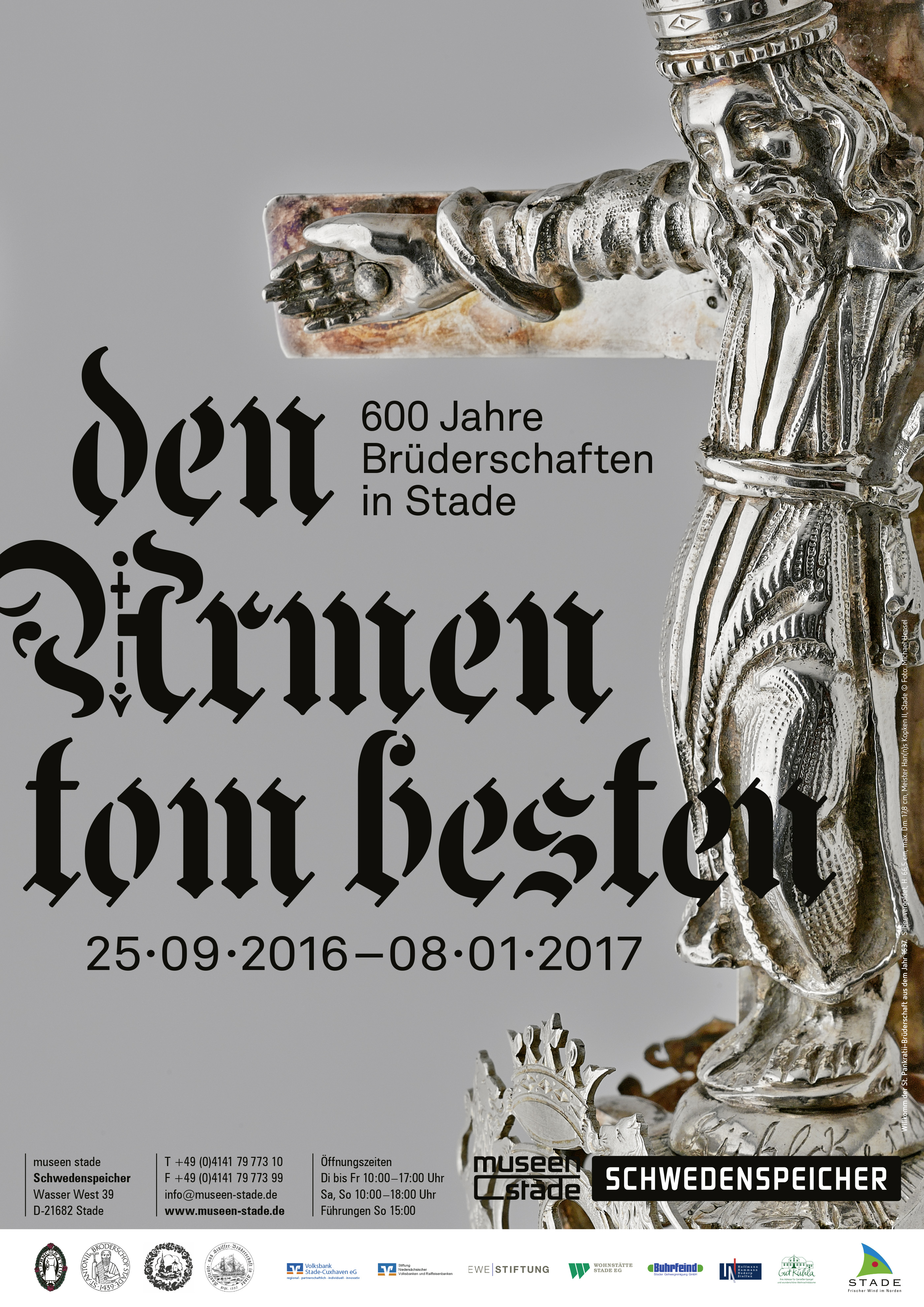 The title in Low German, Den Armen tom besten, is derived from a chronicle from 1764, commemorating the foundational event of the Kaufleute- und Schiffer-Brüderschaft in 1556, when “merchants of Stade had loaded many ships and equipped them with guns, lead, and powder, against those from Hamburg. When they returned home, they kept lead and powder to the value of 12 marks and 8 shillings. This amount has been invested for the better of the poor.”