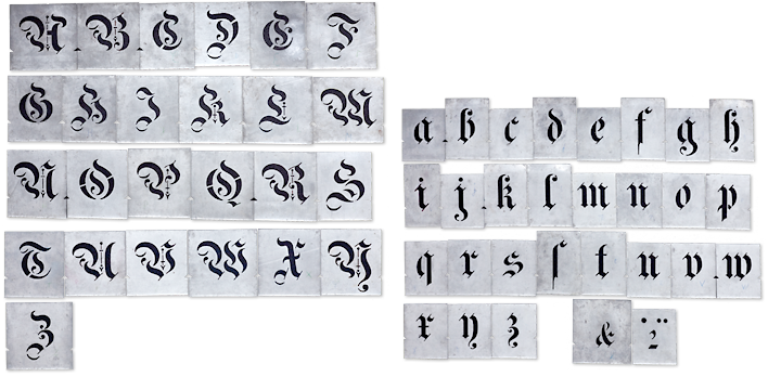 The design […], a blackletter chancery, is a romantic reprise of a style that was common in German writing offices from the 14th to the 16th century. The flourishes stylistically quote the Baroque period. […] Overall, this decorative blackletter doesn’t look like a stencil design. Maybe it was originally used by a sign painter, and all the typical stencil bridges would have been painted over in the final work.