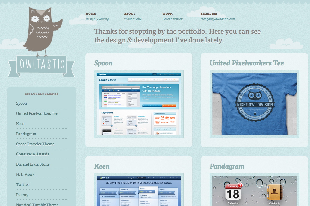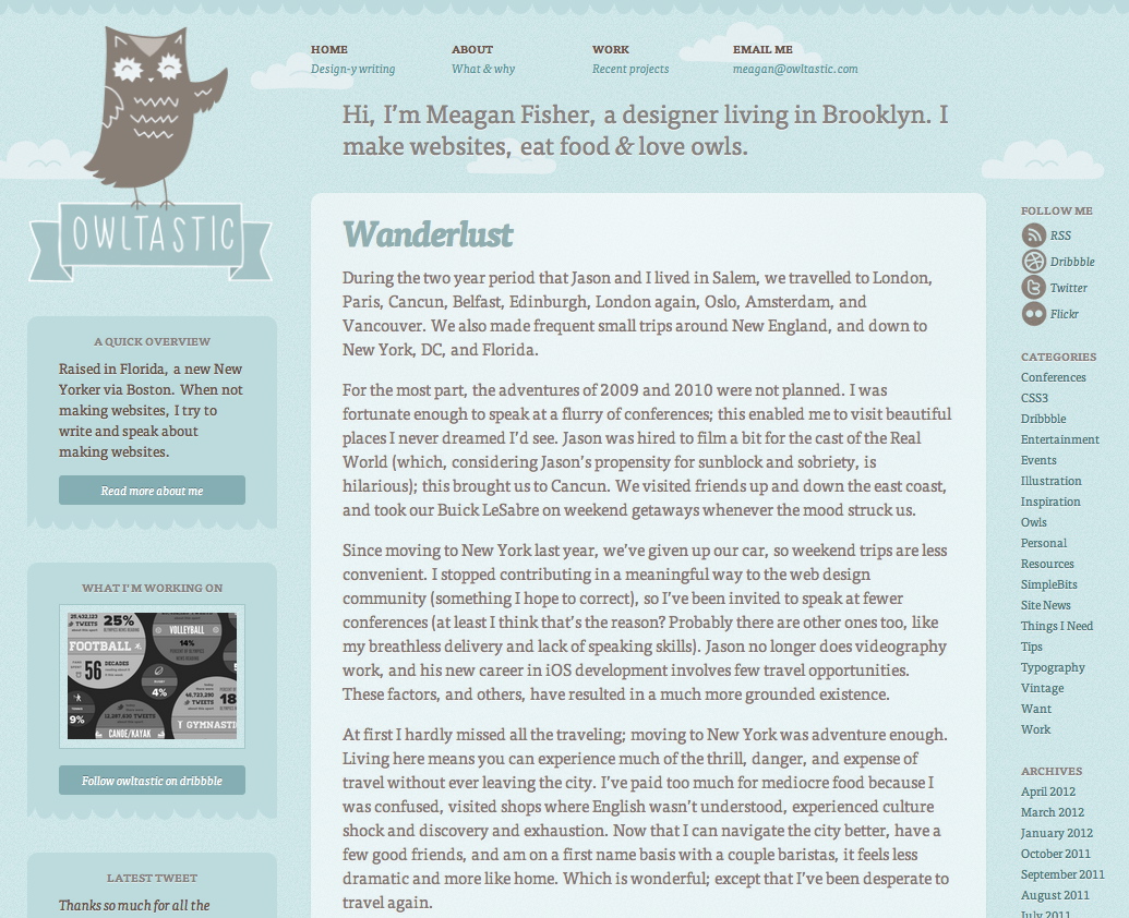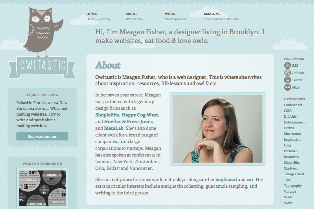 Owltastic.com Contributed by Stephen Coles on Apr 24th, 2012. Source: owltastic.com License: All Rights Reserved. Source: owltastic.com License: All Rights Reserved. Source: owltastic.com License: All Rights Reserved. The "text-rendering: optimizelegibility;" property was added for this screenshot. Typefaces More about FF TisaGet FF Tisa Formats Web (5565) Topics Graphic Design (2985) Designers/Agencies Meagan Fisher (1) Tagged withwebfonts (449)Typekit (29)portfolios (760) Post a comment Name Email – will not be published Website Your response Submit Comment More FF Tisa in use Instapaper website (2013 redesign)2013Grant CusterbetaworksContributed by Stephen Coles Five Simple Steps: A Pocket Guide Series2012Nick BoultonFive Simple StepsContributed by Stephen Coles tegut…Contributed by Indra Kupferschmid Blog Sponsor More in Graphic Design Ciro Esposito personal site2012Ciro EspositoContributed by Stephen Coles Ypsilon Éditeur Preview 20142014Pauline NuñezContributed by Florian Hardwig Staff Pick New Apology Projects websitec. 2024New Apology ProjectsContributed by Nick Losacco La Lettre du Musée nº16, Octobre 20102010Matthieu CortatContributed by 205TF More in Web Equality for Women in Visual Artsc. 2018Studio Max Pietro HoffmannContributed by WELTKERN® Typefaces Stalkr2013AREA 17Contributed by Stephen Coles Staff Pick Dinnerlyc. 2019Marley SpoonContributed by CJ Dunn Vistapoint.tv identity2018FormfcwContributed by Florian C. Wachmann More Fonts In Use Maser Crisis Murals2010MaserContributed by Underware Staff Pick Herman Miller logo (1999–2010)1999Contributed by Stephen Coles Staff Pick بيذكر بالخريف vase2020Edo SmitshuijzenContributed by 29LT Type Design Company Staff Pick Taylor Franklinc. 2017Taylor FranklinContributed by 205TF Staff Pick