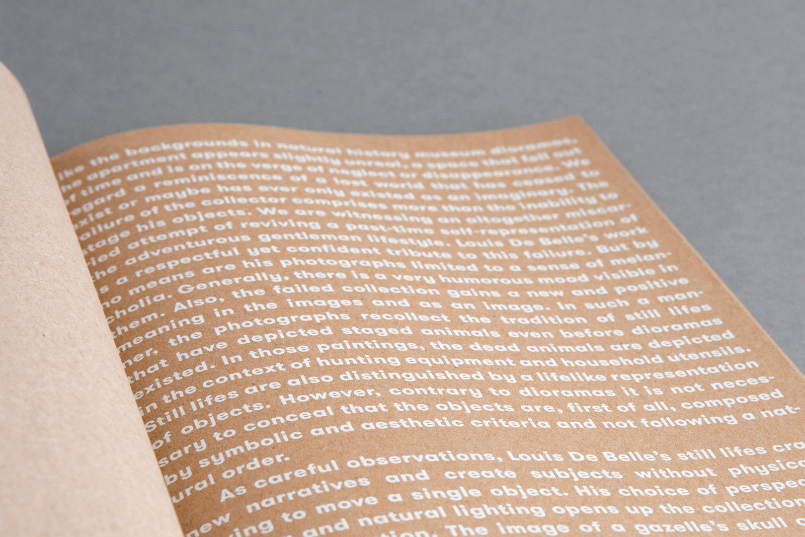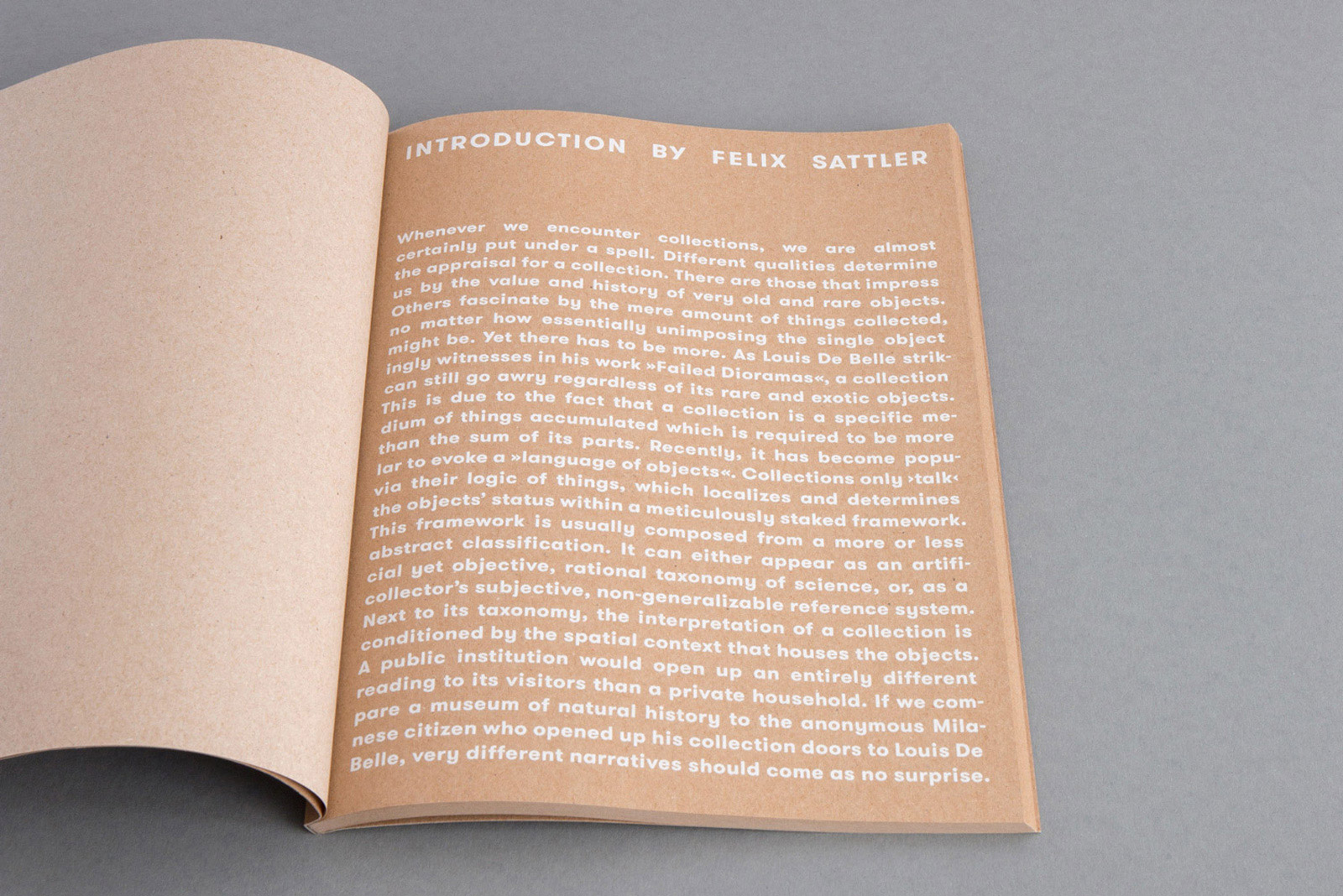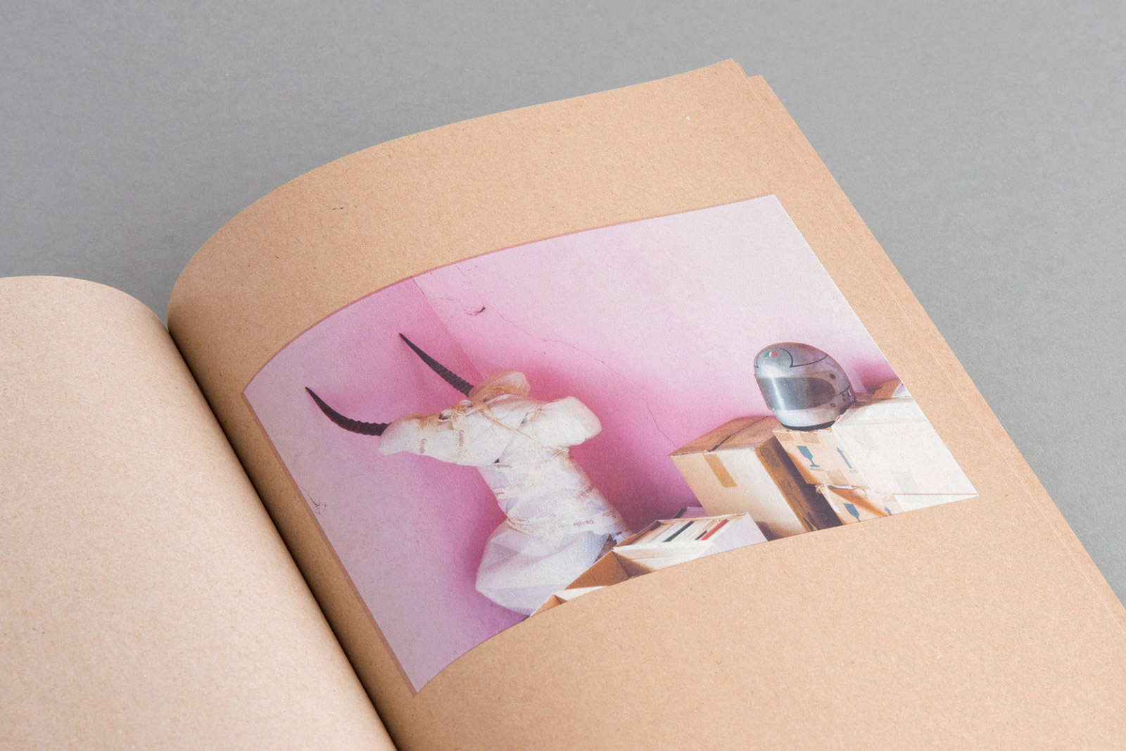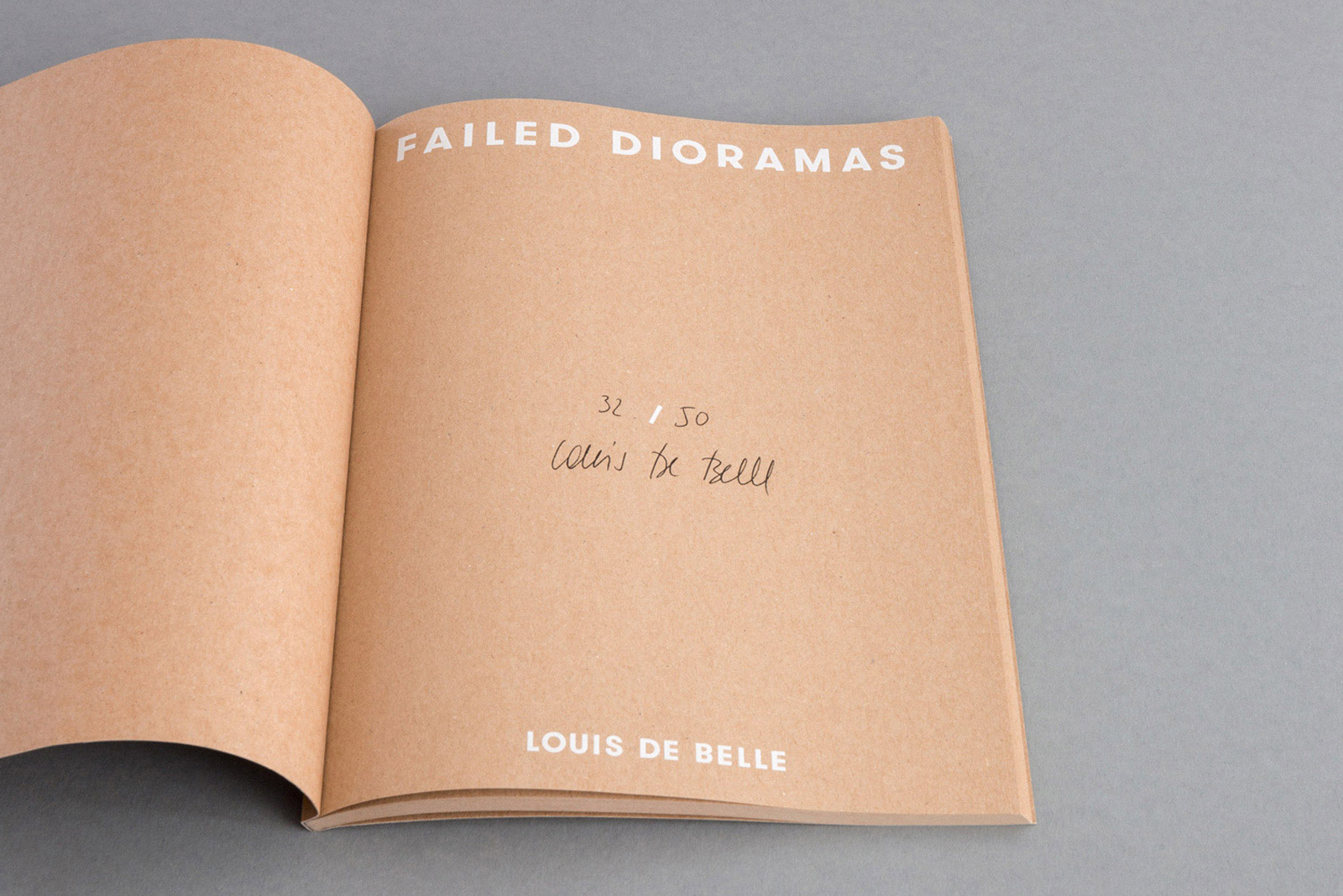 A numbered and signed catalogue book, with an introduction by curator Felix Sattler, was released on the occasion of the solo exhibition Failed Dioramas at Tieranatomisches Theater der Humboldt Univeristät zu Berlin. It is entirely printed on recycled kraft paper, which resembles the cardboard boxes of the installation.