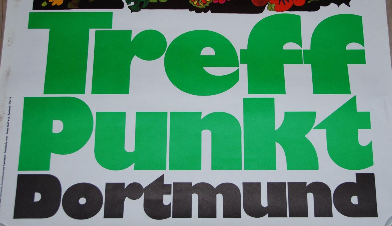 Over on Flickr, Mike Ashworth posted the cover of the Dortmund Information guide book, published by the City of Dortmund in 1974. It likewise uses Gill Kayo. The design is credited to E. Schackmann. Are they responsible for the Treffpunkt poster as well? I’d say it’s at least possible.