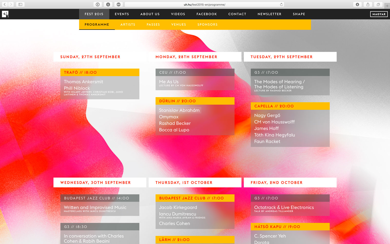 UH Fest is one of the rare events dedicated to adventurous modern music in Hungary. Since 2001 we have staged more than 450 performances during 7 festivals and a number of one-off events. Due to our decade-long activity and the scope of our events (both in terms of number of acts and stylistic variety) UH Fest became a high profile event — a point of reference even. — UF Fest