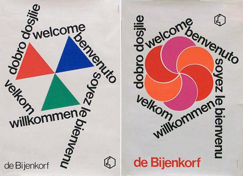 The image above shows two versions of a poster for De Bijenkorf (“The Beehive”), a chain of high-end department stores, probably made in the late 1960s. The hexagonal arrangement of the lines in six languages echoes Josef Müller-Brockmann’s honeycomb logo.