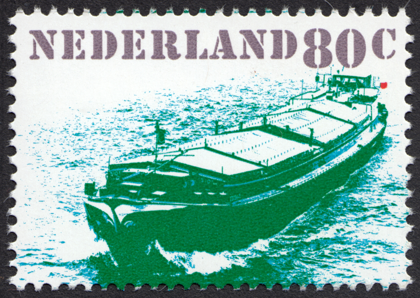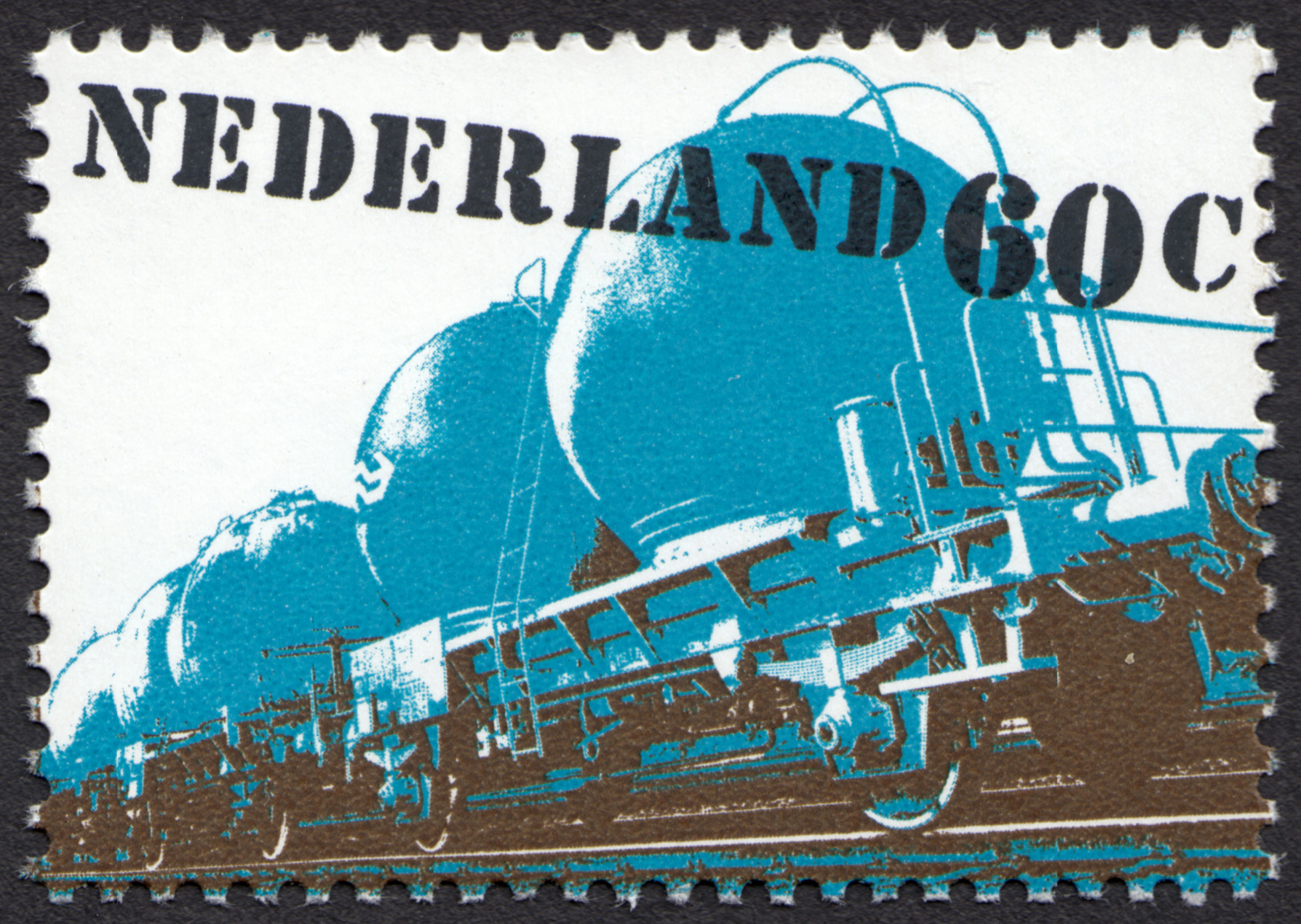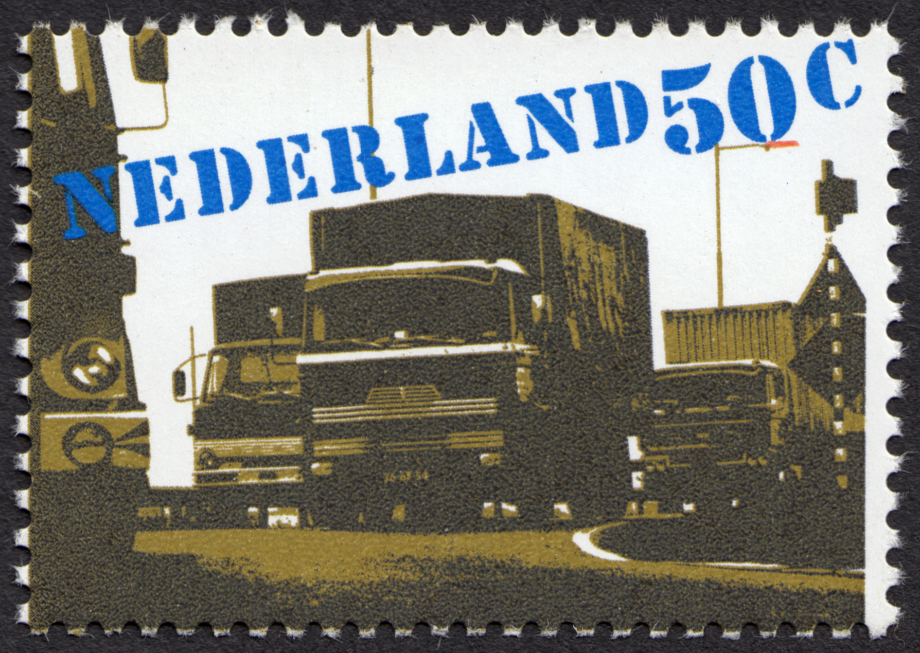 Dutch stamp series depicting three types of freight traffic – road, rail and inland waterway haulage – designed in 1980 by Ben Bos at Total Design for the Dienst voor Esthetische Vormgeving PTT. The chosen typeface is Stencil, originally designed in the 1930s by Gerry Powell for ATF. This version has more robust serifs and a less static leg for ‘R’ than the digitally available ones — maybe an optimization made for the small size. Both the fragmented letterforms and the seemingly random placement on an angle allude to the typical ad hoc stencil lettering seen on cargo. The online archive Memory of the Netherlands has a preparatory study showing that Bos first tried out Glaser Stencil, which was probably discarded as too slick. The collection also features original photographs, color studies, and an unused alternative design.