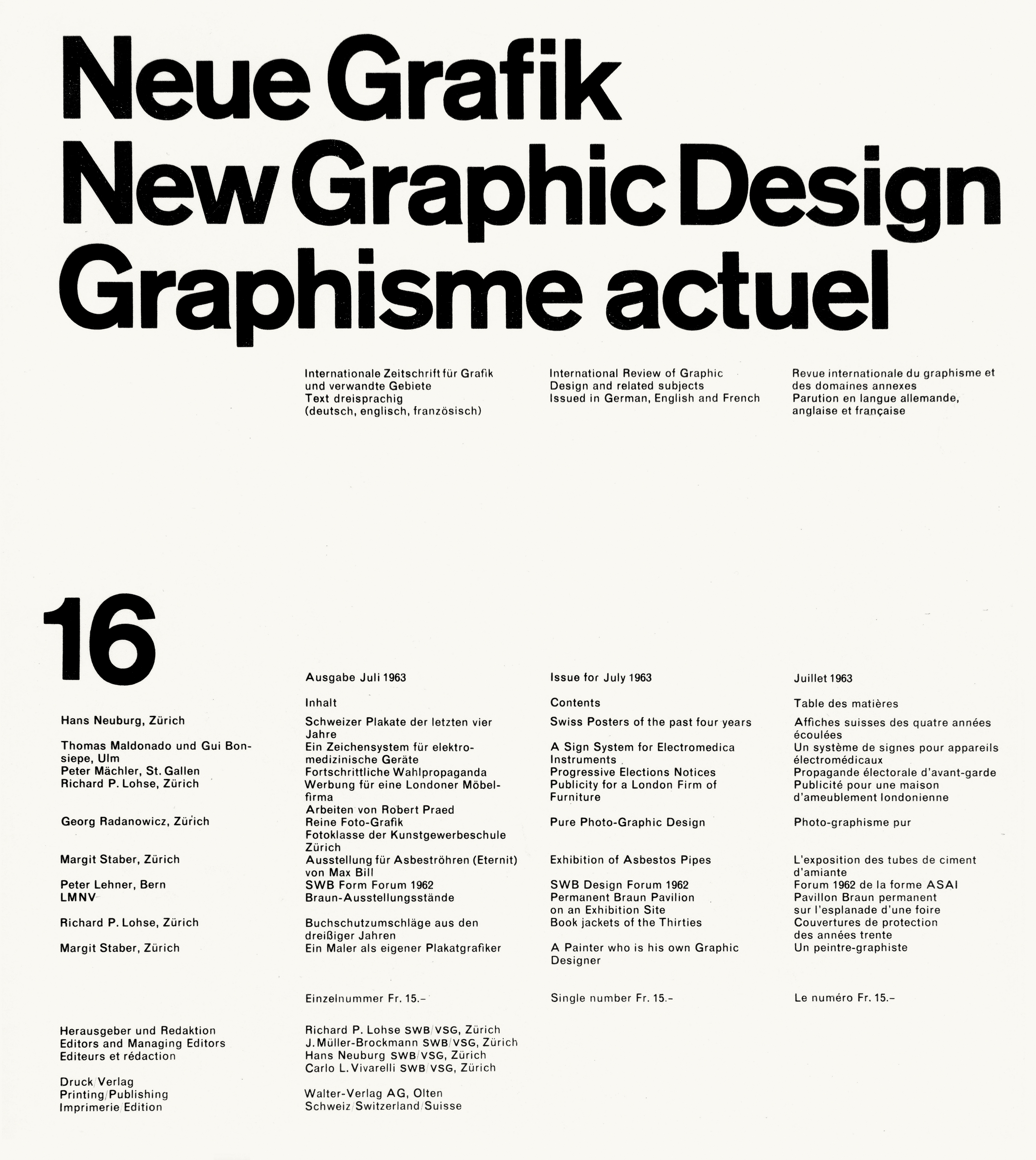 Neue Grafik was founded in Zurich by graphic designers Josef Müller-Brockmann, Carlo Vivarelli, Hans Neuburg and Richard Paul Lohse. It ran for 18 issues (actually 17, the last one being a double), from 1958 to 1965. The stark all-type cover template, designed by Vivarelli, uses Akzidenz-Grotesk’s popular Medium weight for the trilingual masthead and the issue number. Since Akzidenz-Grotesk was unavailable for typesetting on Monotype machines, all text-size typography, on the cover as well as the inside pages, makes do with Monotype Grotesque Regular (215) and Bold (216).