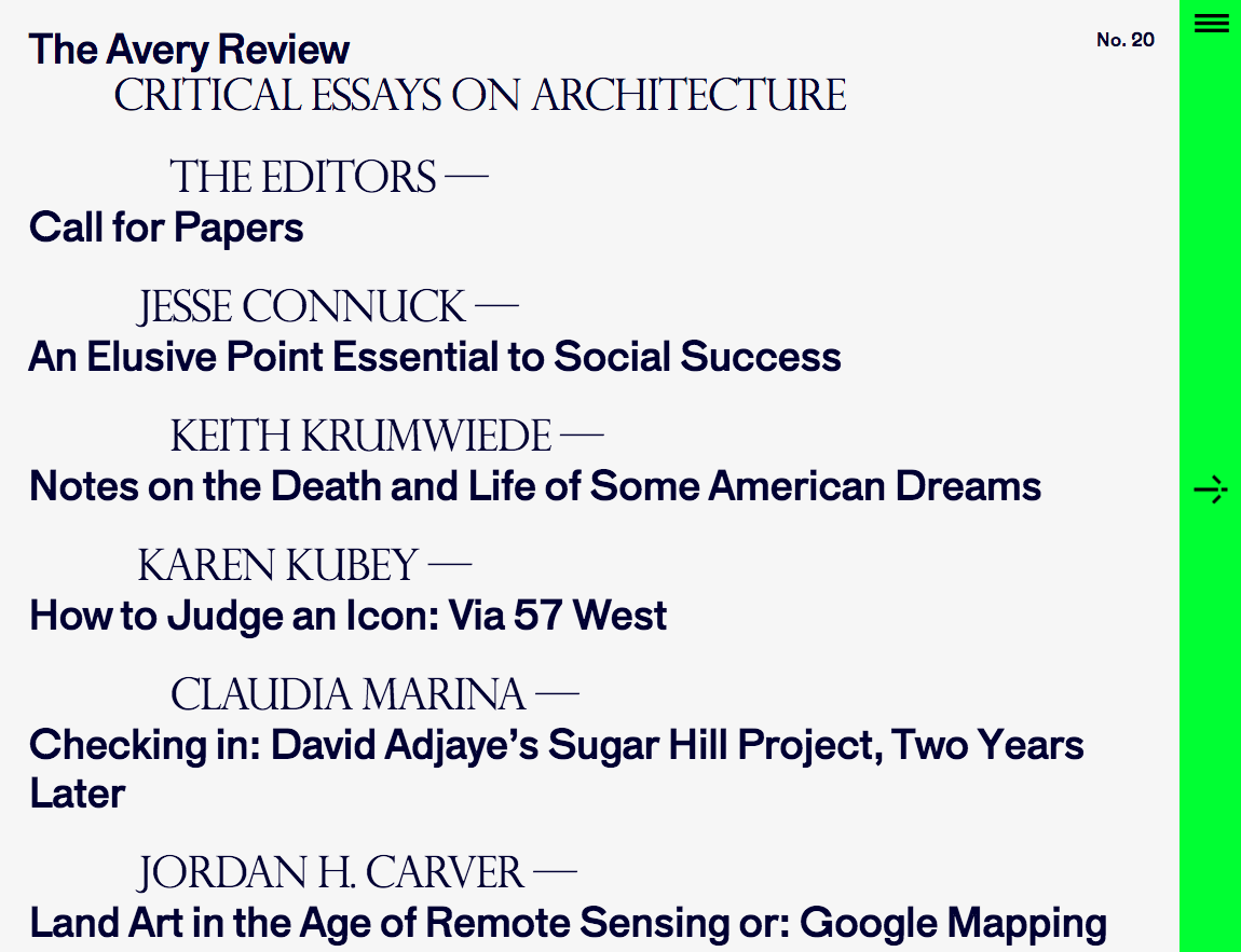 The Avery Review is an online journal dedicated to thinking about books, buildings, and other architectural media. It is a project of the Office of Publications at the Columbia University Graduate School of Architecture, Planning and Preservation.