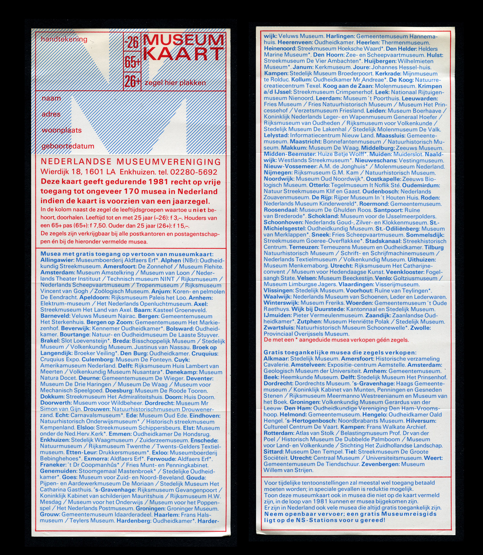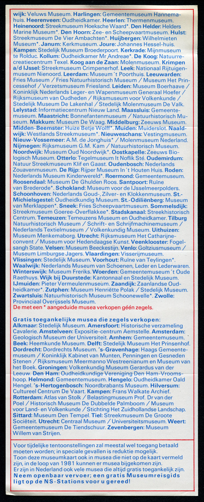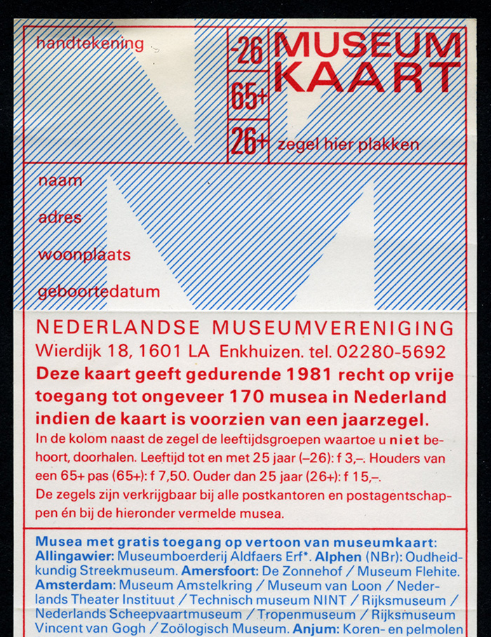 This Museumkaart (Museum Card) from De Nederlandse Museumvereniging (the Dutch Museum Association) gave, if filled in and completed with a valid stamp, free access to approximately 170 museums in the Netherlands during the year 1981.