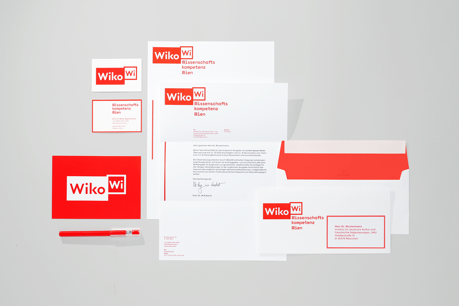 The premise of the brand design is bookmarking, labeling, and correcting in red. And as it is an Austrian company, the natural colour choices were red and white. The square acts as the unifier in the identity, making the logo, printed collateral, as well as the website strictly compartamentalised in red frames.
