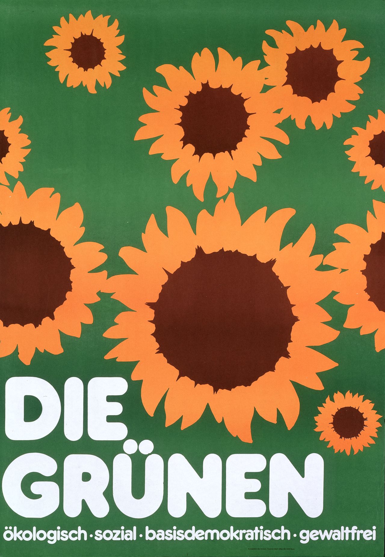 The font used on the iconic sunflower poster is Frankfurter, with the smaller type (“ökologisch · sozial · basisdemokratisch · gewaltfrei”) in the lighter Medium weight, the only member of the family to include a lowercase.