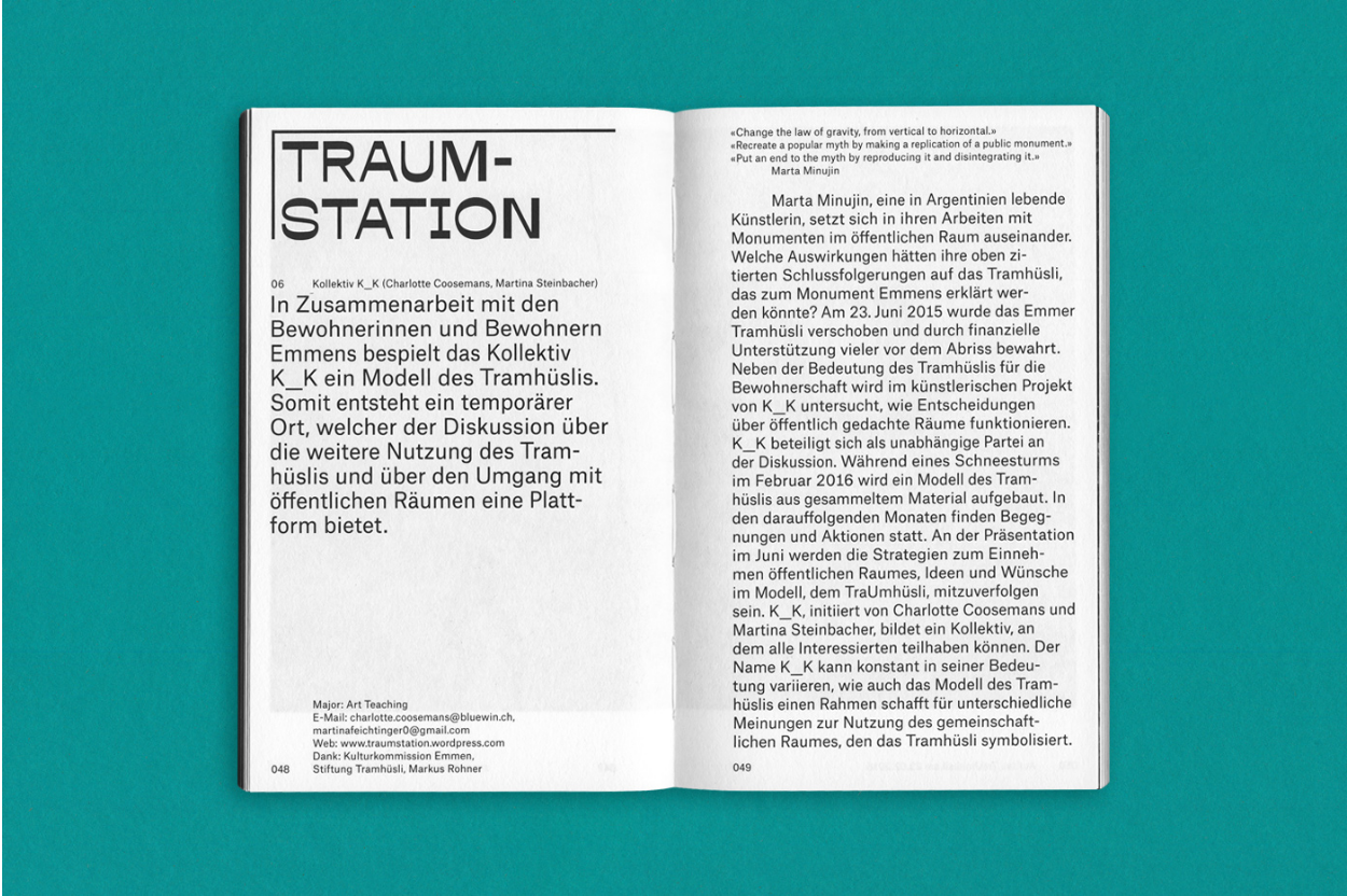 Exhibition catalogue of the diploma projects in the Master in Fine Arts (Art in Public Spheres & Art Teaching) at Hochschule Luzern. The publication features the final projects by the students as well as a photographic portrait of the city Emmen, Lucerne, where the exhibition took place.