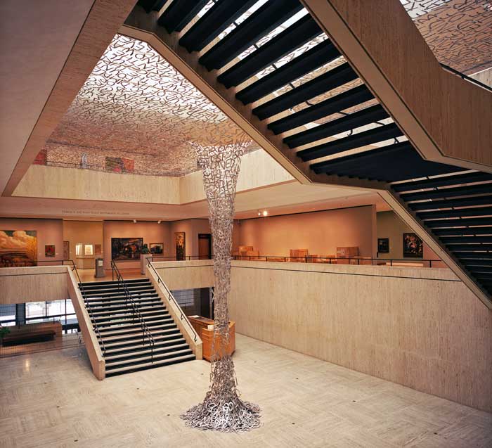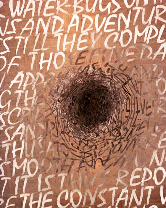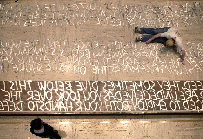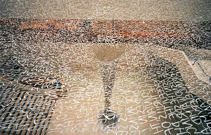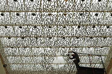 Xu has re-created that vision in the museum: the suspended lake takes the form of the very letters of Thoreau’s passage. Thousands of wire-linked aluminum letters hover at the top of the three-story museum court and, in the middle of the “lake,” letters tumble down to the first floor.