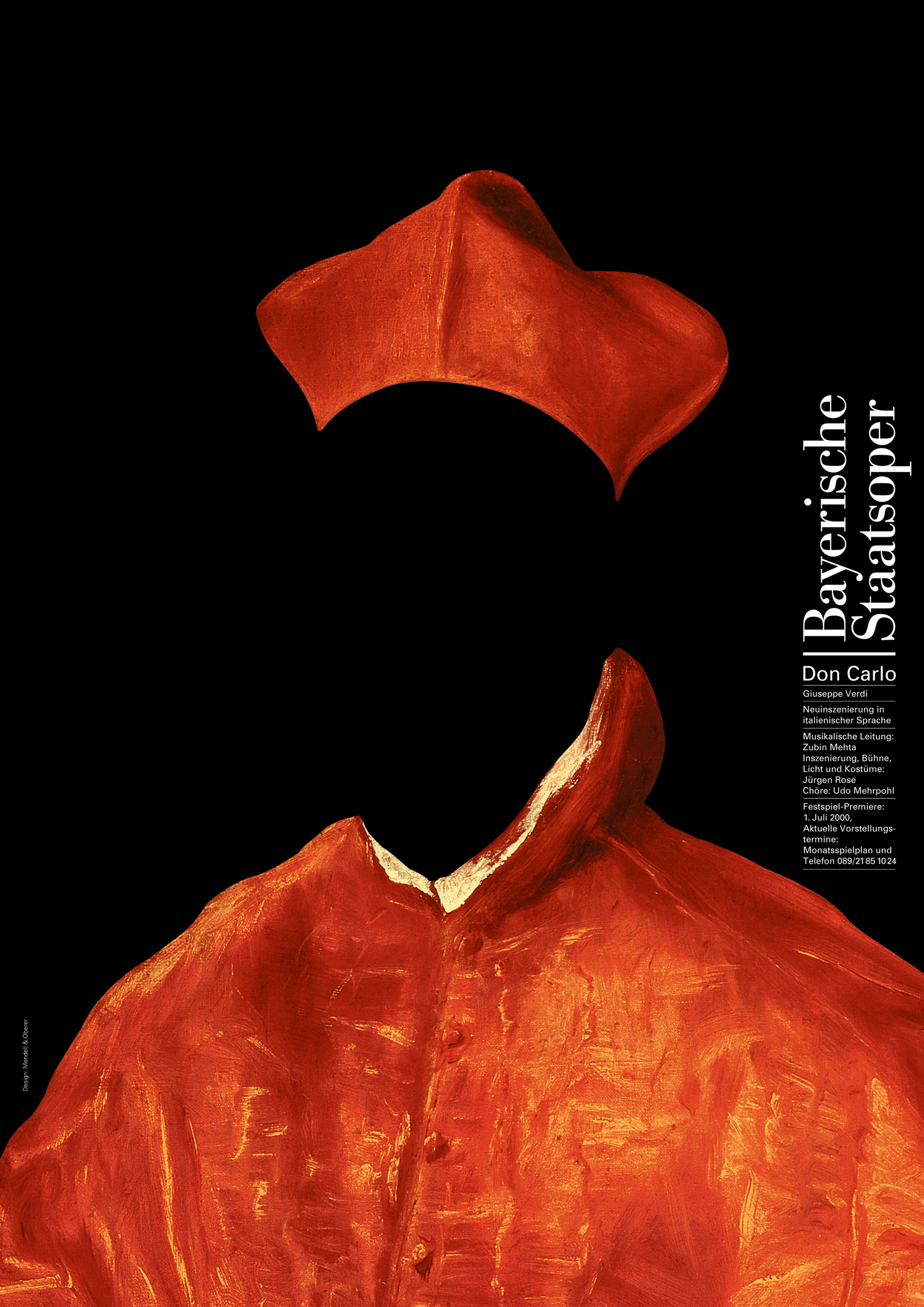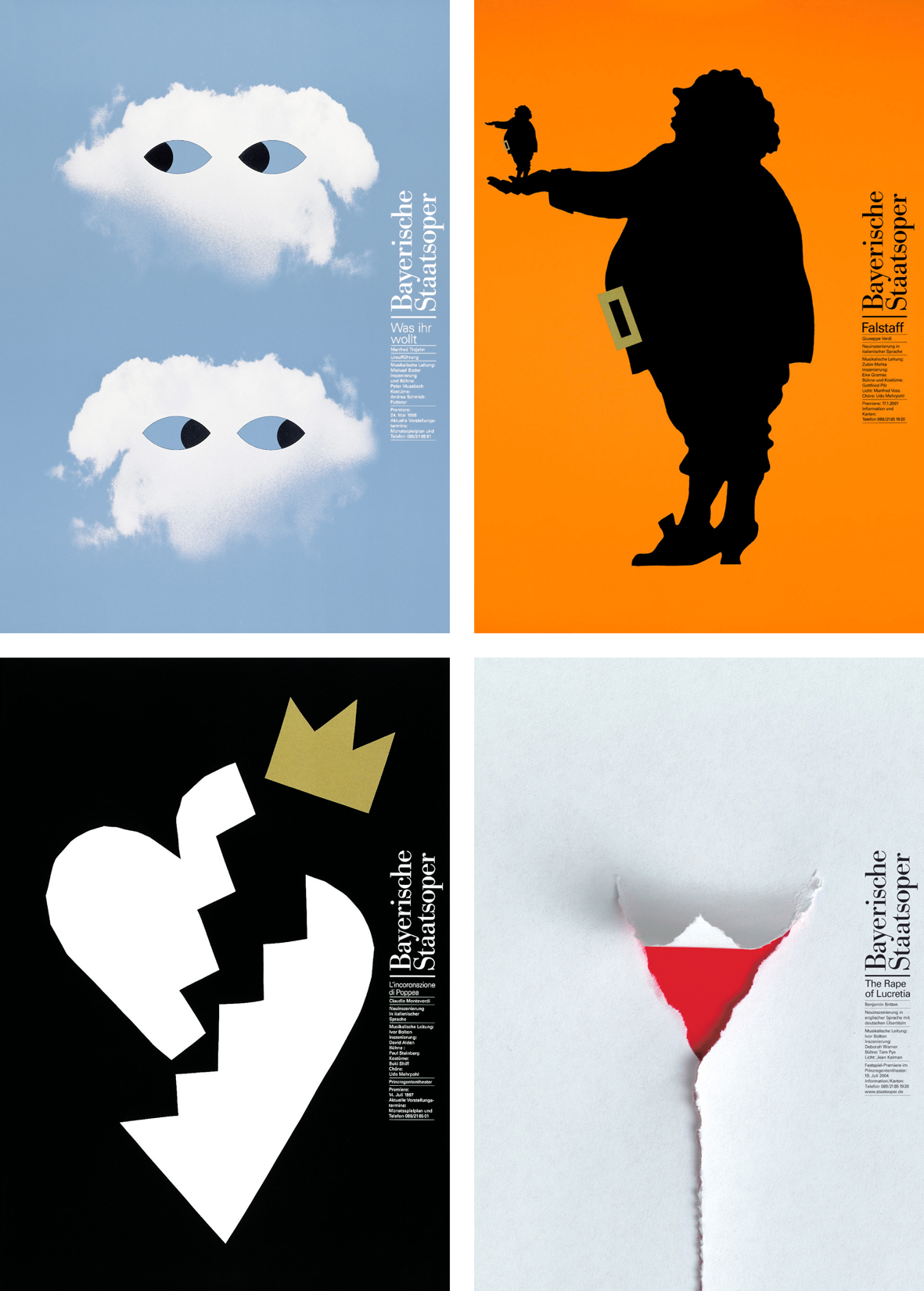 From 1993 to 2006, all posters for Munich’s Bayerische Staatsoper, the Bavarian State Opera, were designed by the late great Pierre Mendell (1929–2008). A master of the conceptual image in the same league as other celebrated German graphic designers such as Hans Hillmann or Gunter Rambow, Mendell devised a very simple and elegant typographic signature, whose location on the right edge of the format allowed maximum room for his visual interpretation of each work.