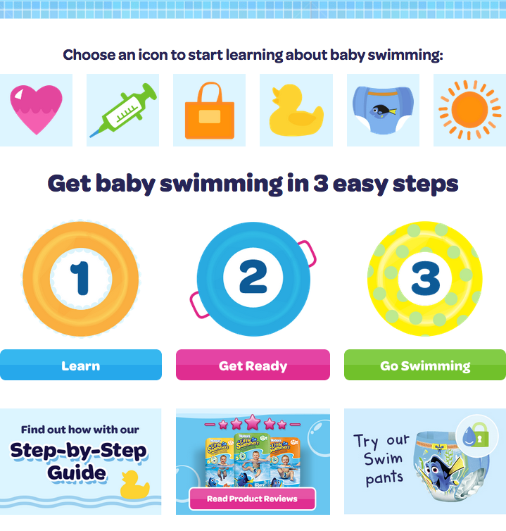The animated microsite for Little Swimmers swim pants makes colorful use of Omnes Bold and Semibold.