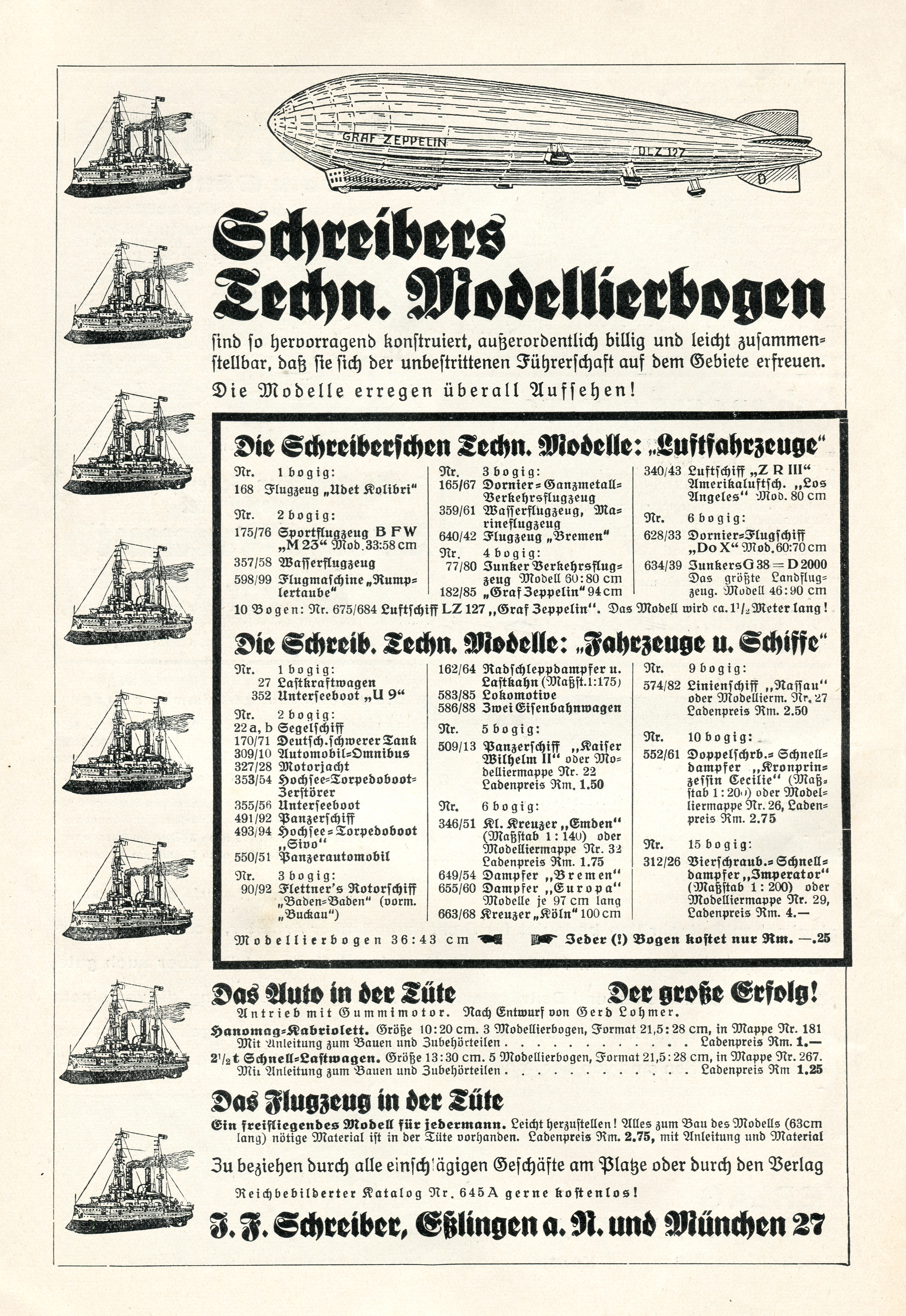This ad for Schreibers Technische Modellierbogen from 1932 lists paper models of various aircraft, automobiles and ships. The Schreiber-Verlag was established in 1831 by Jakob Ferdinand Schreiber in Esslingen, where a museum commemorates the company’s history. The papercraft brand is still in existence.