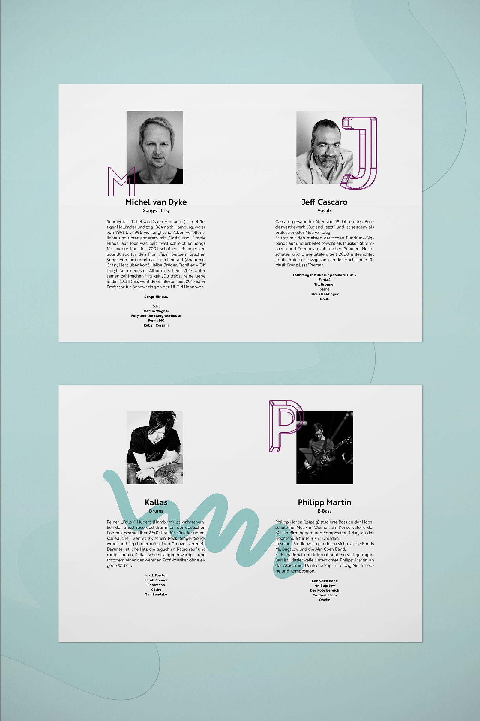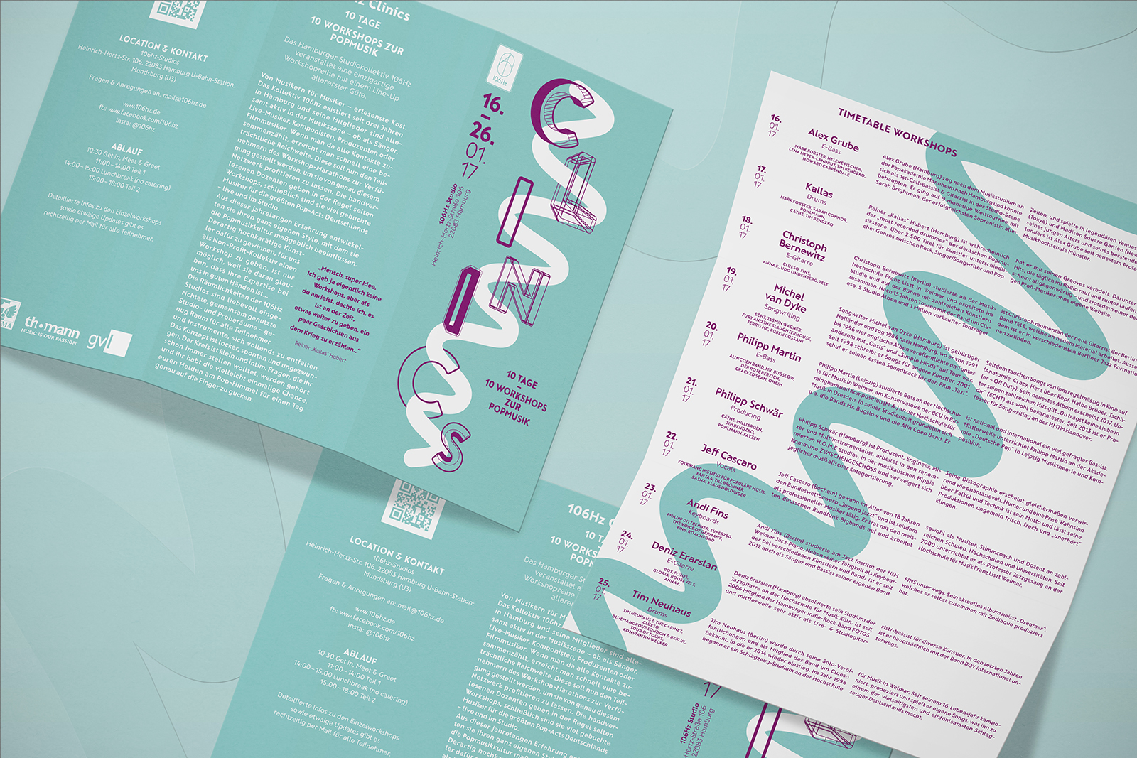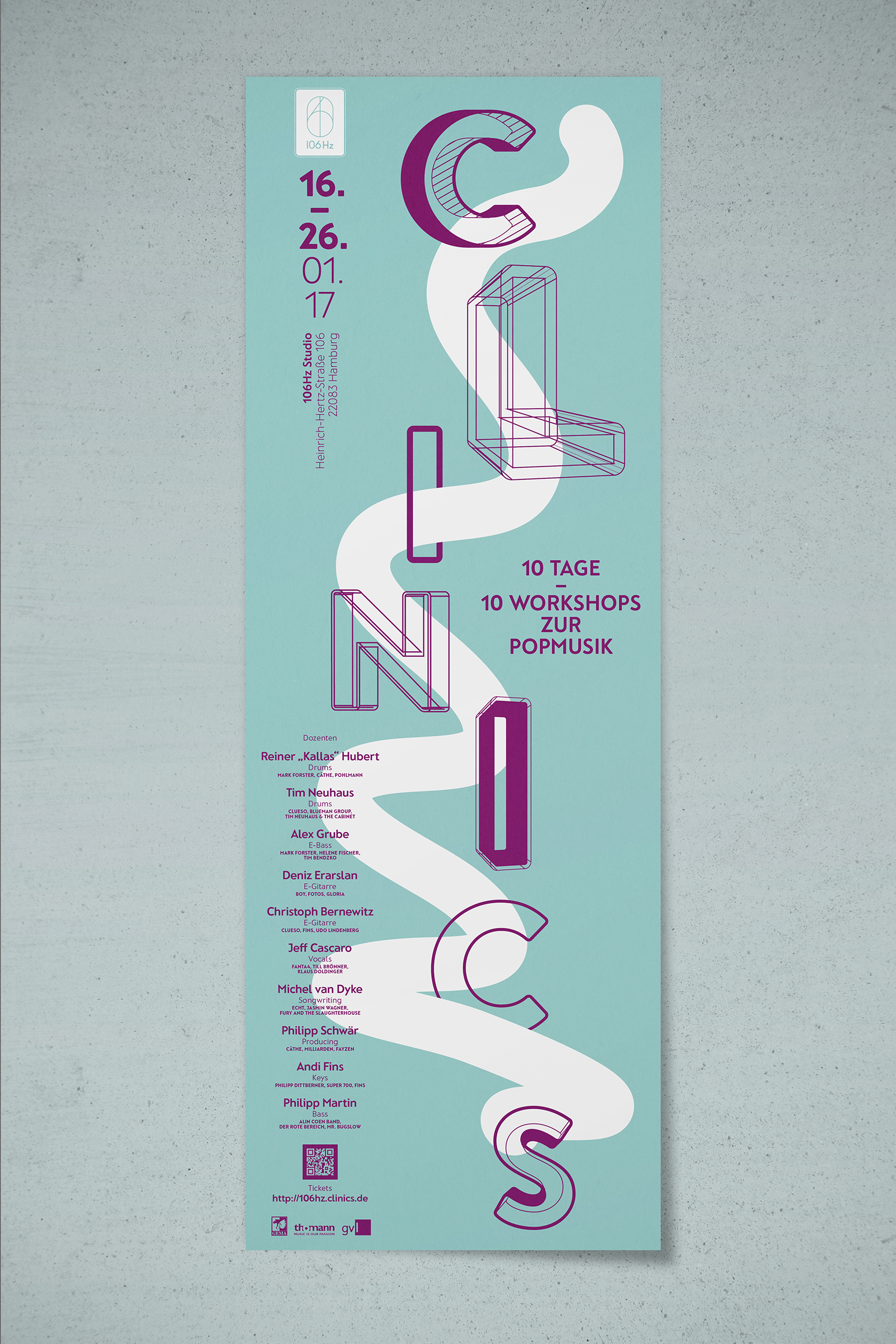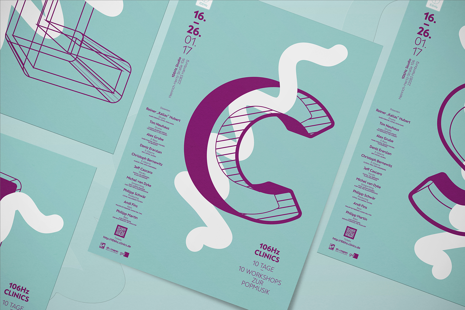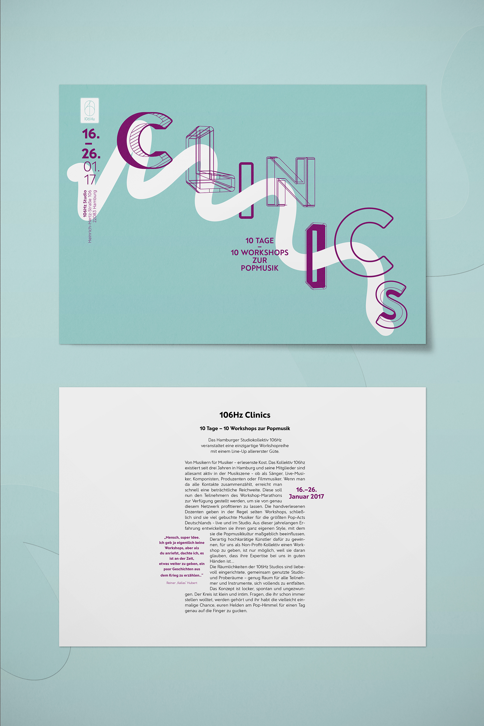 Their very own studios become the location for several workshops – the vibe of a collective formed by passionate musicians and new emerging artists to fill up a building. Tutors are known characters from the German landscape of producers, songwriters, vocalists and instrumentalists who worked for national and international artists and bands. The visual is based on architectural elements to represent the studios which are flown through by the sinus curve, a 106Hz (= Hertz) key element. As related to popular music the visual is meant to have a contemporary speech in typography and colour.