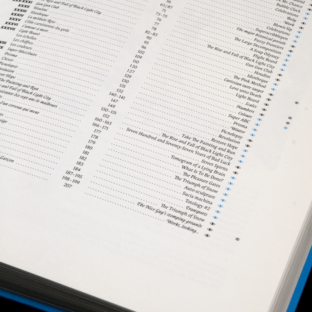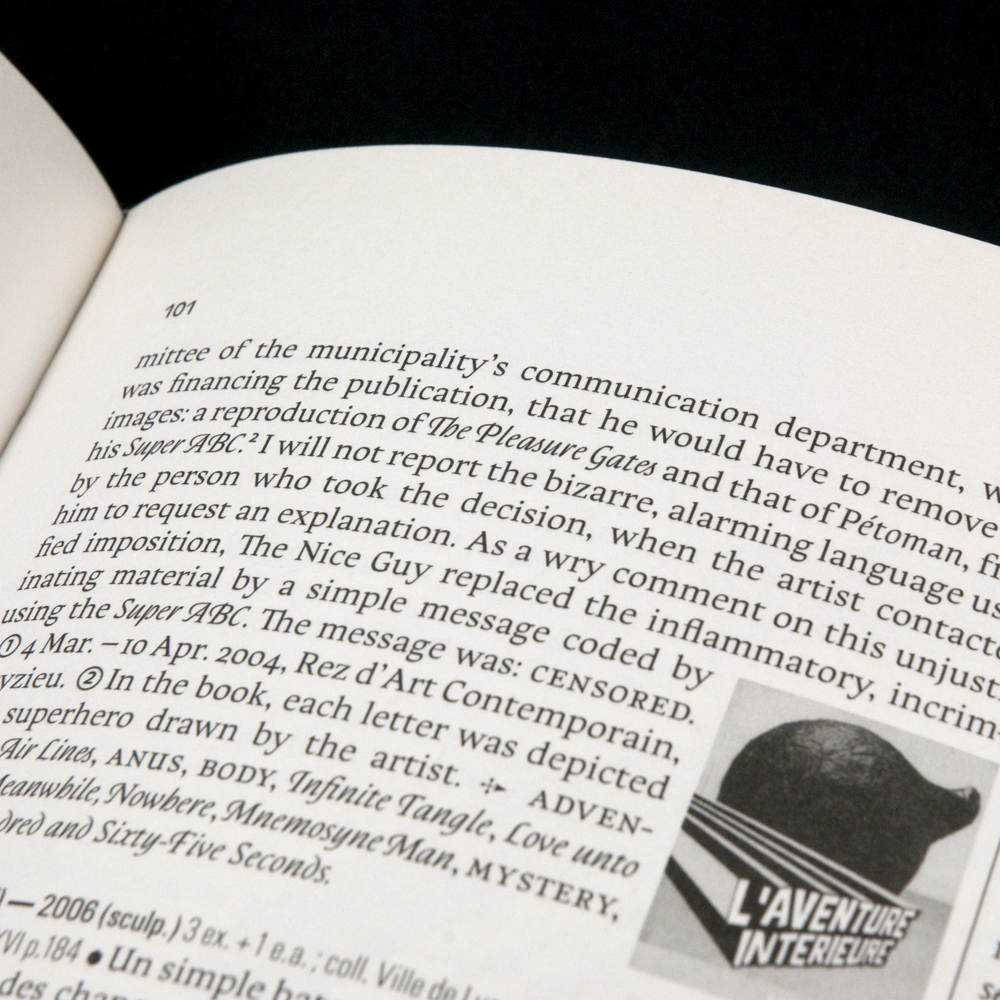 This book is a tribute to Le Gentil Garçon’s (“The Nice Guy”) childhood passion for encyclopedias. Many articles by different contributors and artists are collected, as well as maps and a timeline showing the places where the artist exhibited and worked, along with the cultural contexts and historical events that influenced his work. The design by Huz & Bosshard plays with the structure of an encyclopedia.