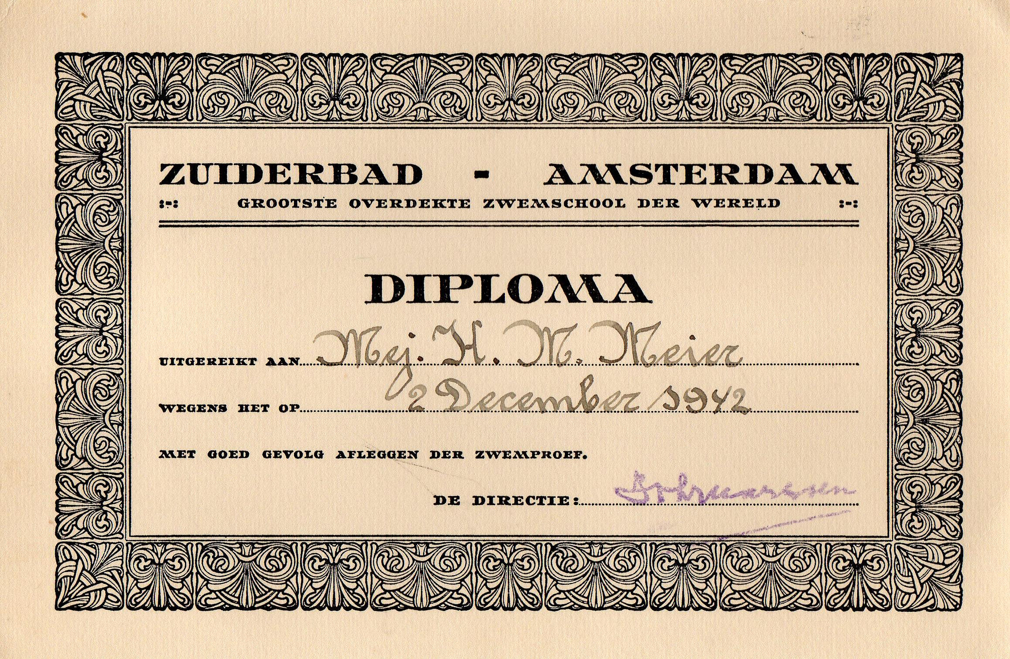 My mother’s swimming certificate from Dec 1942. It really helps: a month later she was married! Zuiderbad then was the largest covered swimming school in the world.