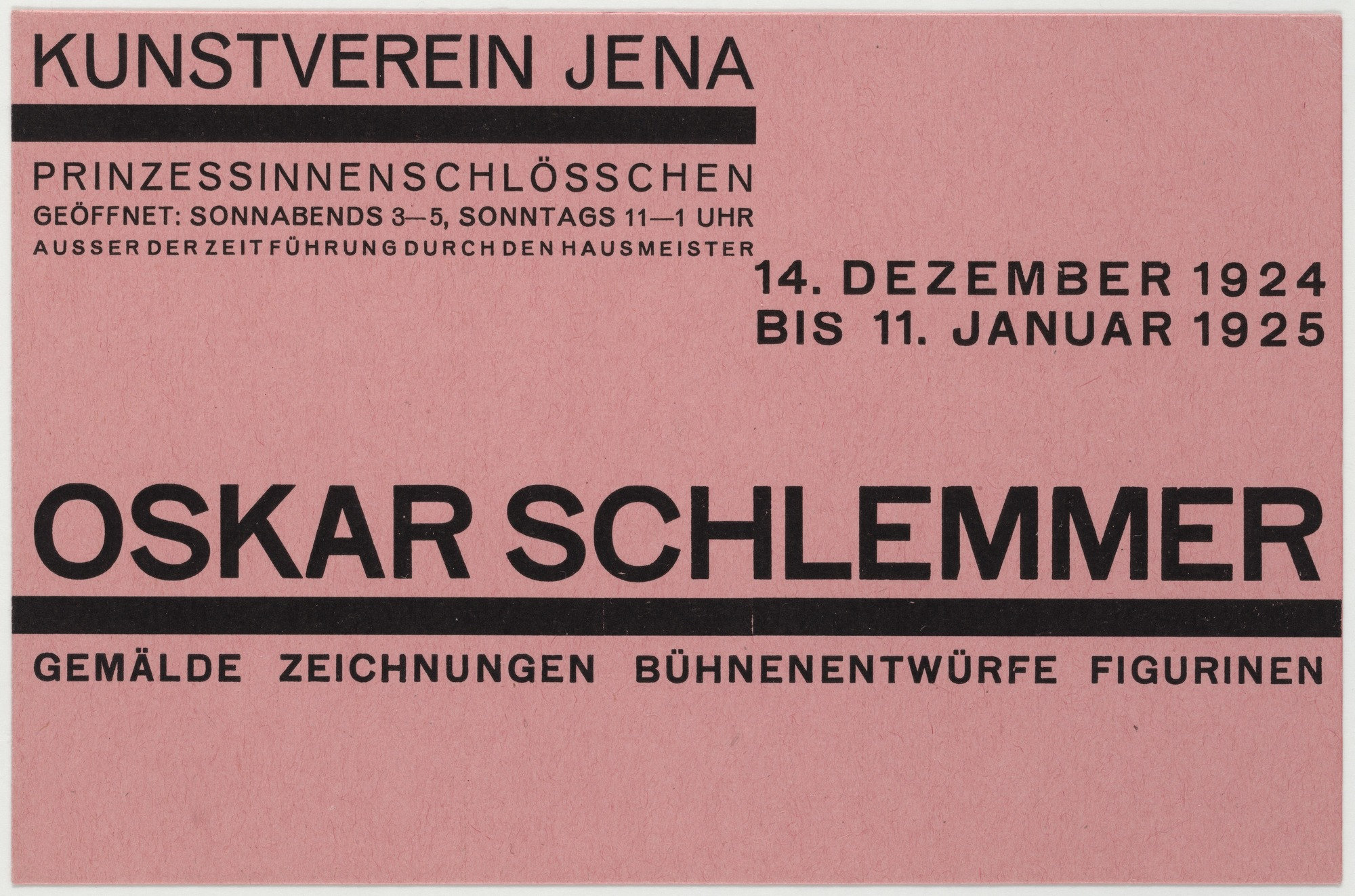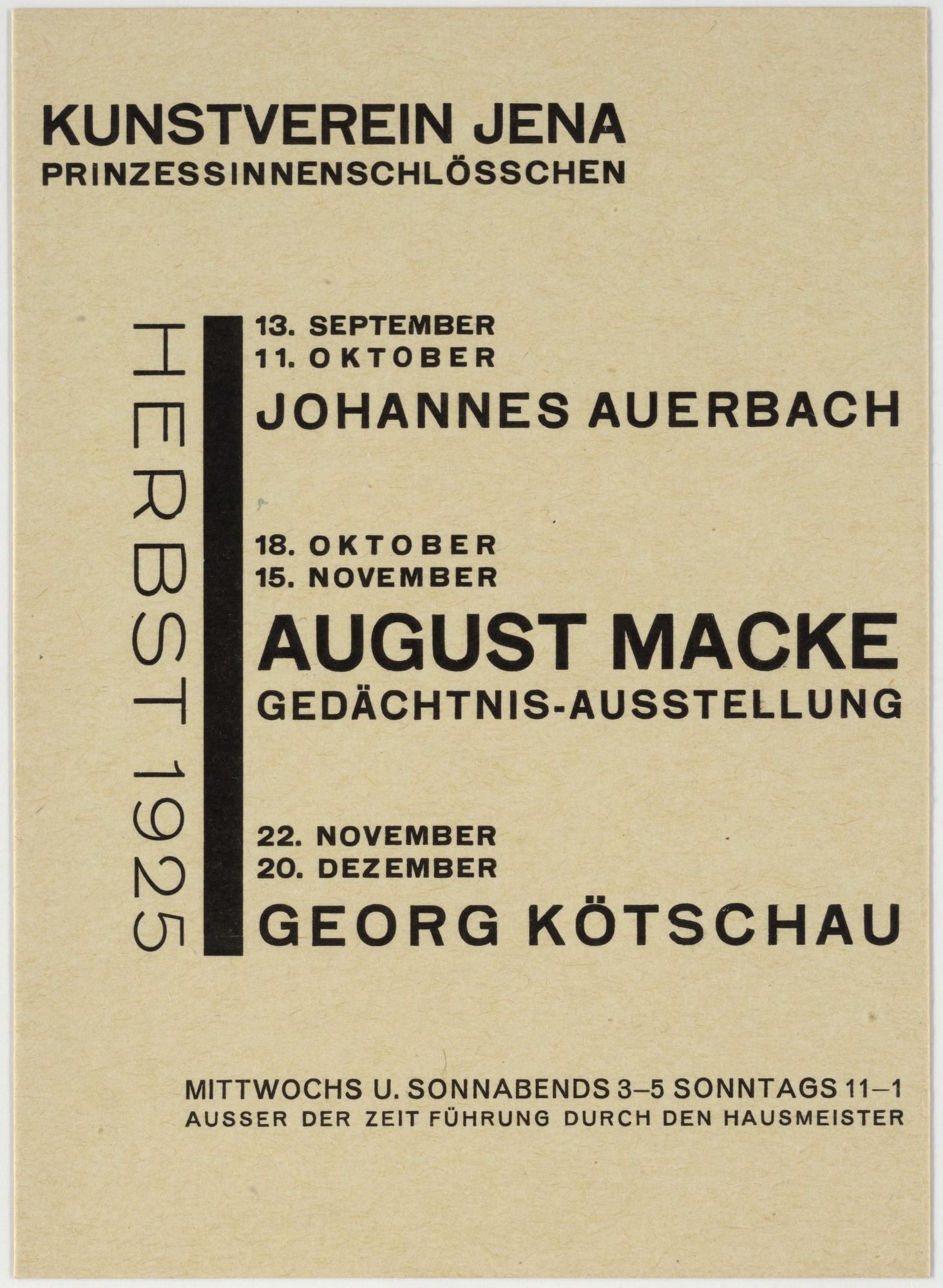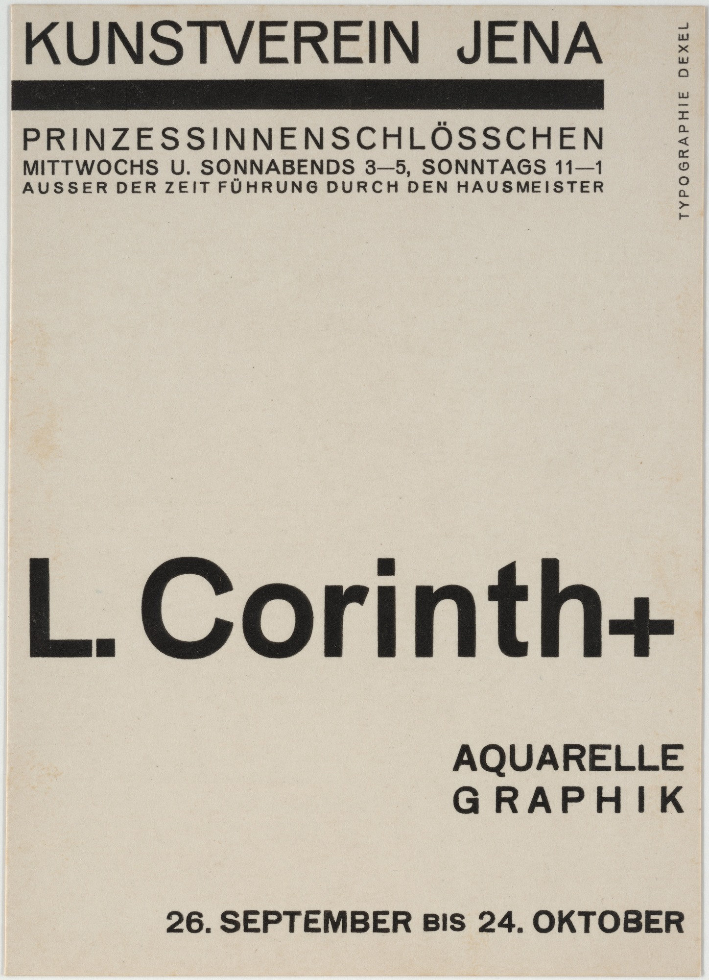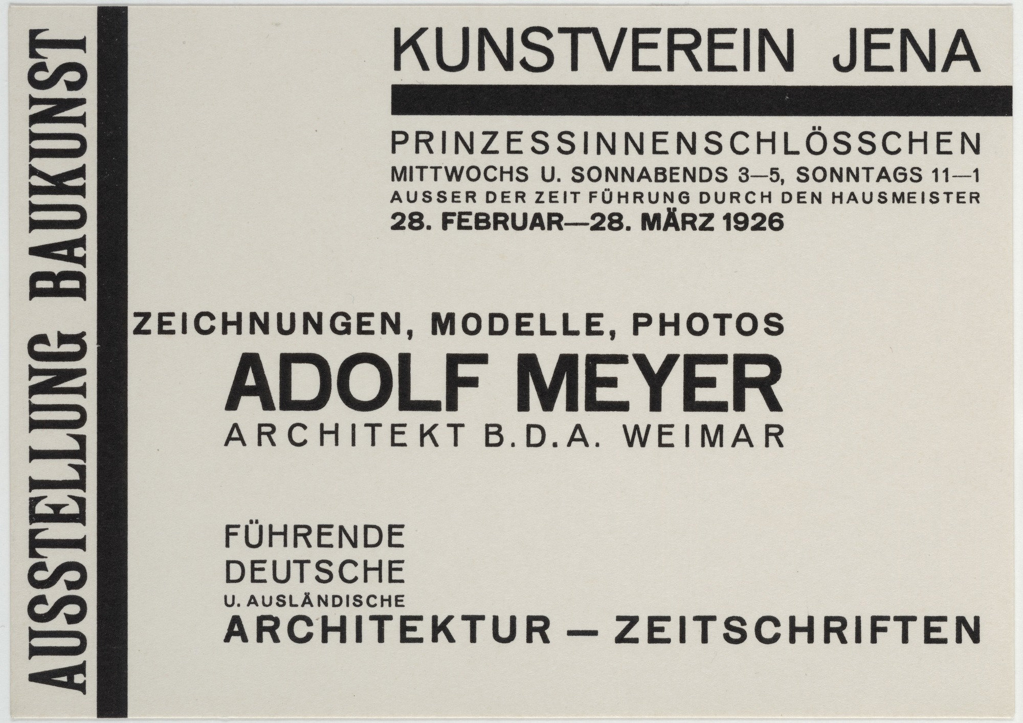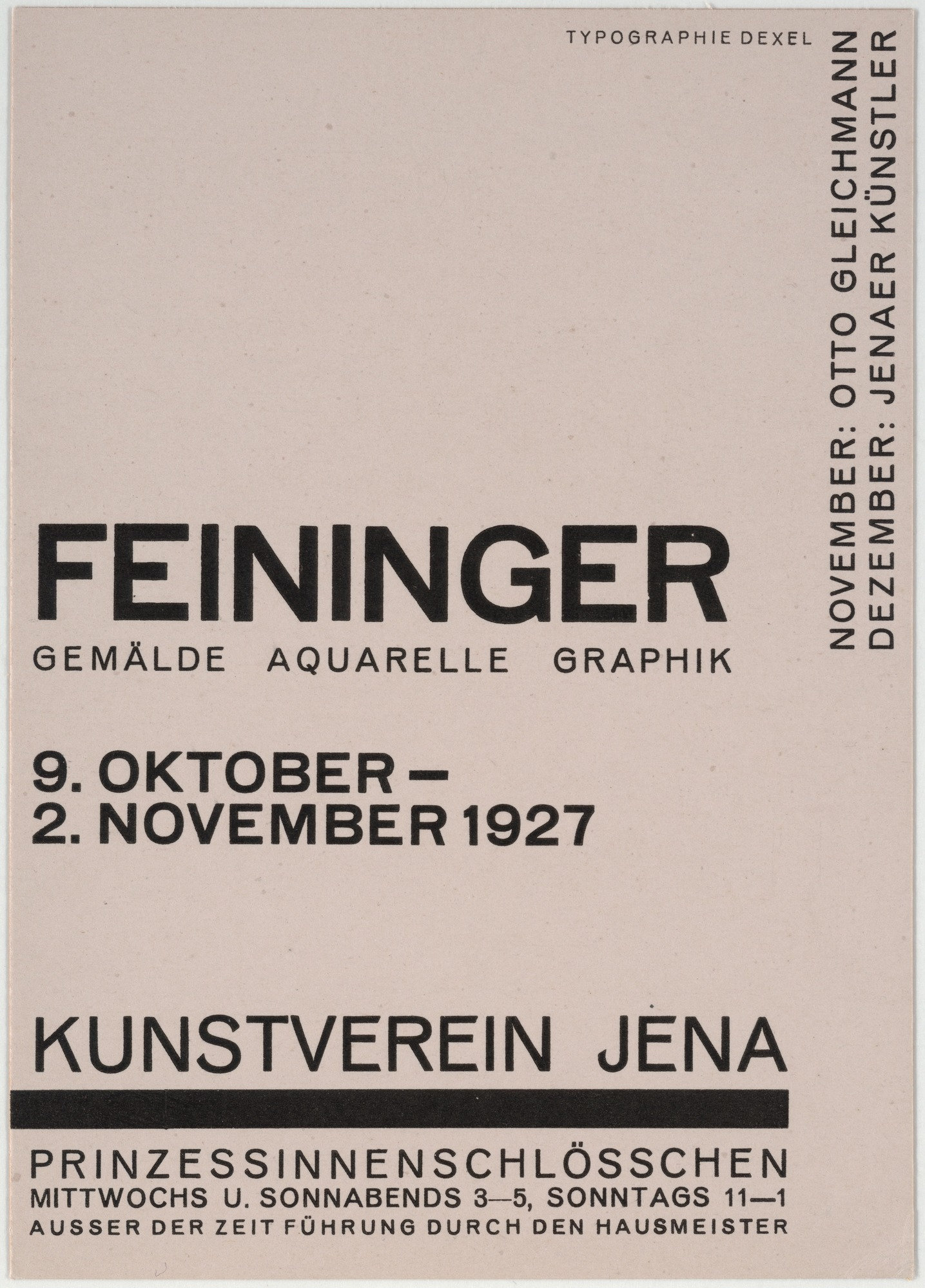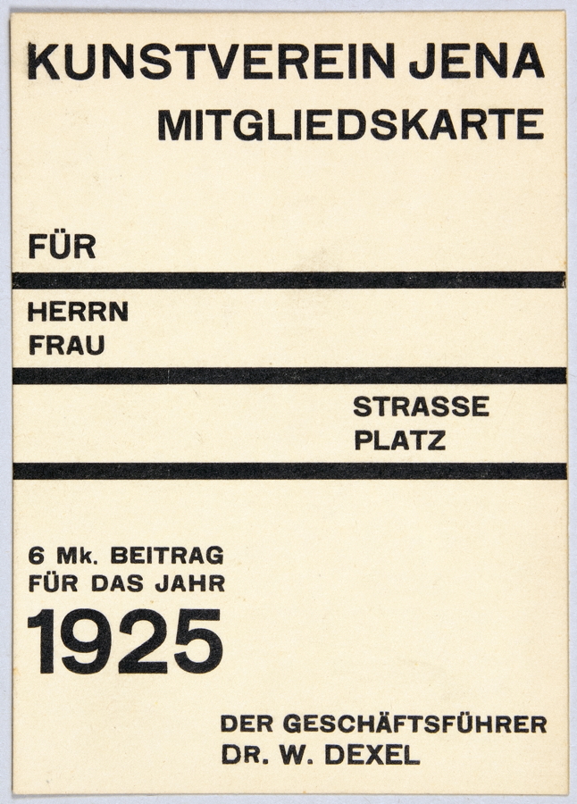 Kunstverein Jena (Jena Art Association) was founded in 1903. In some of its early years, the organization held exhibitions at the Bauhaus in nearby Weimar, and later they were shown in Jena at the Prinzessinnenschlösschen (also known as the Griesbachsches Gartenhaus). This series of 10.5 × 14.9 cm handbills, designed by exhibition director Walter Dexel, is a fine example of the “new typography” promoted by László Moholy-Nagy at the Bauhaus in 1923. Paraphrasing Dexel from his contribution to Bodo Rasch’s 1930 Der gefesselte Blick (The Shackled View):