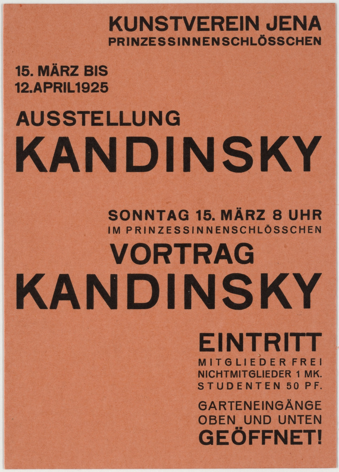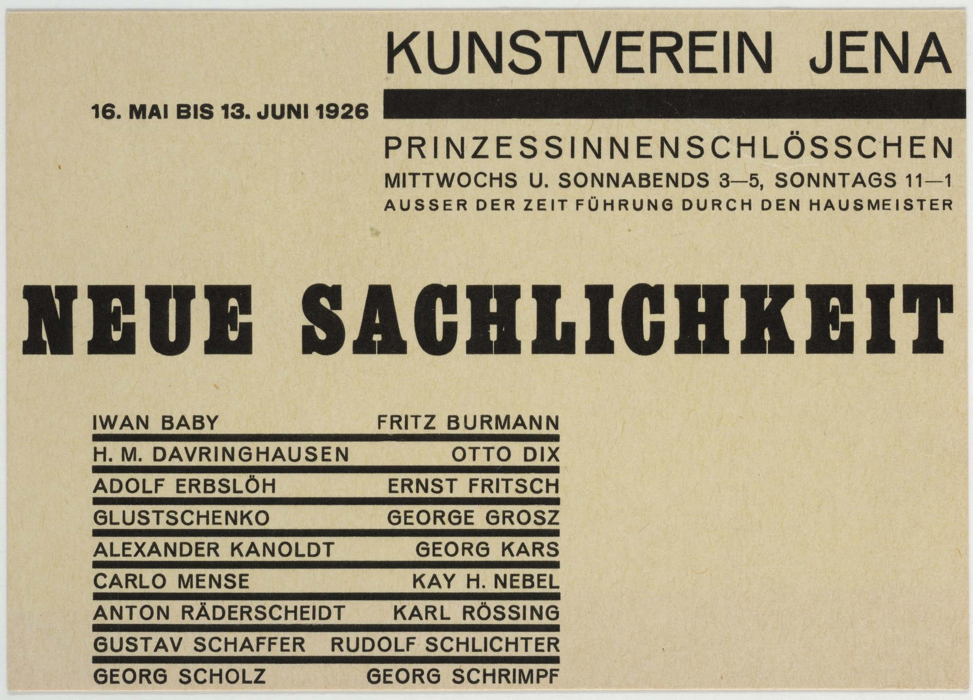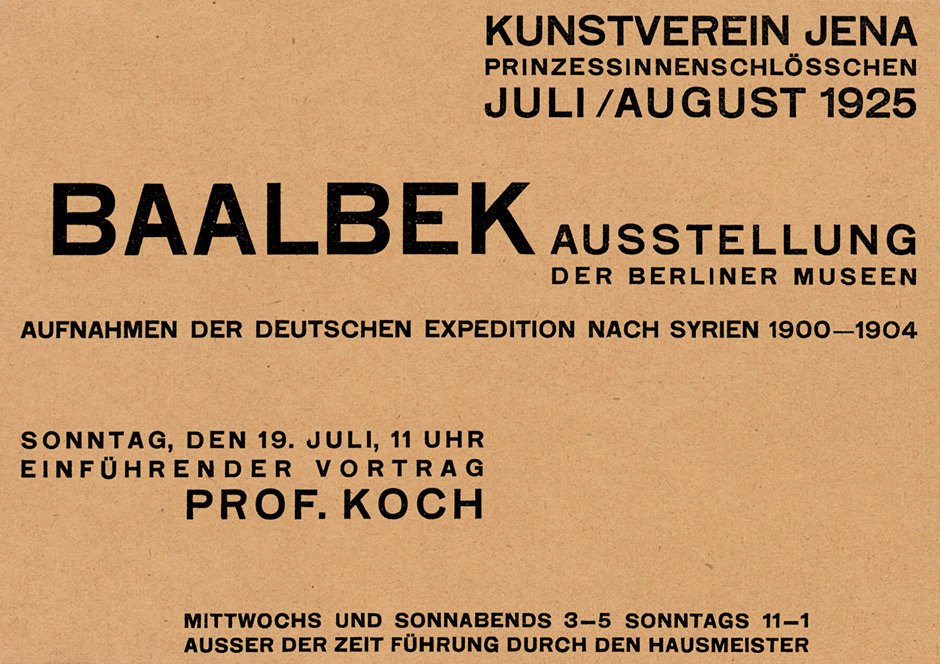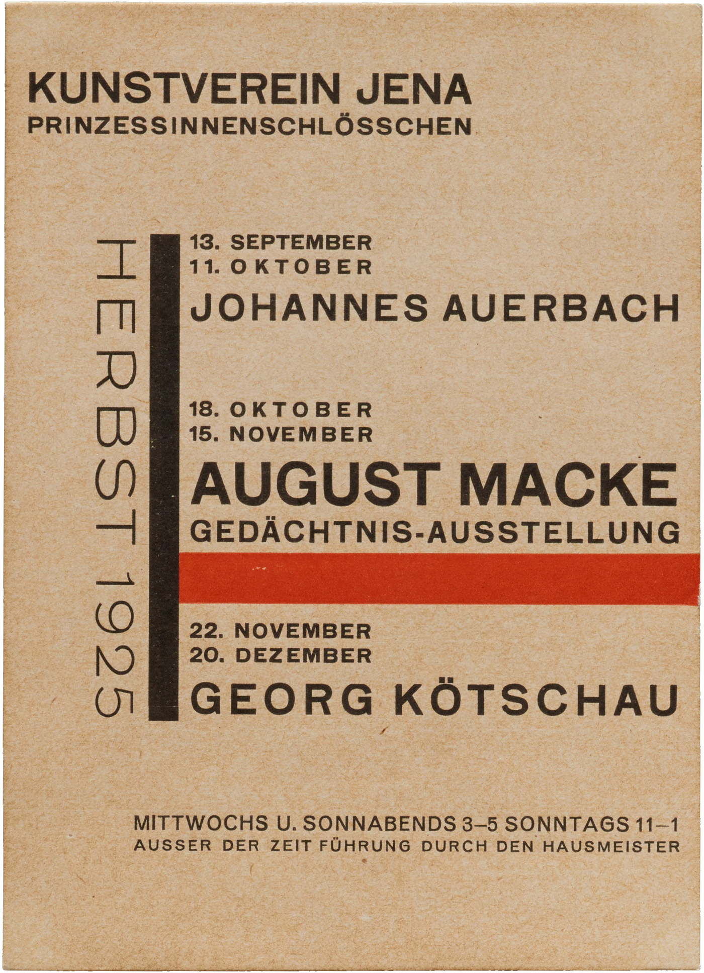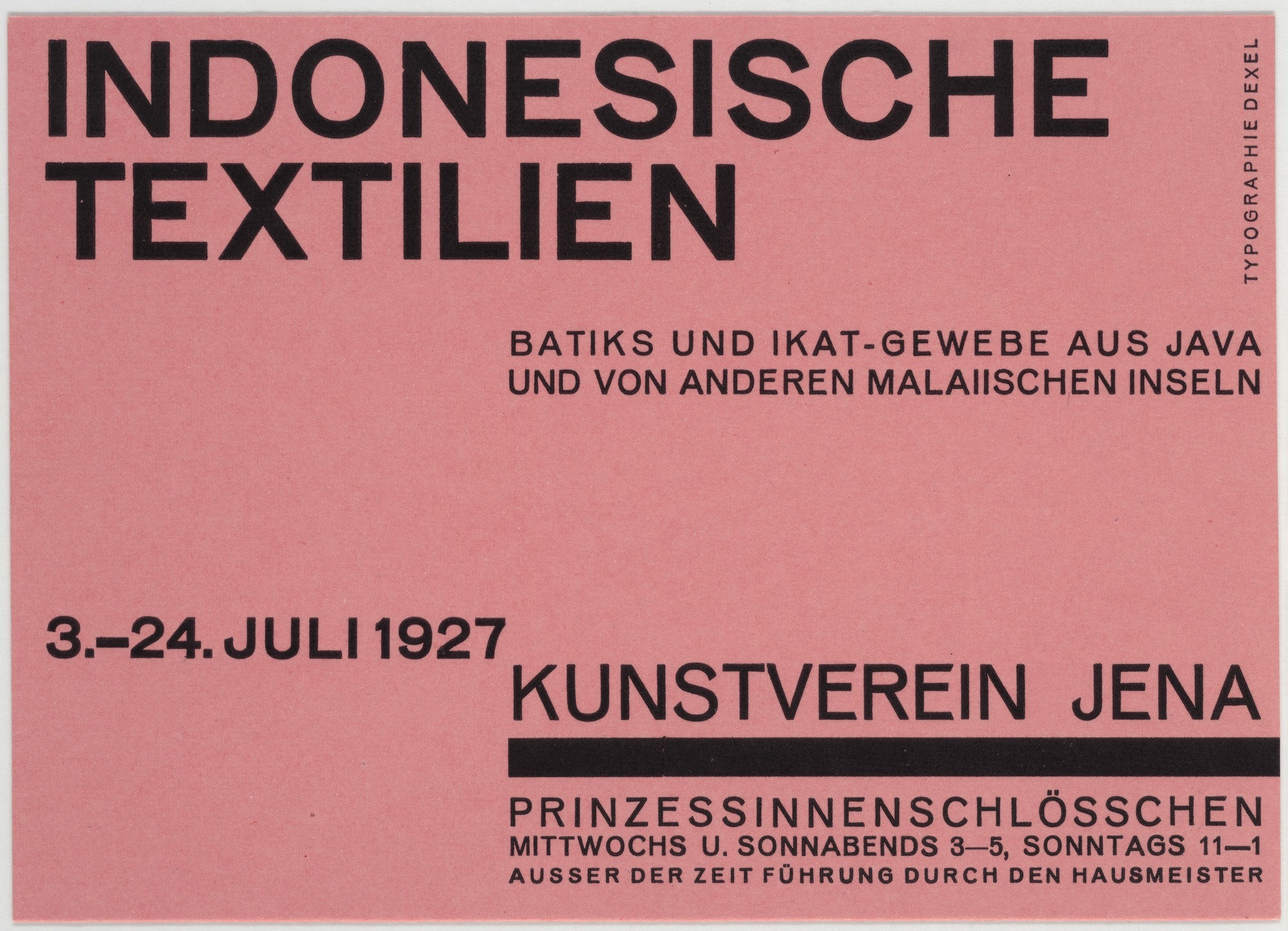 Kunstverein Jena (Jena Art Association) was founded in 1903. In some of its early years, the organization held exhibitions at the Bauhaus in nearby Weimar, and later they were shown in Jena at the Prinzessinnenschlösschen (also known as the Griesbachsches Gartenhaus). This series of 10.5 × 14.9 cm handbills, designed by exhibition director Walter Dexel, is a fine example of the “new typography” promoted by László Moholy-Nagy at the Bauhaus in 1923. Paraphrasing Dexel from his contribution to Bodo Rasch’s 1930 Der gefesselte Blick (The Shackled View):