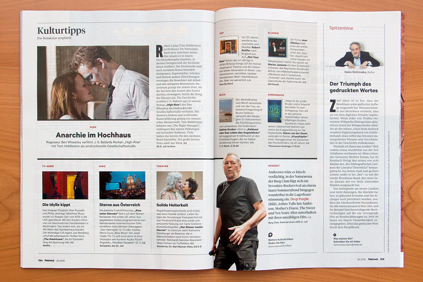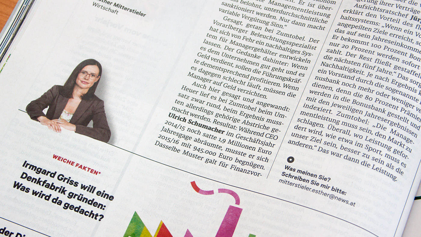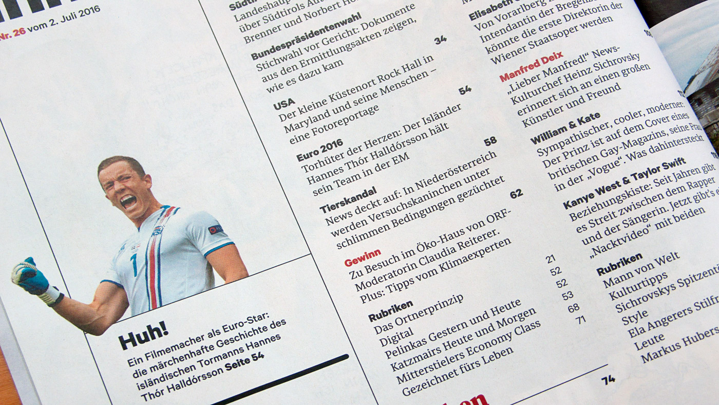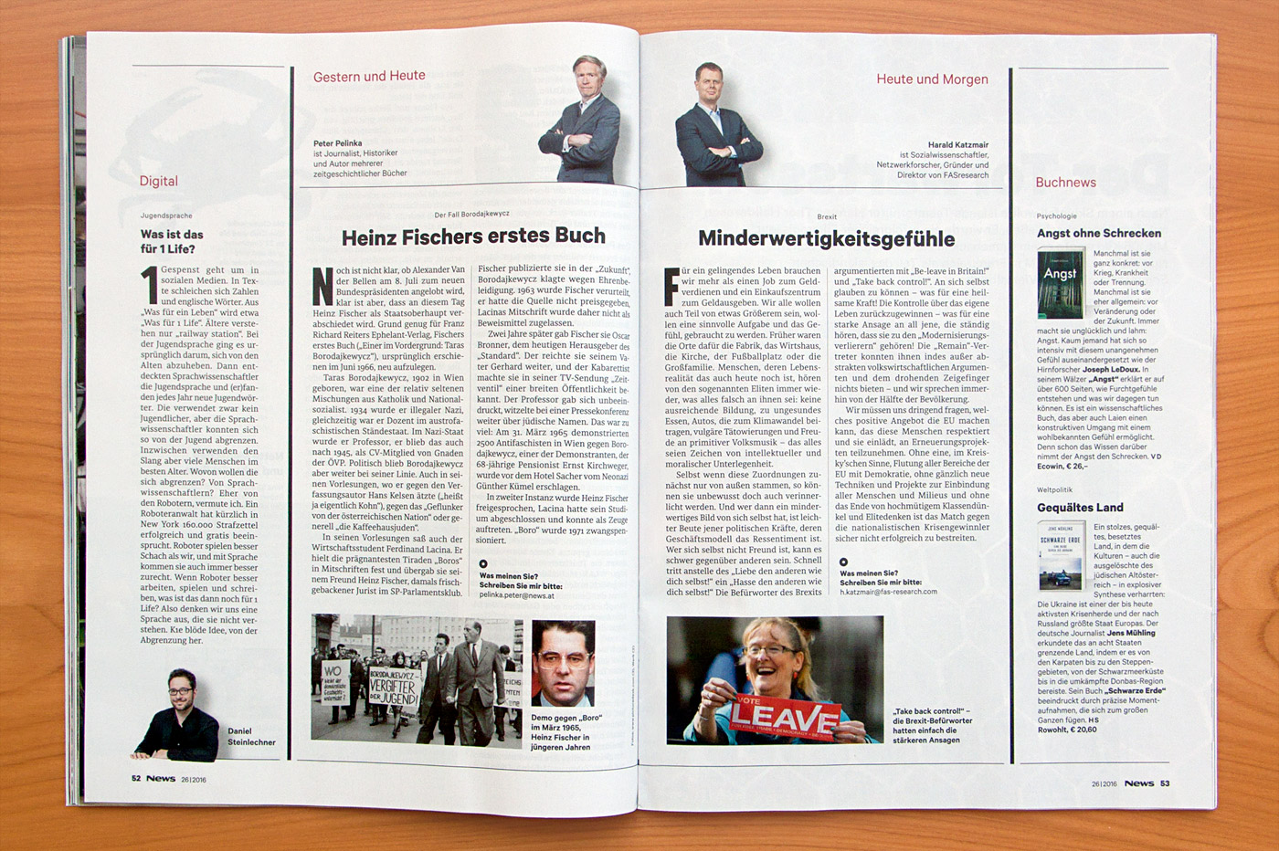 News is one of Austria’s biggest weekly magazines and the major news magazine in the country. It has a circulation of about 160,000 copies and covers various topics such as politics, business, culture, and sports. In July 2016 News introduced its revised design based on a new typographic palette. Sindelar is used as the primary text face in combination with Calibre and Tiempos Headline.