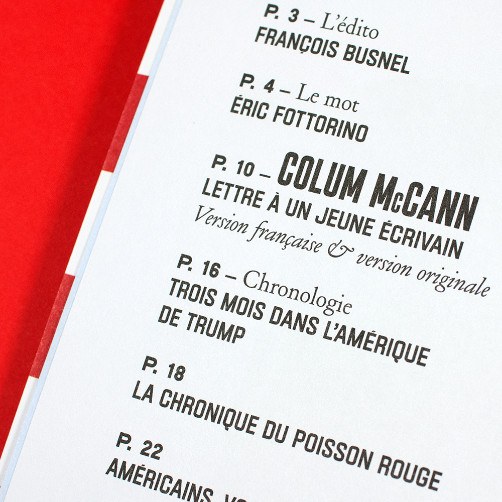 America (“America like you have never read it”) is a quarterly bulletin about the United States of America as led by Donald Trump. This publication will exist for four years, the same timespan as Trump’s presidential mandate. It comprises one long interview with an American writer, some news reports, investigations and more.