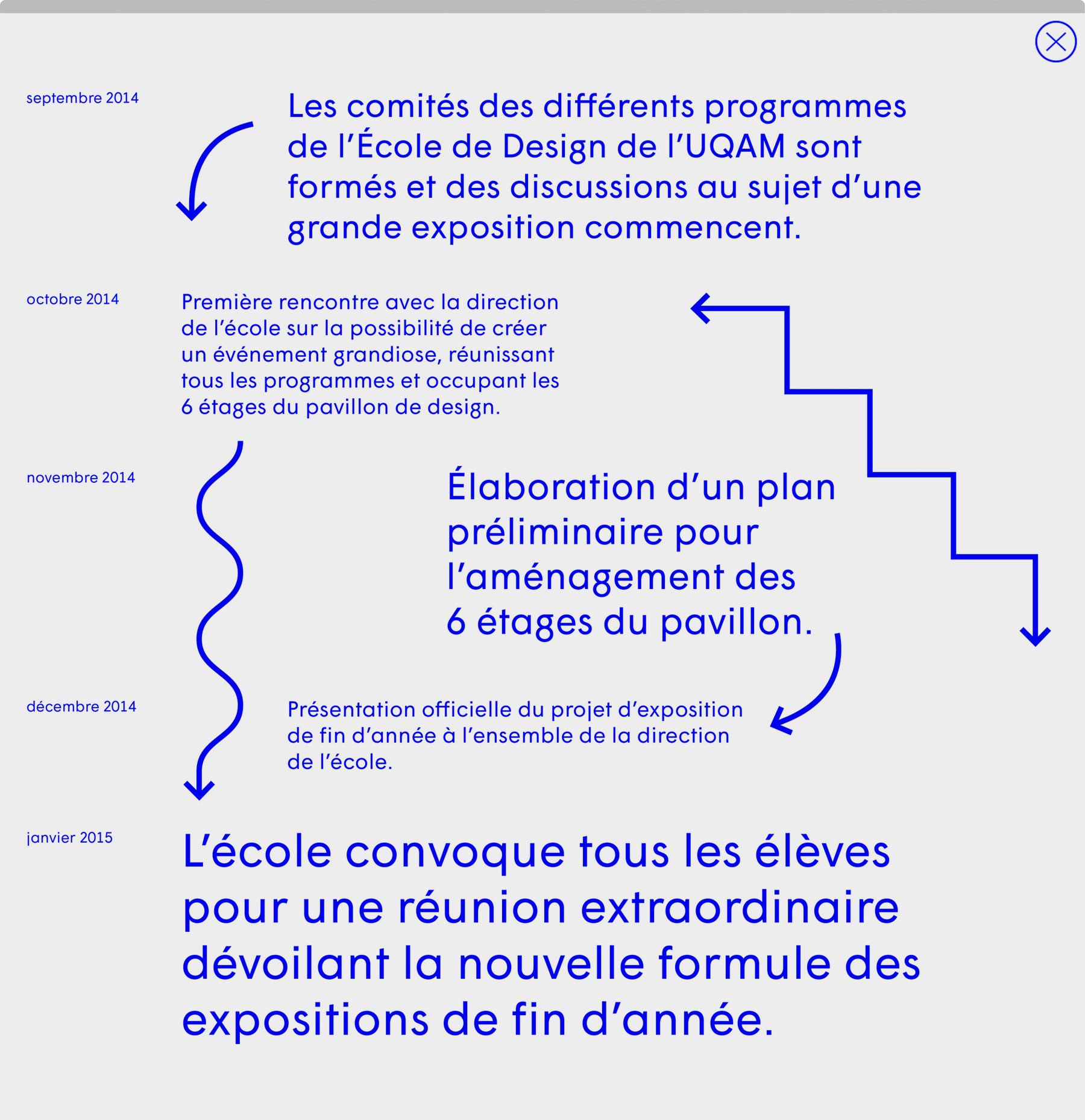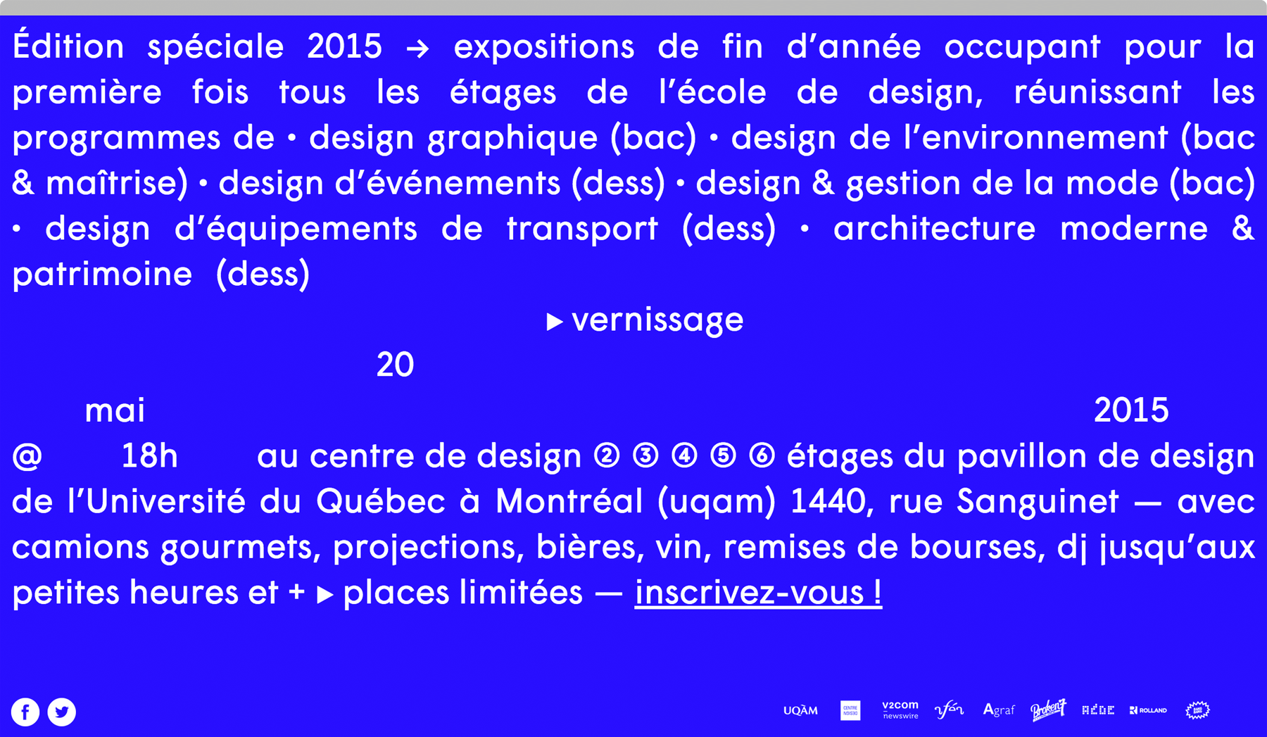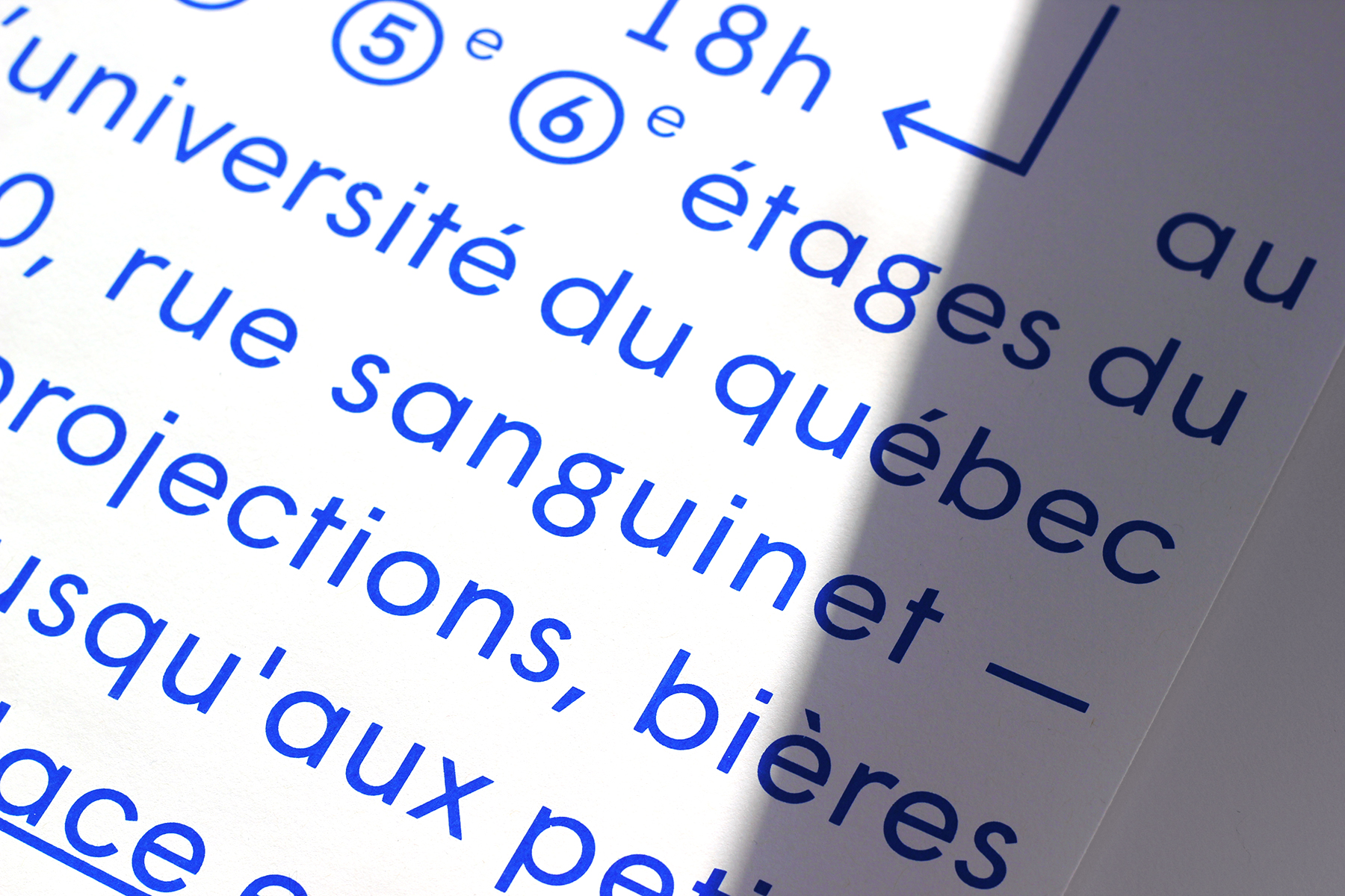 End of year design graduates exhibition from l’Université du Québec à Montréal. This special edition brought together all academic programs of the school of design for the first time ever. Wigrum Regular, from FEEDTYPE, is the foundation for this flexible identity, designed to develop on top of an unstable and ever-changing situation caused by a student strike.