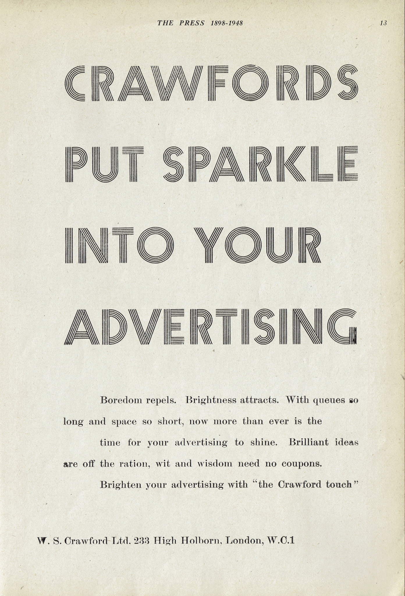 W S Crawford’s were one of the UK’s most influential advertising agencies during the 20th Century — due to its founder, W Crawford and its long-lived artistic director Ashley Havinden. Based in London’s High Holborn their stylish office at 233 High Holborn survives with its art-deco exterior now sadly knocked about a bit as a branch of a fashion chain — only the stainless steel numerals ‘233’ mark the facade out. The lettering and layout of this advert is very Havinden.