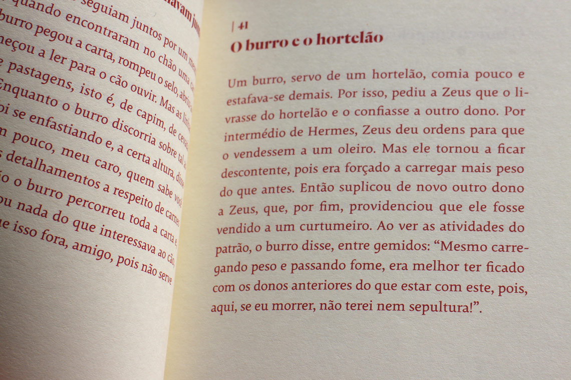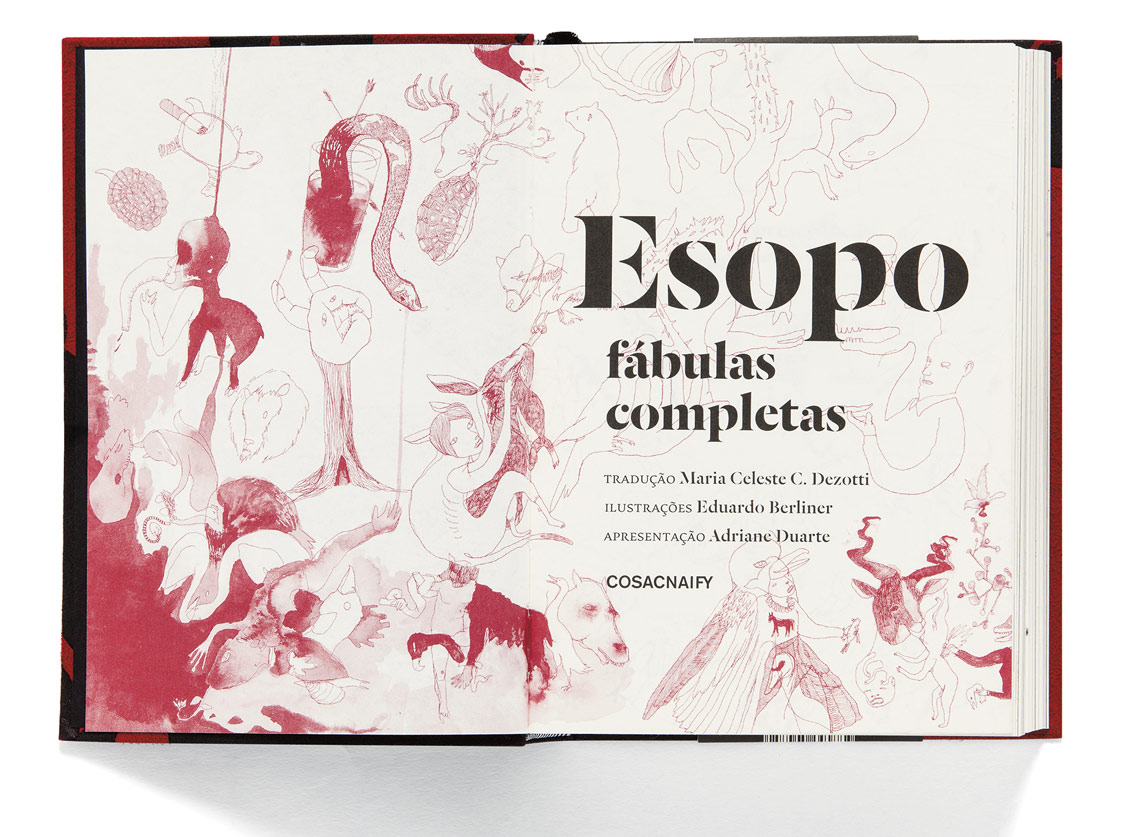 In 2013 the late São Paulo based imprint Cosac Naify* published a new version of the Aesop’s Fables: Esopo. Fábulas Completas. For this publication 383 fables were translated from Greek (by Maria Celeste C. Dezzotti), including some fables hitherto unknown in Brazil. The book, designed by Flávia Castanheira, was beautifully illustrated by Eduardo Berliner, giving to the Aesop’s fables a contemporary interpretation.
