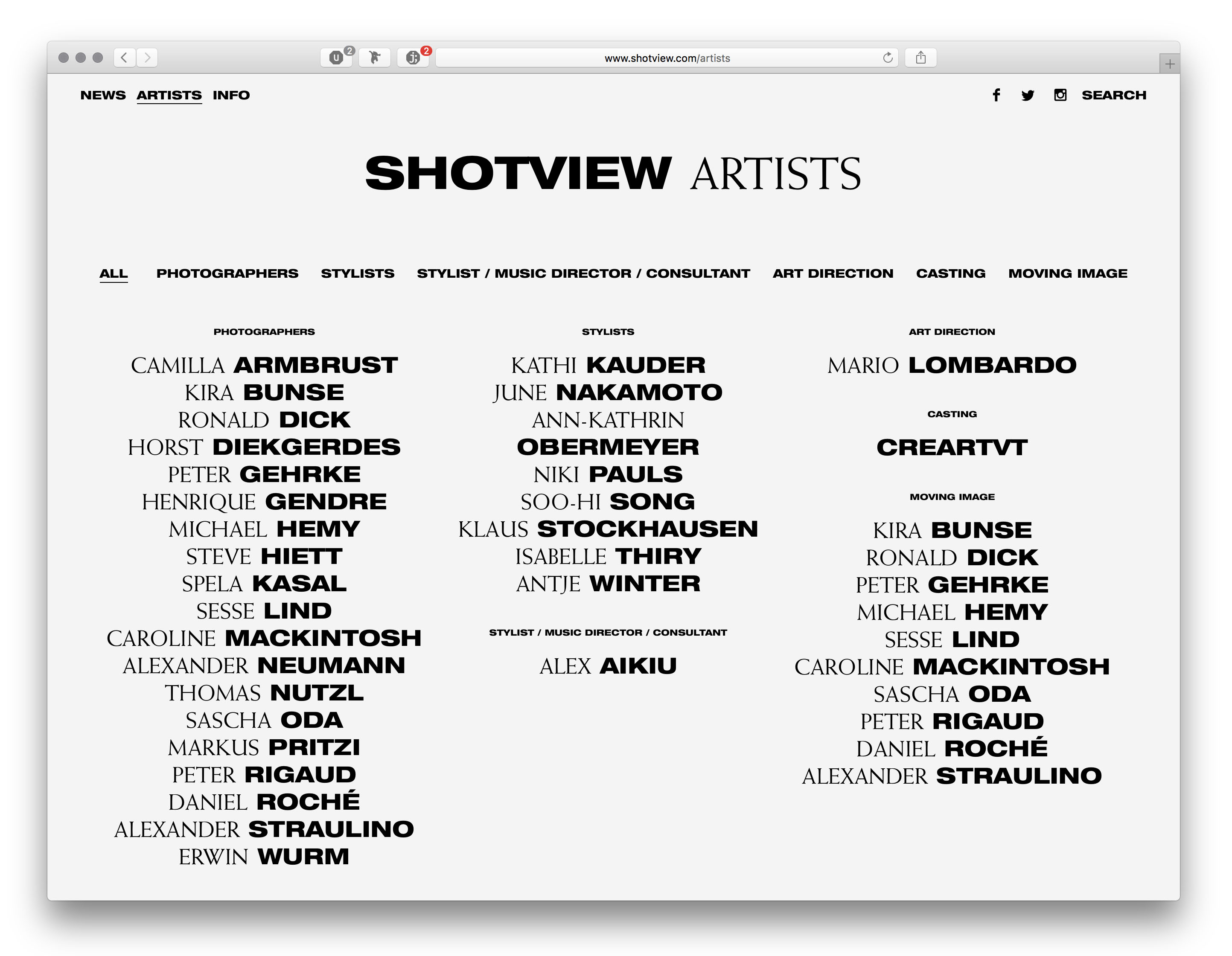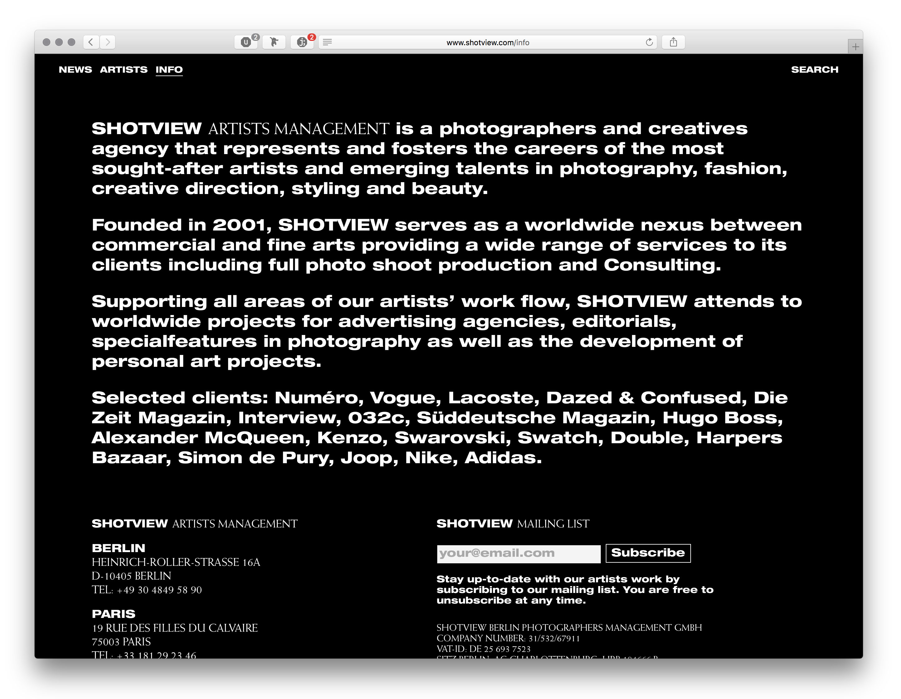 For the portfolio website of Berlin based artist management Shotview, agency YES employ a bold, compemporary aesthetic of loud and full-bleed images. While I’m sure the idea is to showcase the photography more than anything, what stands out to me is the use of all-caps Weiß-Antiqua. Here, it feels more like a Germanic companion to Canela rather than a relic of the 1920s.