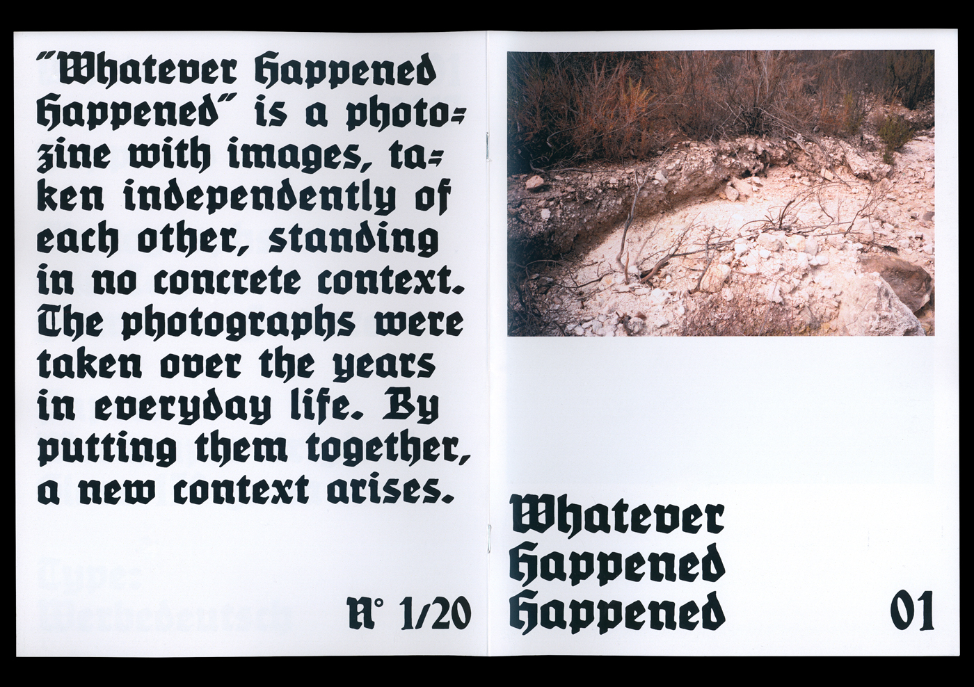 Whatever Happened Happened, issue 1 Contributed by Francesco Futterer on Apr 26th, 2017. Artwork published in January 2017. Source: francescofutterer.de Photo: Francesco Futterer. License: All Rights Reserved. Photozine with photographs taken over the years, standing in no concrete context. By putting them together, a new context arises. Self-published, edition of 20. Typefaces More about WerbedeutschGet Werbedeutsch Formats Magazines/Periodicals (1816) Topics Graphic Design (2958) Designers/Agencies Francesco Futterer (3) Tagged withphotography (946)zines (158)one typeface, one size (408)blackletter (305)self-initiated projects (423)limited editions (424)loose wordspacing (46)big type (1707)Whatever Happened Happened (2) Artwork location Germany (3790) Heidelberg (31) In SetsContemporary German Blackletter (Florian Hardwig) (14)goth (jean-alexandre Jean) (52) Post a comment Name Email – will not be published Website Your response Submit Comment More in Graphic Design Joseph Binder Award 20222022HammerAlbrechtLeft StudioVincent WagnerContributed by HammerAlbrecht Graphic Happiness2013Trapped in SurburbiaContributed by Indra Kupferschmid Staff Pick Historia del diseño en América Latina y el Caribe2008Fabián GoyaCarlos VenancioMarcaContributed by PampaType Team Sponsor More in Magazines/Periodicals Atmos magazine vol. 7, “Prism”2022Eric HuContributed by 205TF Staff Pick Super TV, 1991–19921991unknownContributed by Fernseh dienst Glamour2010Contributed by Font Bureau Pensée magazine2020Cristiano ColaContributed by Cristiano Cola More Fonts In Use Sagmeister & Walsh website2013Stefan SagmeisterJessica WalshSagmeister & WalshContributed by Stephen Coles Staff Pick The Moody Blues – “I’m Just a Singer (in a Rock and Roll Band)” German single cover1973unknownPhoto(s) by Buro Destruct on Flickr. Staff Pick Les Nuits de Saint-Sauveur2018Arnaud AubryContributed by Arnaud Aubry Staff Pick Mens Alors! 20142014Julien LelièvreContributed by Florian Hardwig Staff Pick Festival Teal Brasil2022ESTUDIO CRUContributed by ESTUDIO CRU Staff Pick Esquire’s Big Watch Book, issue 12015EsquireNick MillingtonPeter AinsworthContributed by Florian Hardwig Staff Pick Beatmaster – “Lipservice” single cover1984Steven MiglioMonica LynchContributed by Florian Hardwig Staff Pick 26. Bundespreis für Kunststudierende catalog2023Manuel BauerJonathan KörnerNicolai ZeiherContributed by Erkin Karamemet Staff Pick