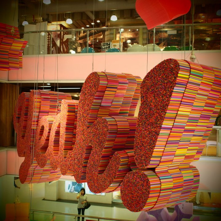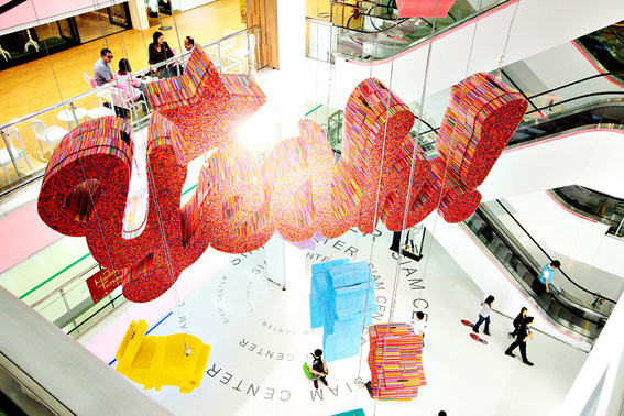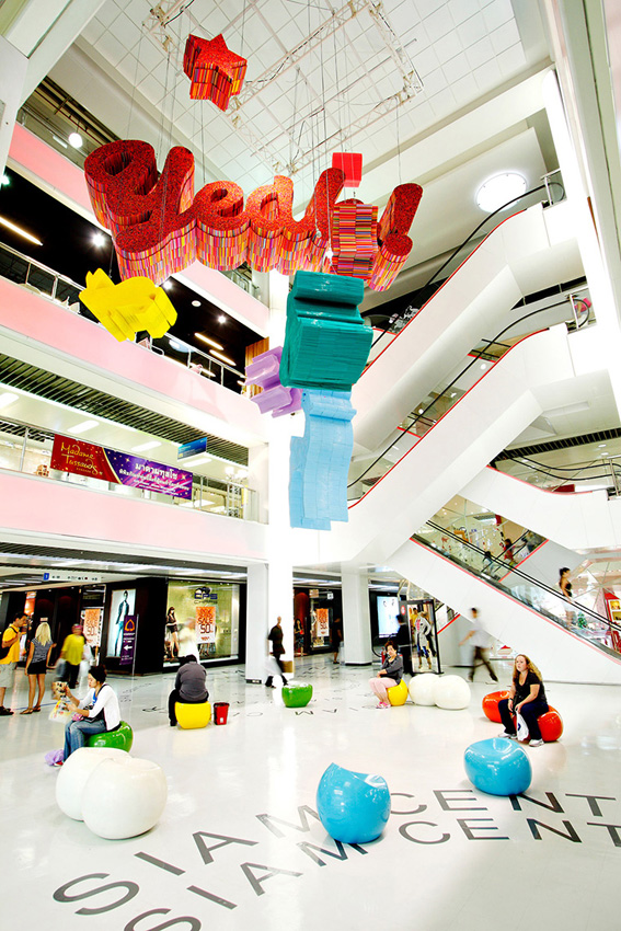 Christmas & New Year decoration for Siam Center. We created hanging installation made by used drinking straws–these colourful plastic tubes act as the building blocks of larger shapes and words, which will bring the spirit of the Christmas season into this 3 dimensional installation. This installation tried to emphasize the idea that nearly anything has a second life and can be reused.