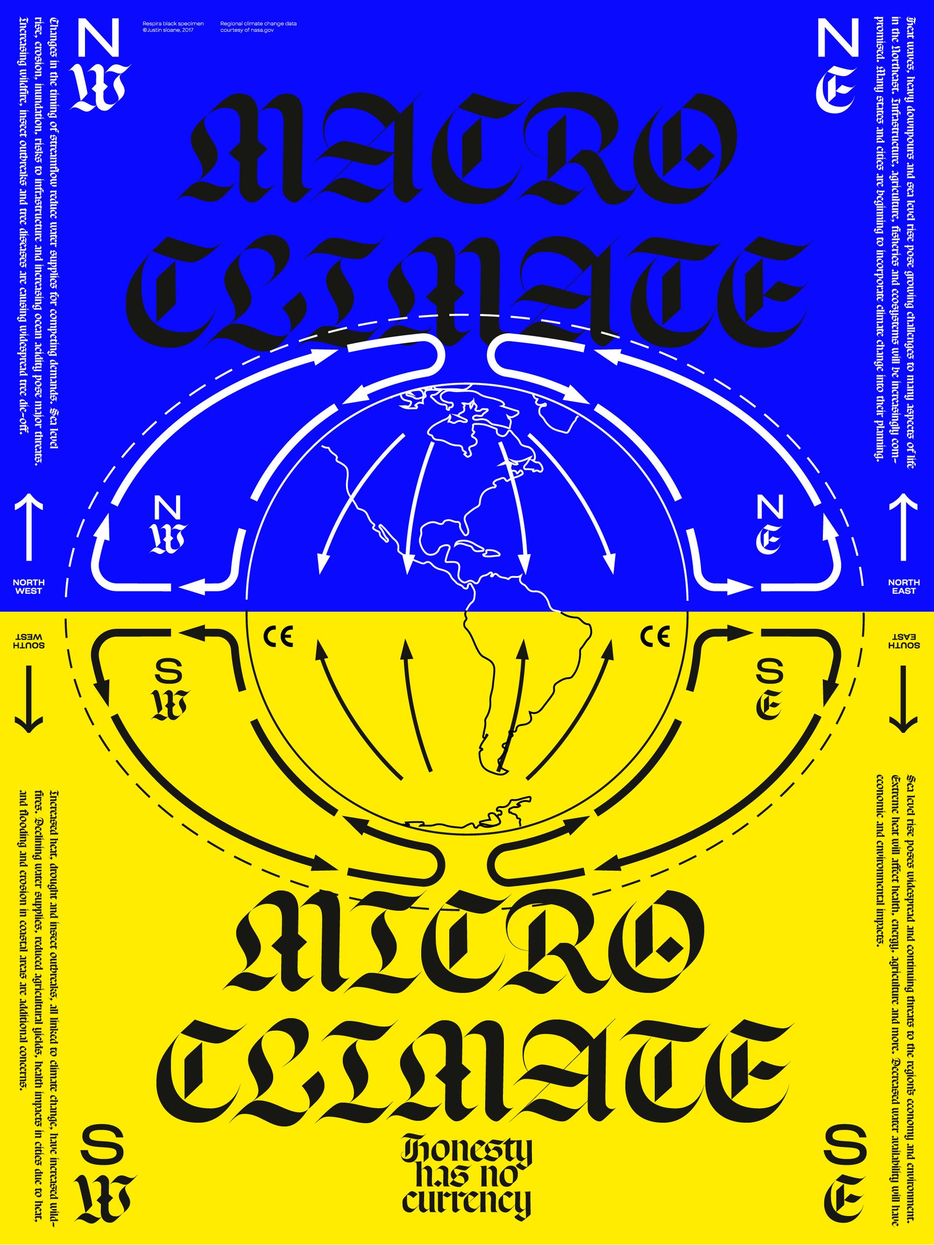 We are very proud to release Respira, a contemporary blackletter, as all of the proceeds will be donated to the National Resources Defense Council (NRDC). The NRDC is a non-profit organization that fights for environmental preservation and policy change to help save the planet and everything living on it. To promote its release we worked with two guest designers on a 'Respira’ poster series about climate change. Keep an eye out for the limited print release of our poster series.