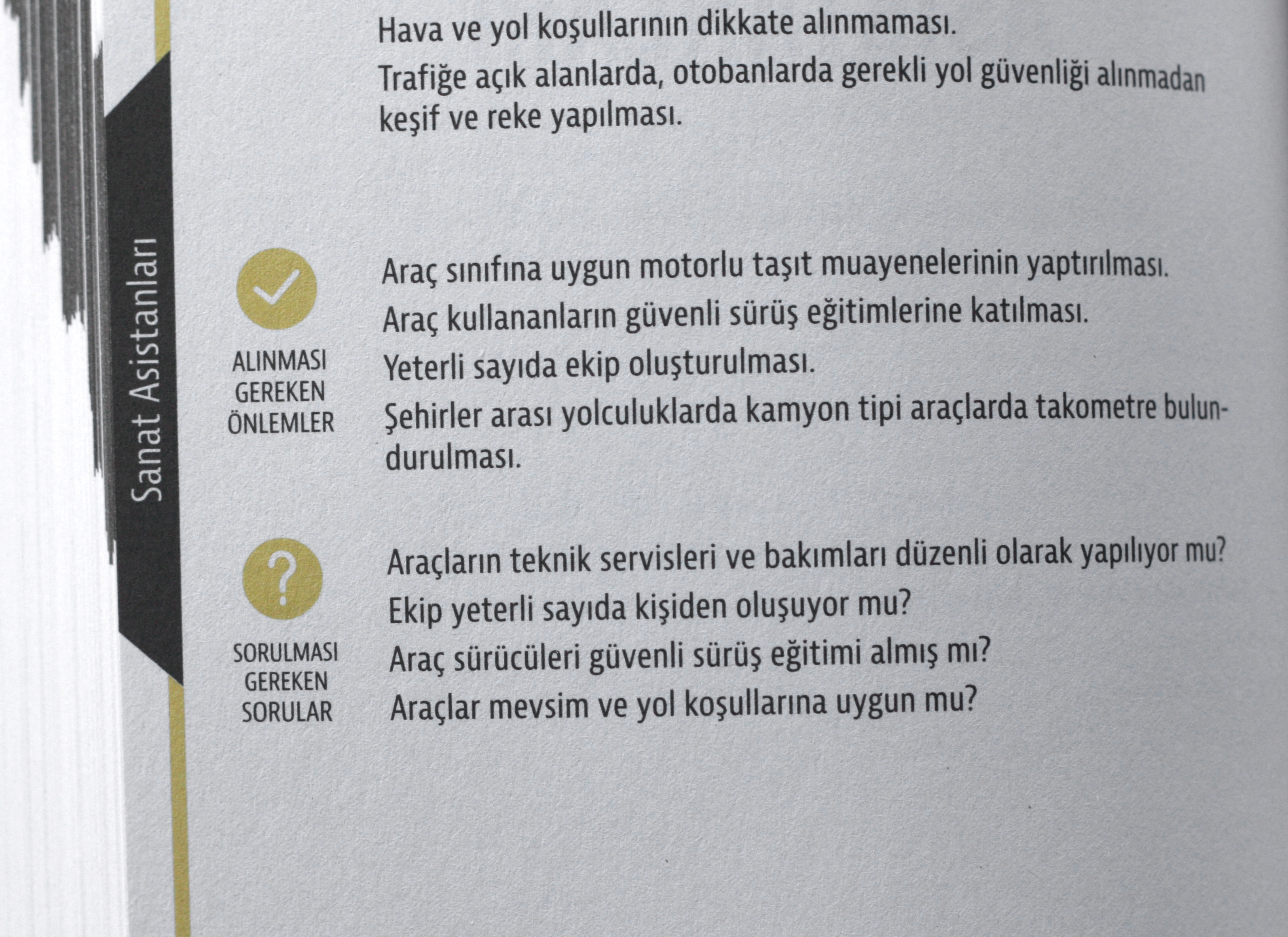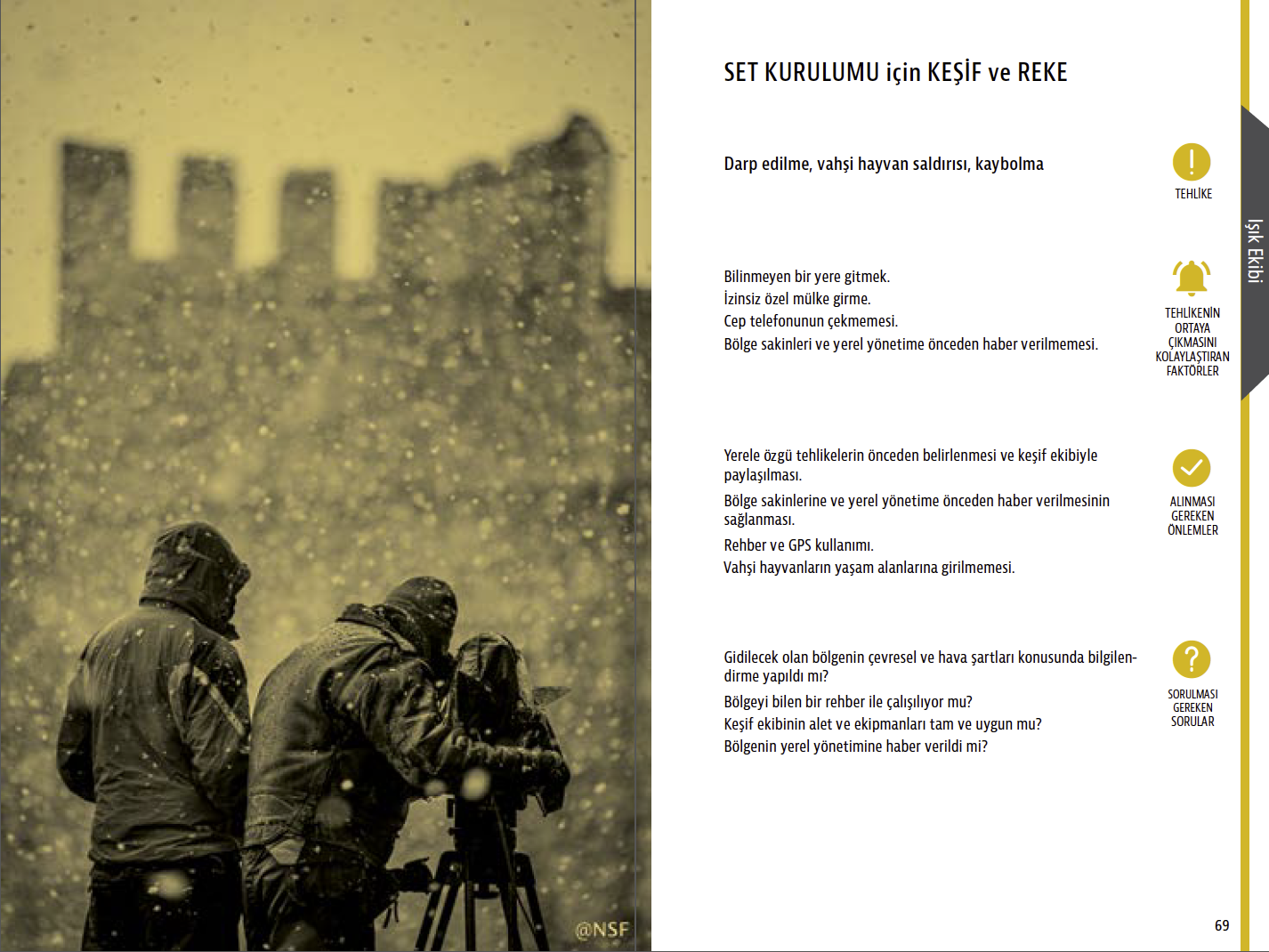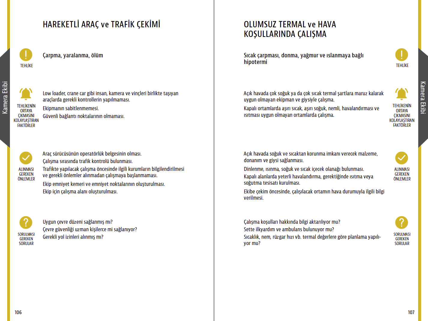 I’ve designed an occupational safety and health reference guide for movie set workers in Turkey. The text is about risks in the workplace. Each page is about a certain task and discusses relevant risks, potential hazards, and precautions, including a checklist.
