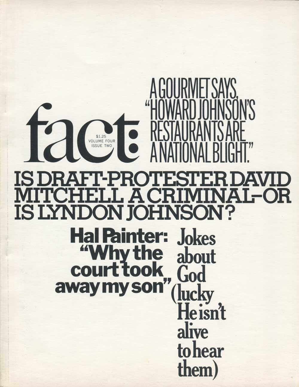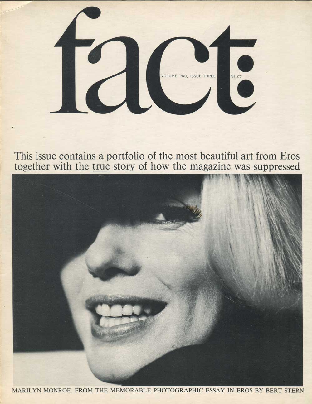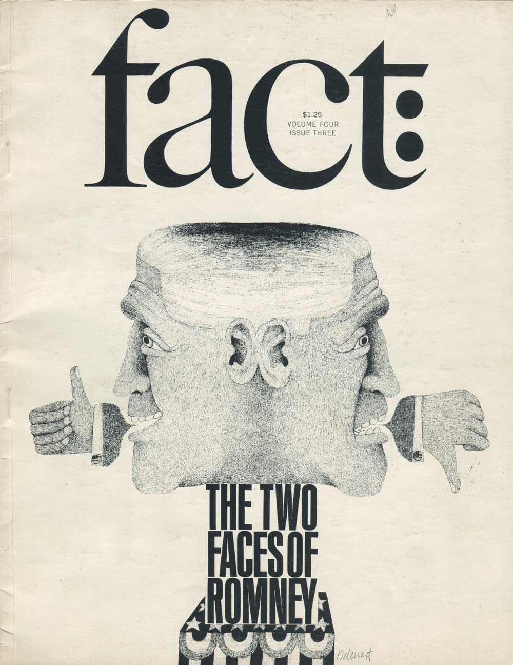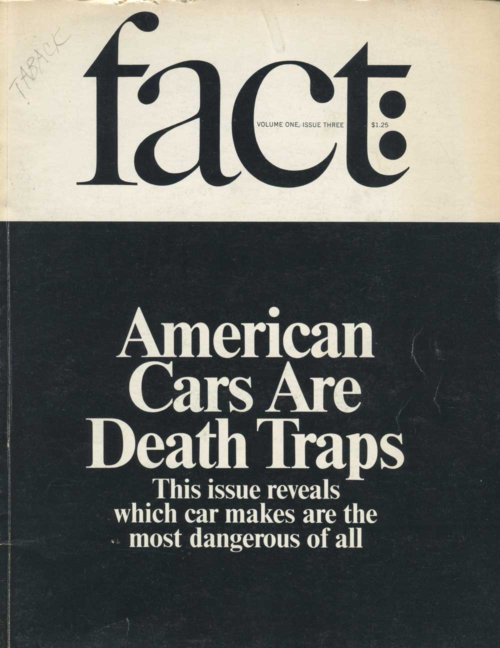 Shortly after being sentenced to jail time for the Eros periodical he started with Herb Lubalin, Ralph Ginzburg launched Fact magazine in 1964, again enlisting Lubalin as art director. Fact focused largely on political issues and was known for its scathingly satirical takedowns of everyone from Bobby Kennedy to Reader’s Digest to the entire American automobile industry (a young Ralph Nader contributed research on that topic). One issue focusing on the mental fitness of conservative presidential candidate Barry Goldwater even led to a lawsuit and eventually the closure of the publication.