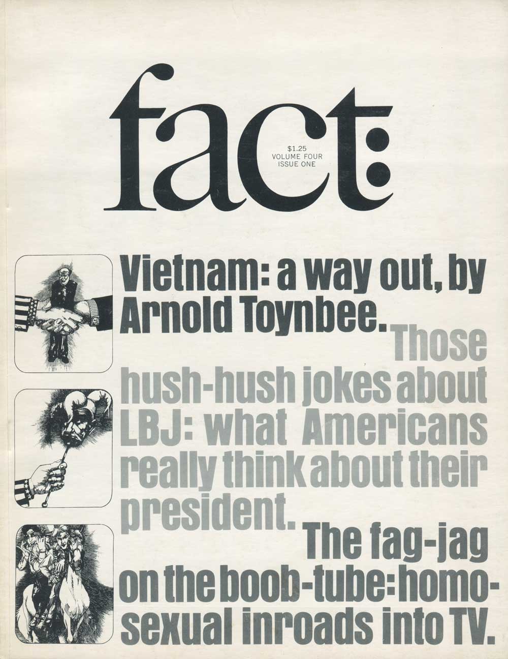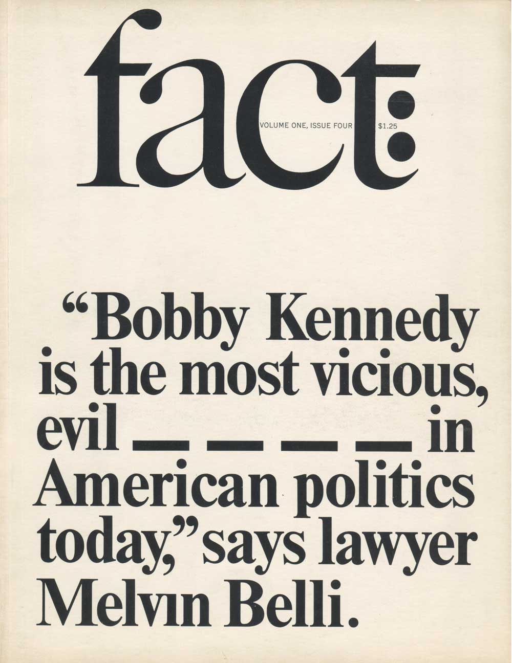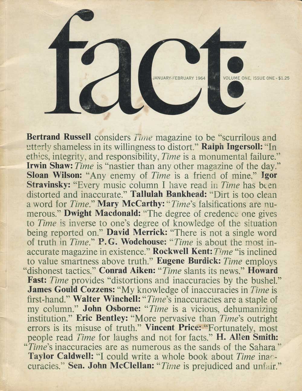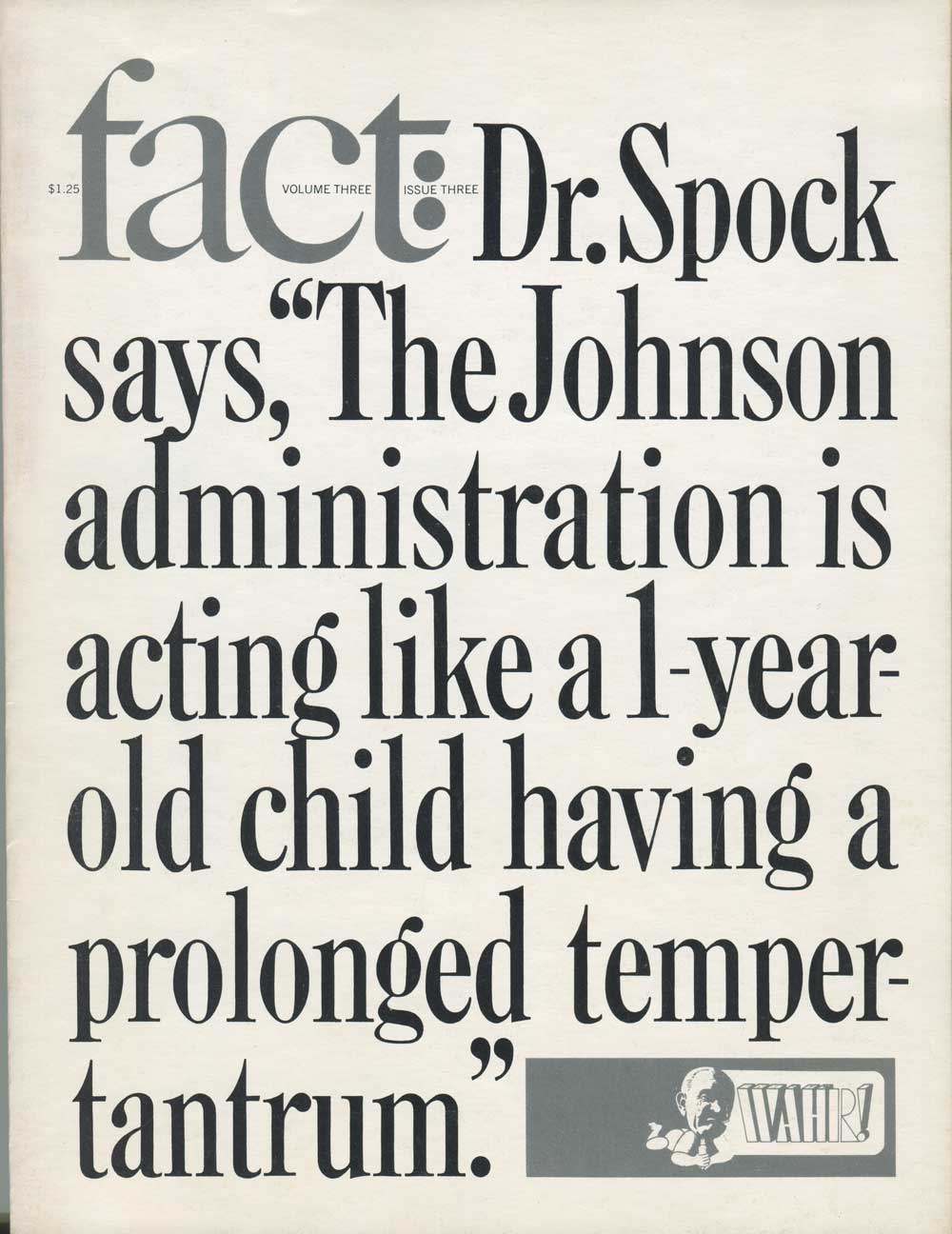 Shortly after being sentenced to jail time for the Eros periodical he started with Herb Lubalin, Ralph Ginzburg launched Fact magazine in 1964, again enlisting Lubalin as art director. Fact focused largely on political issues and was known for its scathingly satirical takedowns of everyone from Bobby Kennedy to Reader’s Digest to the entire American automobile industry (a young Ralph Nader contributed research on that topic). One issue focusing on the mental fitness of conservative presidential candidate Barry Goldwater even led to a lawsuit and eventually the closure of the publication.