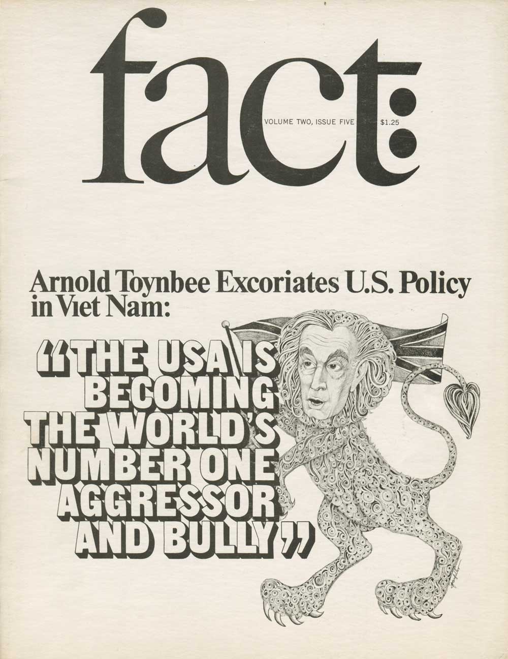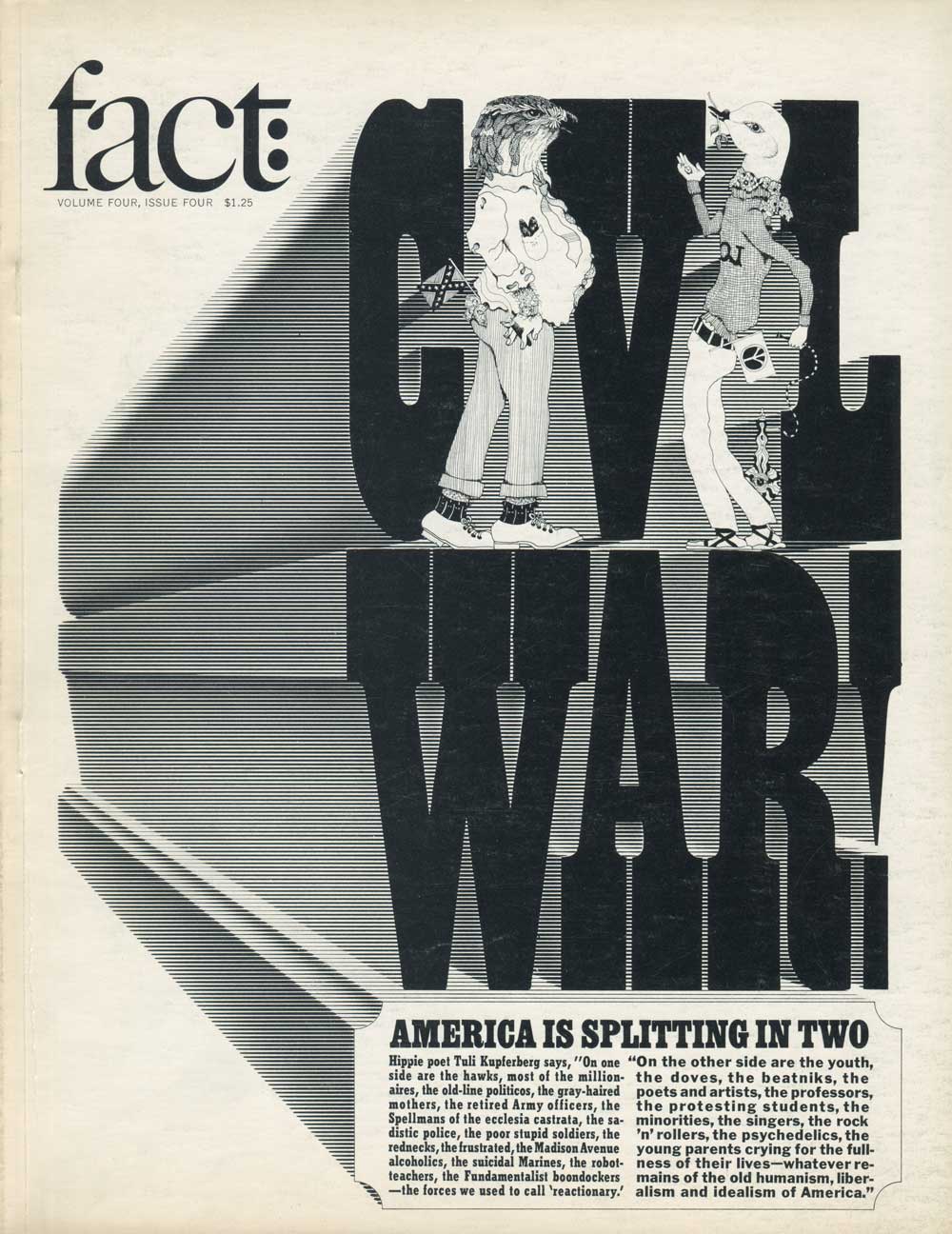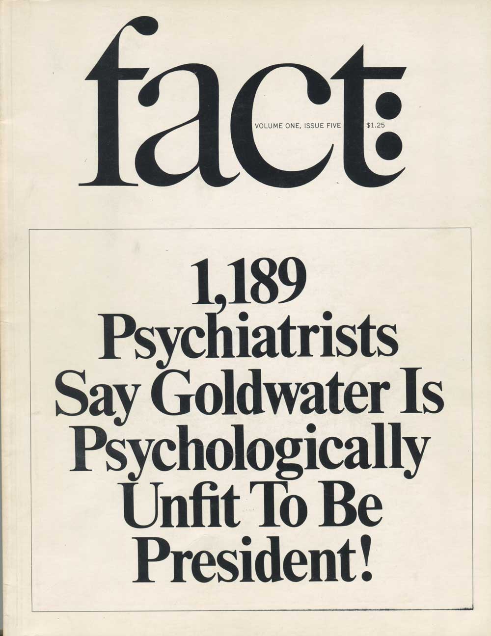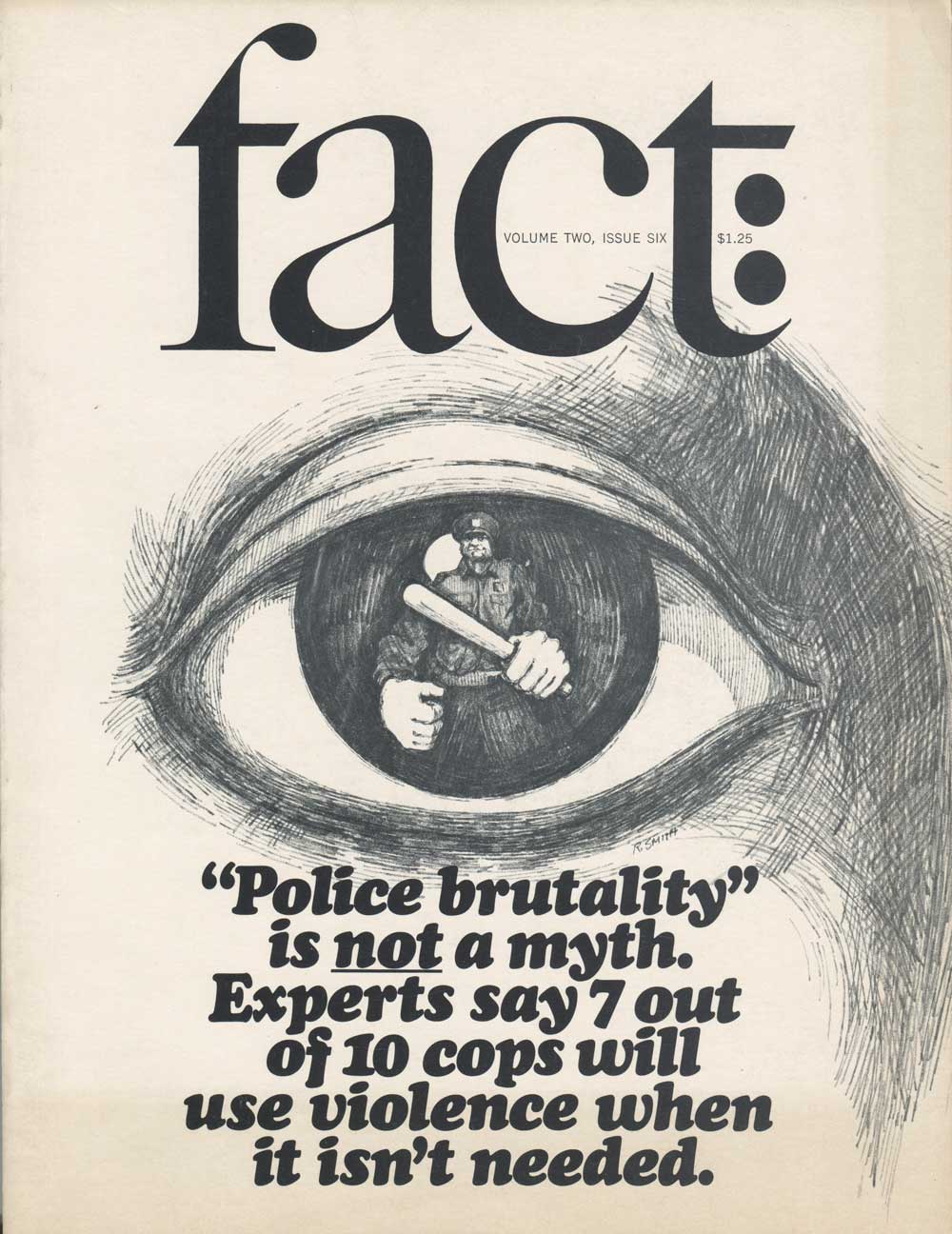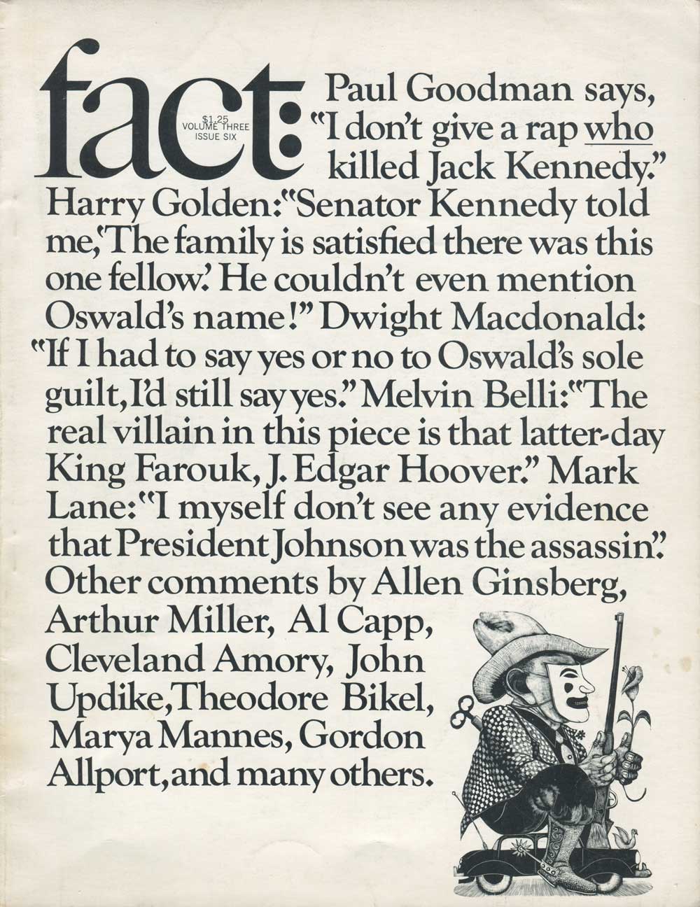 Shortly after being sentenced to jail time for the Eros periodical he started with Herb Lubalin, Ralph Ginzburg launched Fact magazine in 1964, again enlisting Lubalin as art director. Fact focused largely on political issues and was known for its scathingly satirical takedowns of everyone from Bobby Kennedy to Reader’s Digest to the entire American automobile industry (a young Ralph Nader contributed research on that topic). One issue focusing on the mental fitness of conservative presidential candidate Barry Goldwater even led to a lawsuit and eventually the closure of the publication.