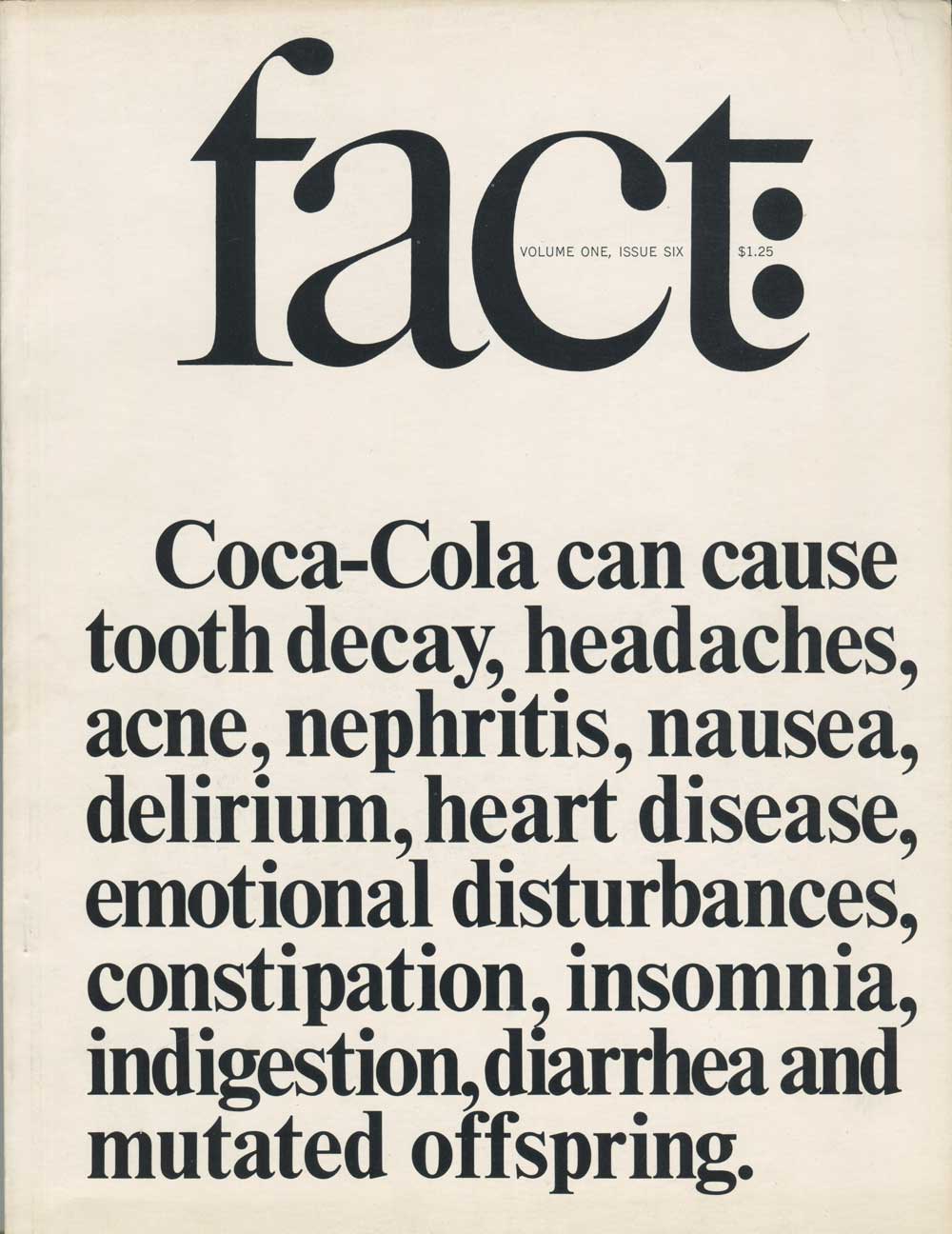 Economy was essential for the magazine’s budget, so Lubalin chose a small black and white format. The inside layout was a simple, quiet, two-column grid of Times Roman. The tone however was set by the striking, bold and text-only covers. Lubalin understood that Fact magazine was all about the attitude, and as a great art director knew when design should take a step back.