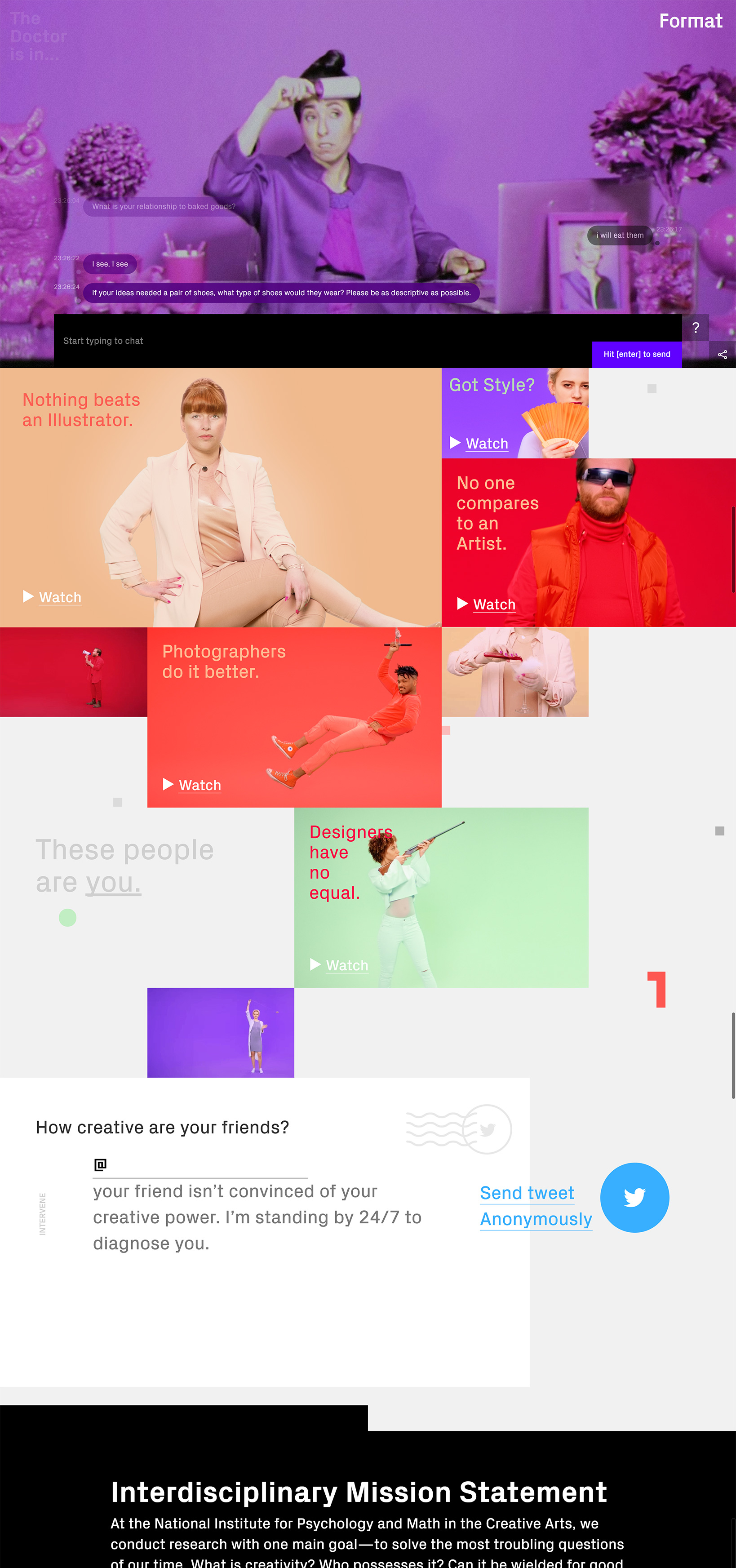 Its campaign (at sobetter.org) brings this message to life via a tongue-in-cheek collection of videos showcasing why “Creative Minds Do It Better”. The cheeky shorts feature illustrators, photographers, designers, artists, and fashion professionals. Together with the videos comes Format’s newest chatbot, Dr. Luova Dahl, who helps you identify the type of creative mind you possess.