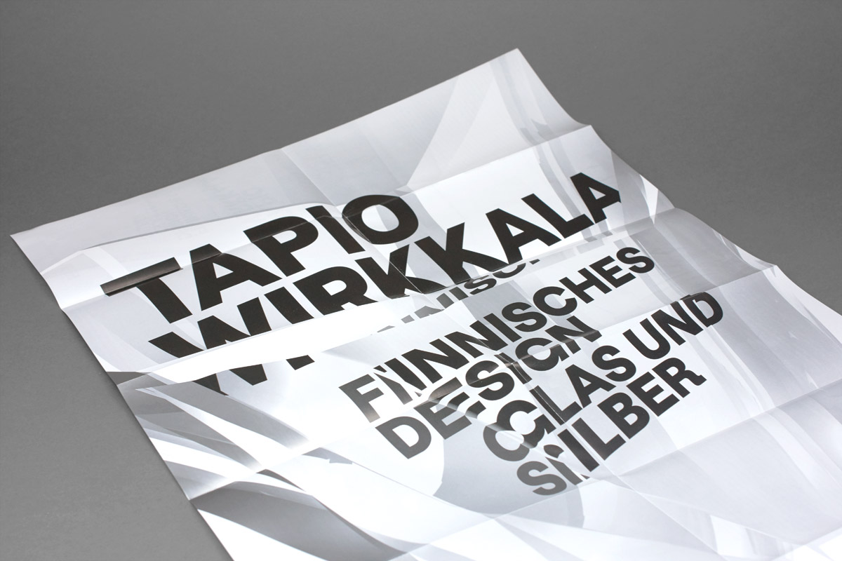 For this exhibition, German studio Happy Little Accidents developed a three-dimensional visualization of a glass based on one of Wirkkala’s emblematic vases. This 3D object interacts with the Proto Grotesk typeface and, through refraction and reflection, highlights the peculiarities of this material. Furthermore, some of the prints, such as A1 posters, flyers and invitation cards, were printed in black and silver tones, in order to echo the materiality of the glass.