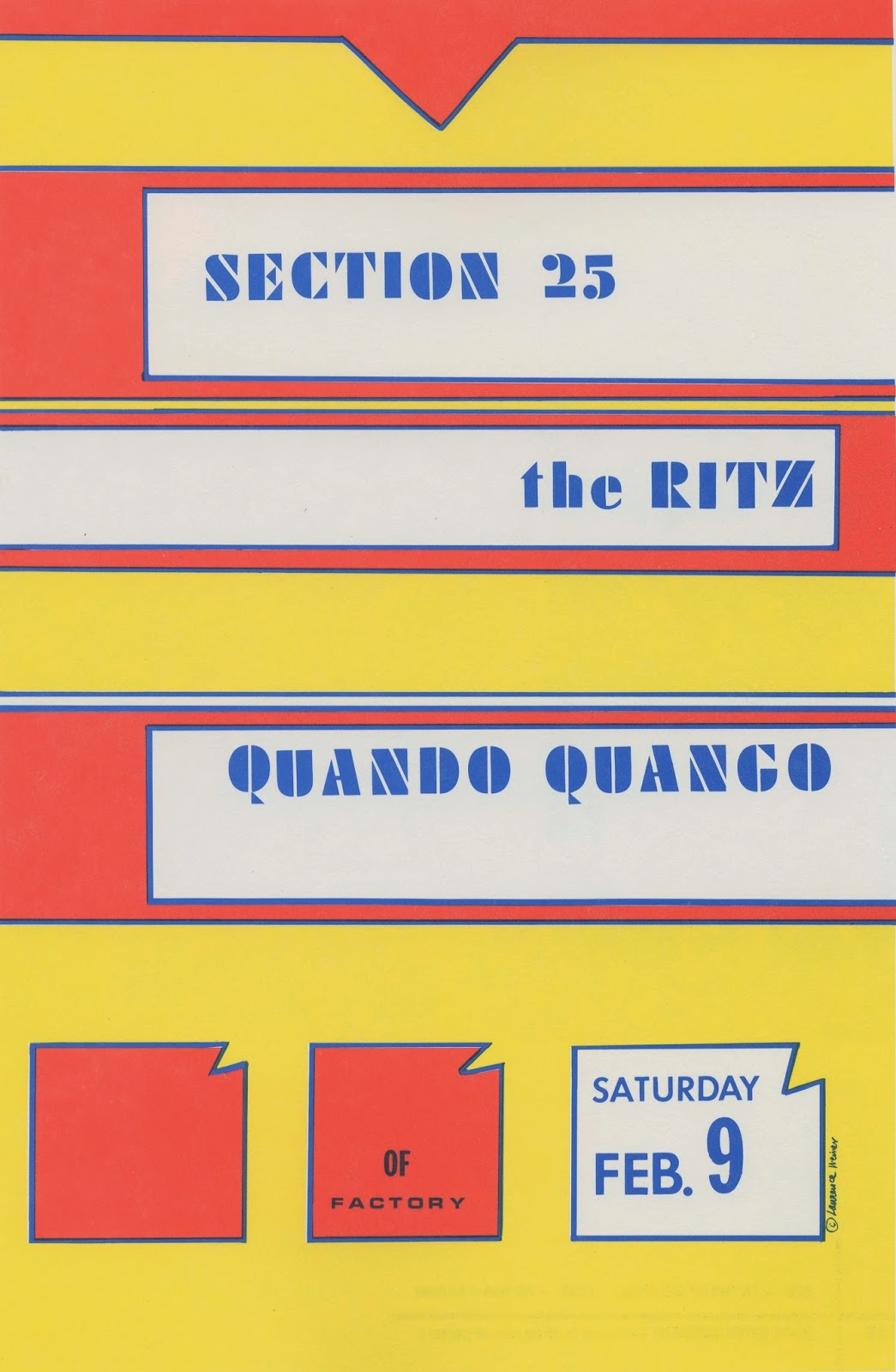 Poster by Lawrence Weiner for a concert with Factory Records artists Section 25 and Quando Quango. Judging by the bouncy text alignment, the design appears to have been composed at least partially with dry-transfer lettering or a similar manual process.
