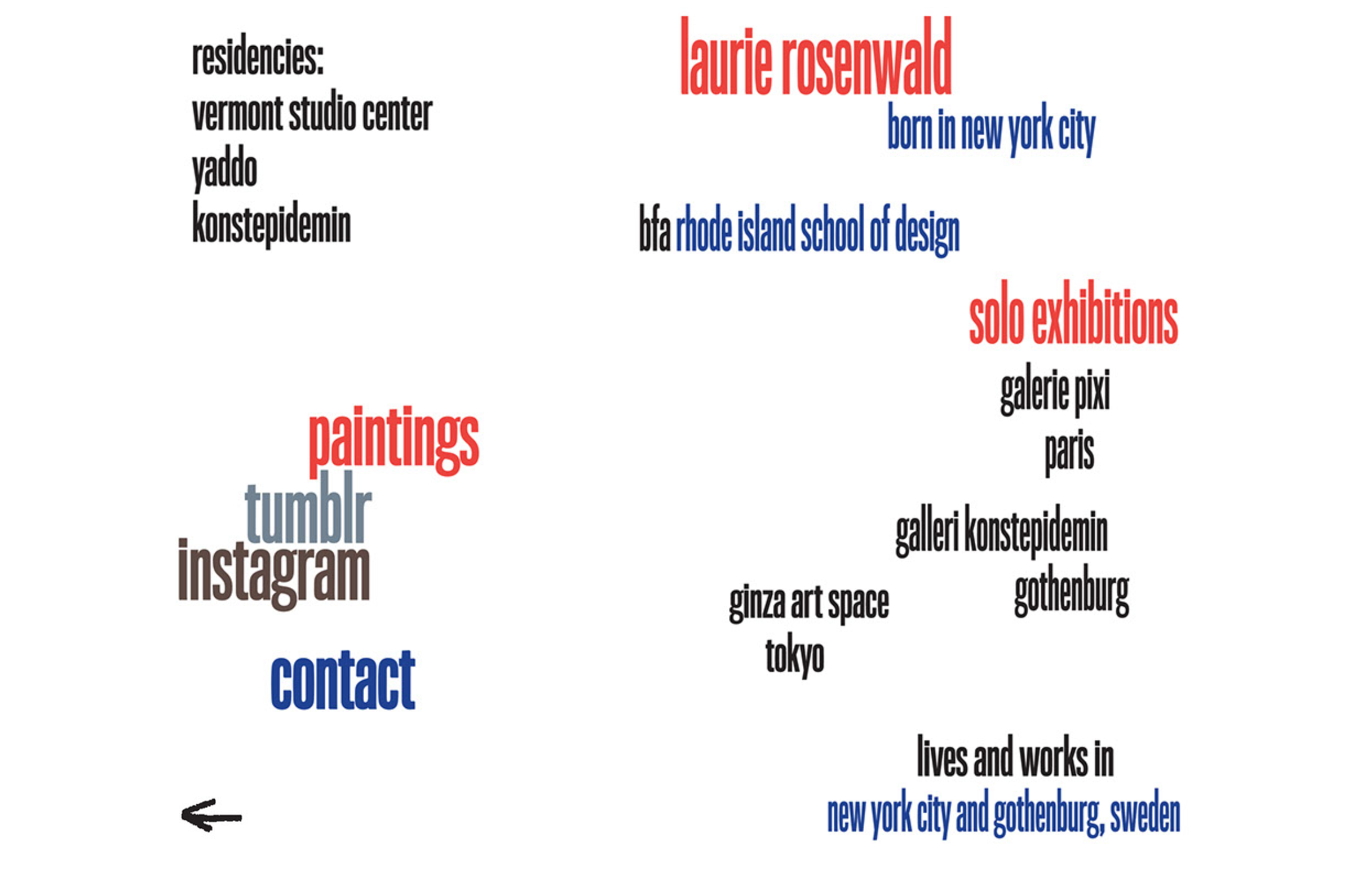 A site dedicated to the paintings of Laurie Rosenwald (who also happens to be the co-creator of the typeface Loupot). The type on the last line of the homepage has its bottom chopped off – perhaps unintentionally – but it fits with Rosenwald’s paper-cut aesthetic.